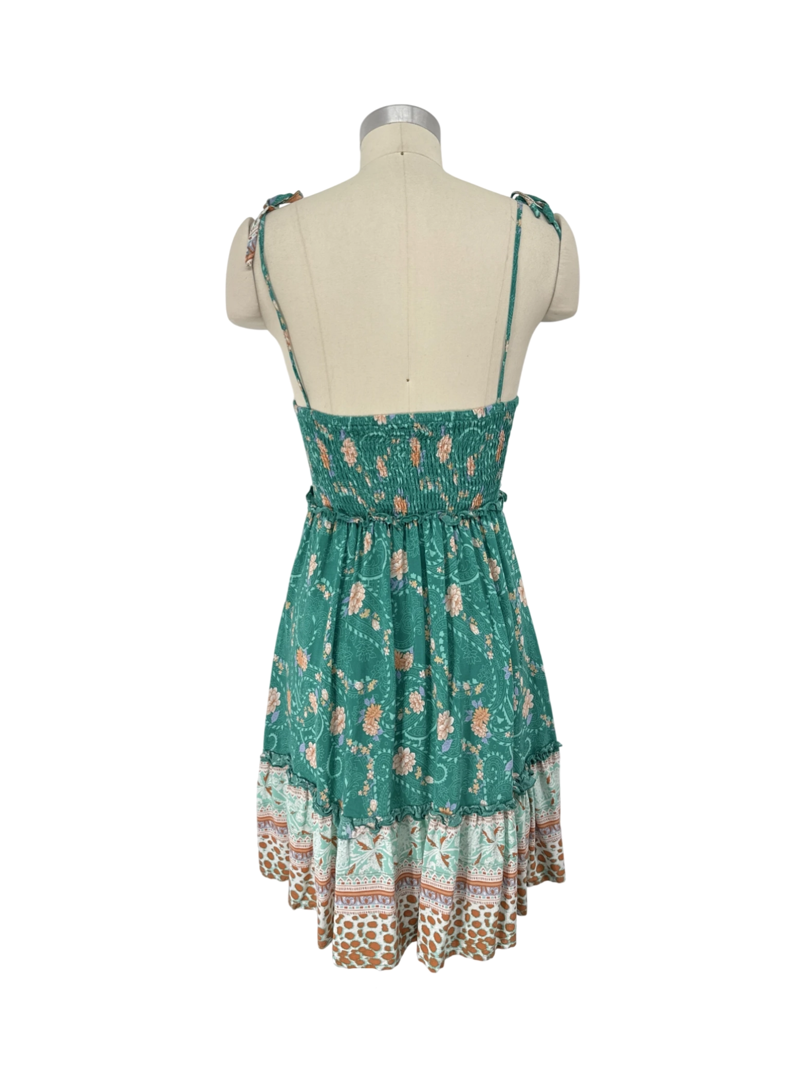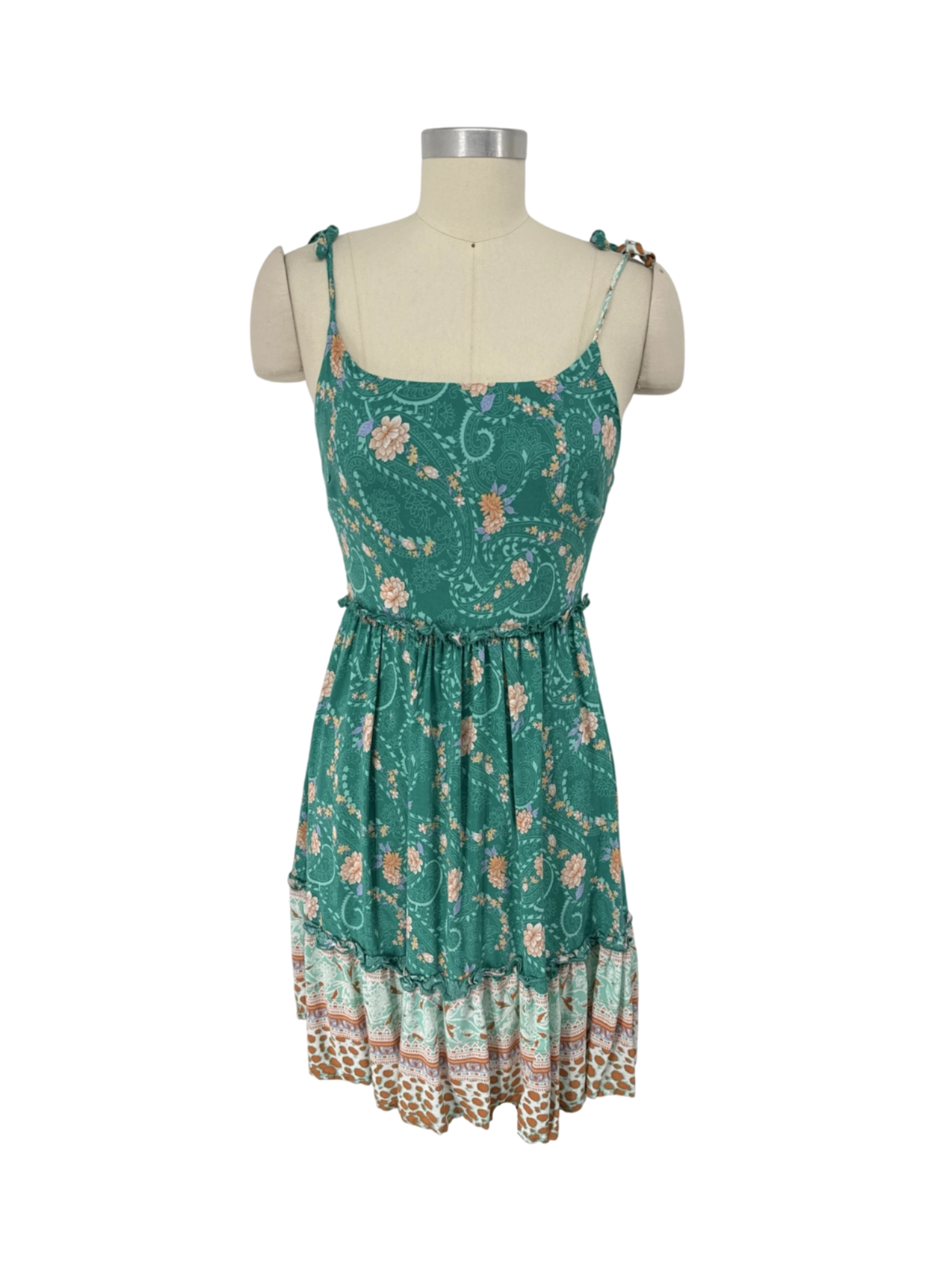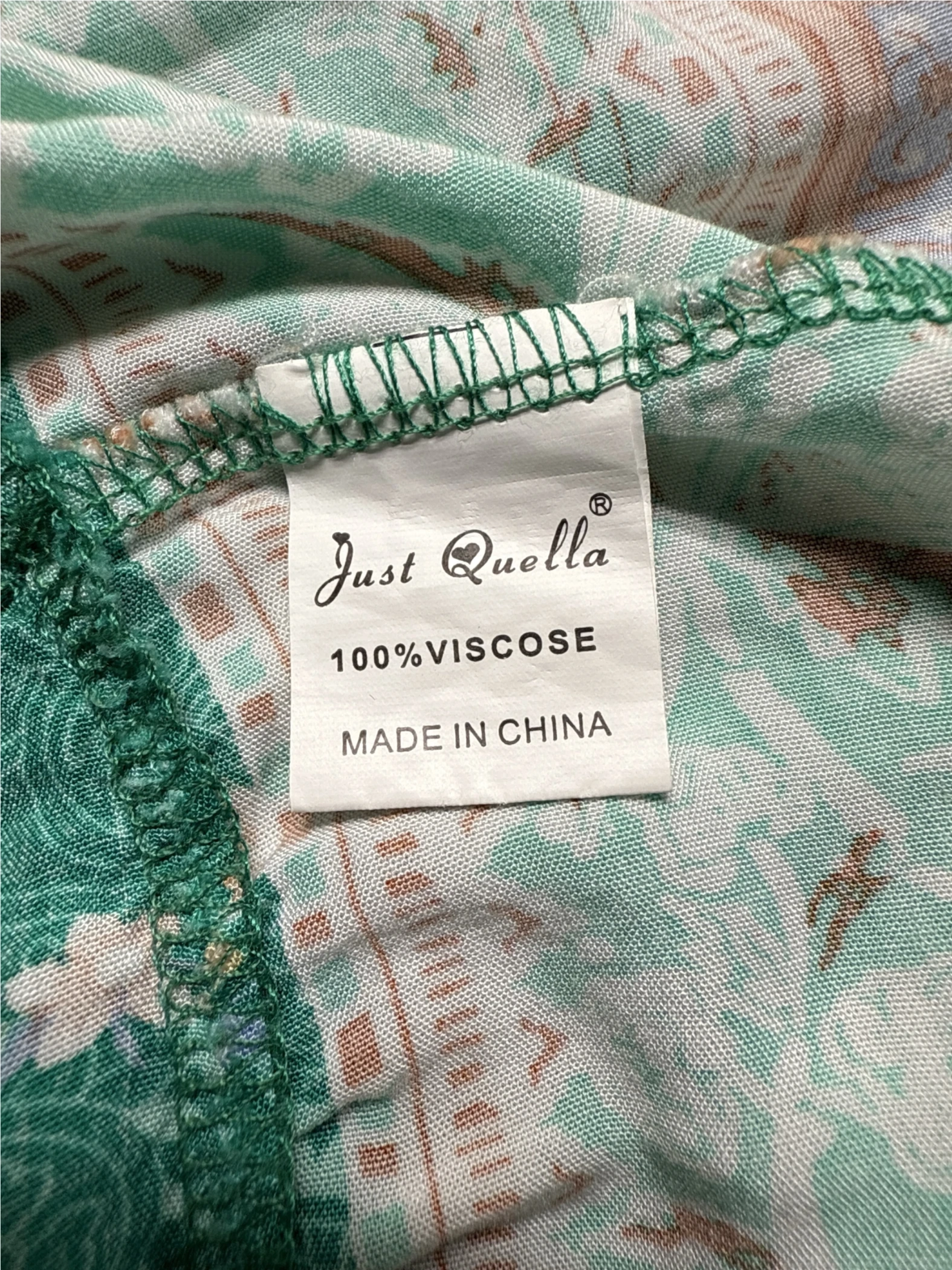 This pre-owned Just Quella dress is a beautiful and vibrant piece. It features a fresh green base adorned with a lovely floral and paisley pattern, perfect for spring and summer. The A-line silhouette and mini skirt length give it a playful and flattering shape. Made from 100% Viscose, this dress is light, comfortable, and ideal for casual outings, parties or a picnic. Add a touch of floral elegance to your wardrobe!