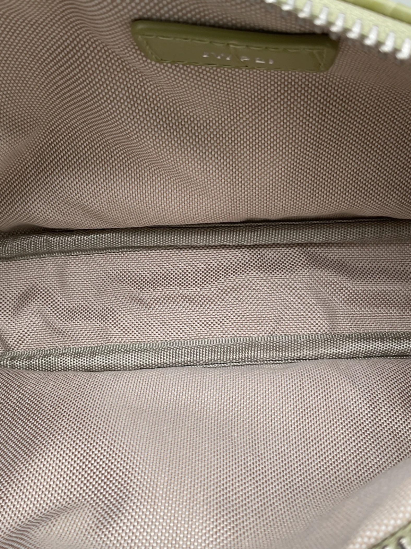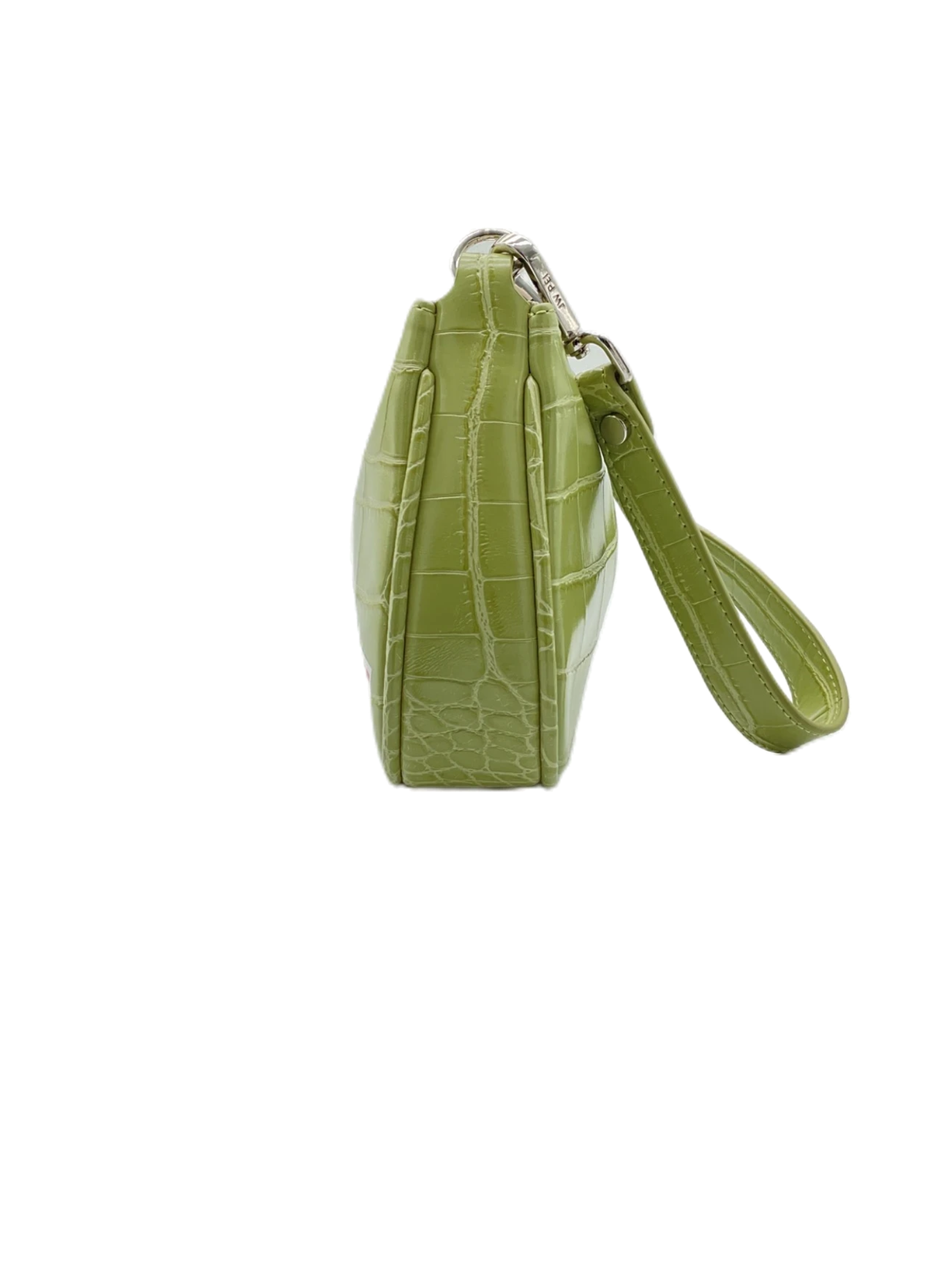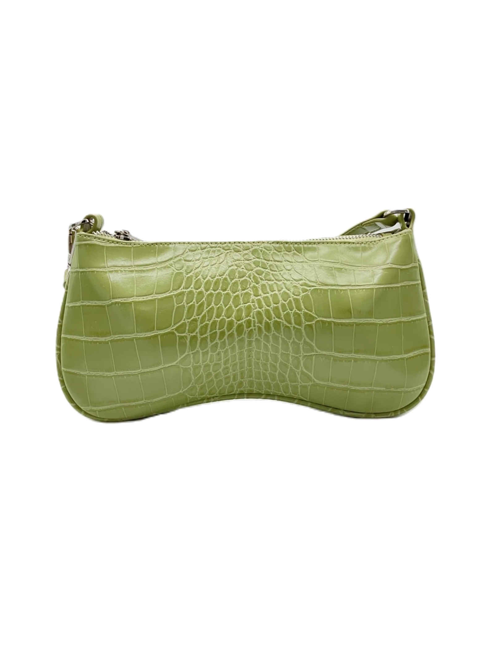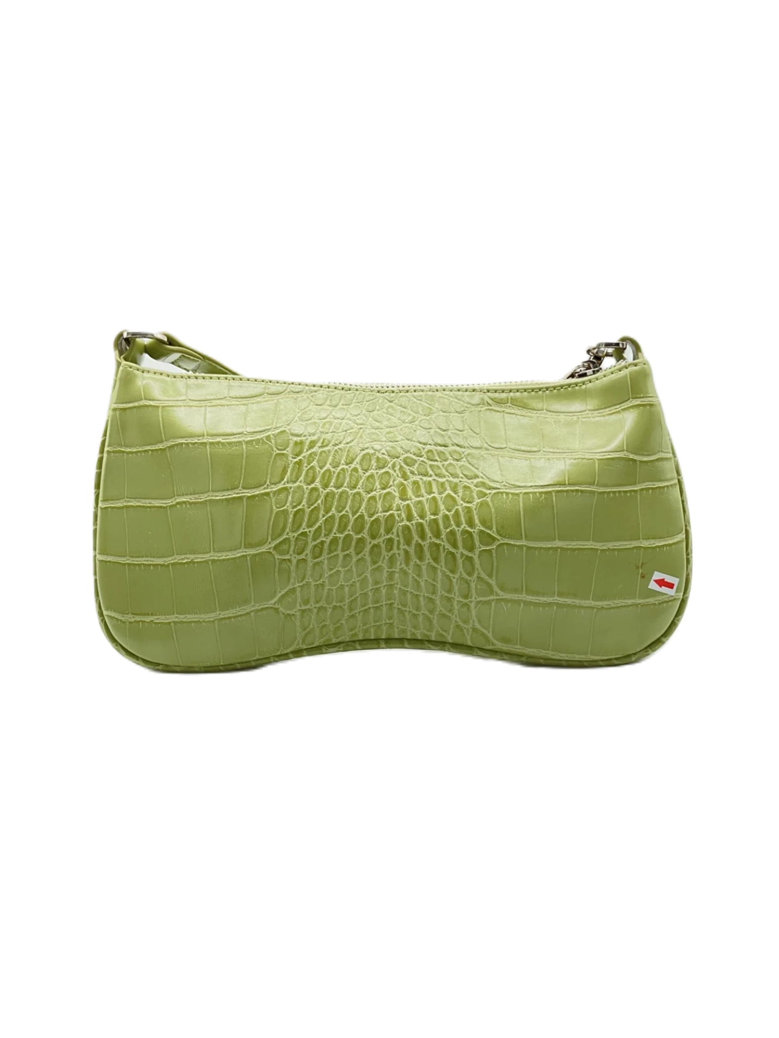 This is an Eva Shoulder Handbag in Sage Green Croc. The handbag has blemishes on the side. Please refer to red arrow in the photo for additional information.