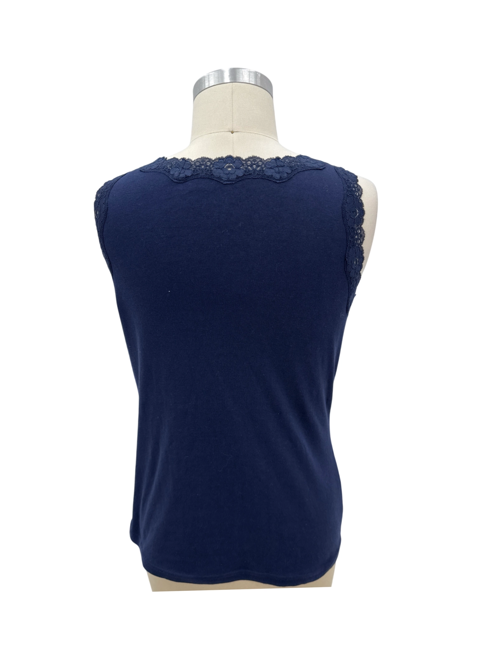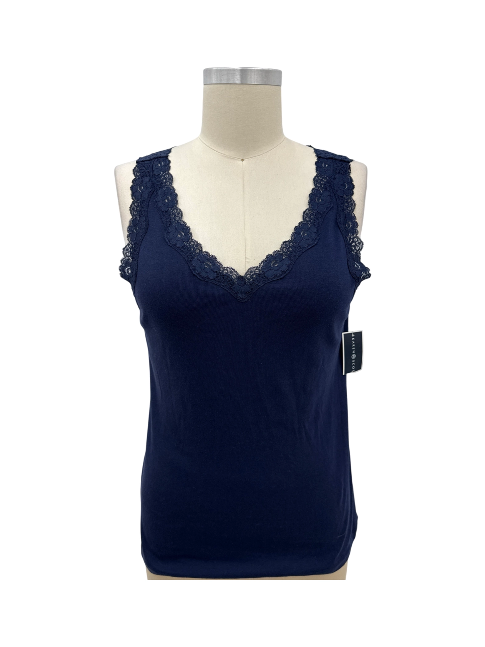 This pre-owned Karen Scott tank top is a versatile addition to any wardrobe. Crafted from soft cotton, it features a flattering V-neck with delicate lace detailing and a sleeveless design. The classic navy blue color makes it easy to pair with various bottoms for a chic and comfortable look. Perfect for warm weather or layering.