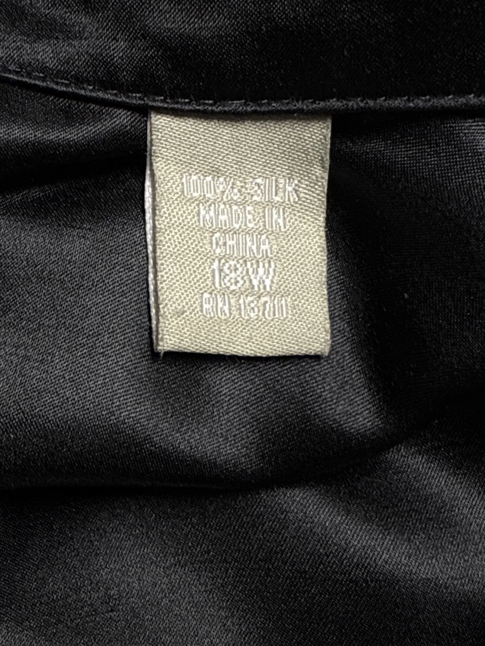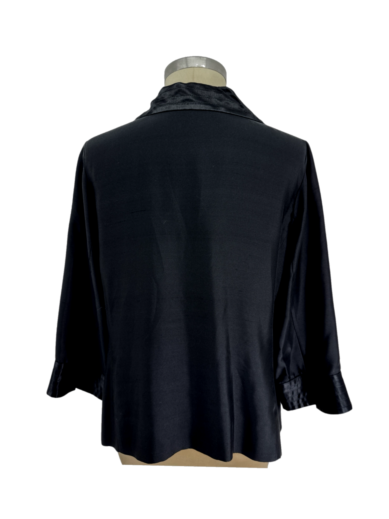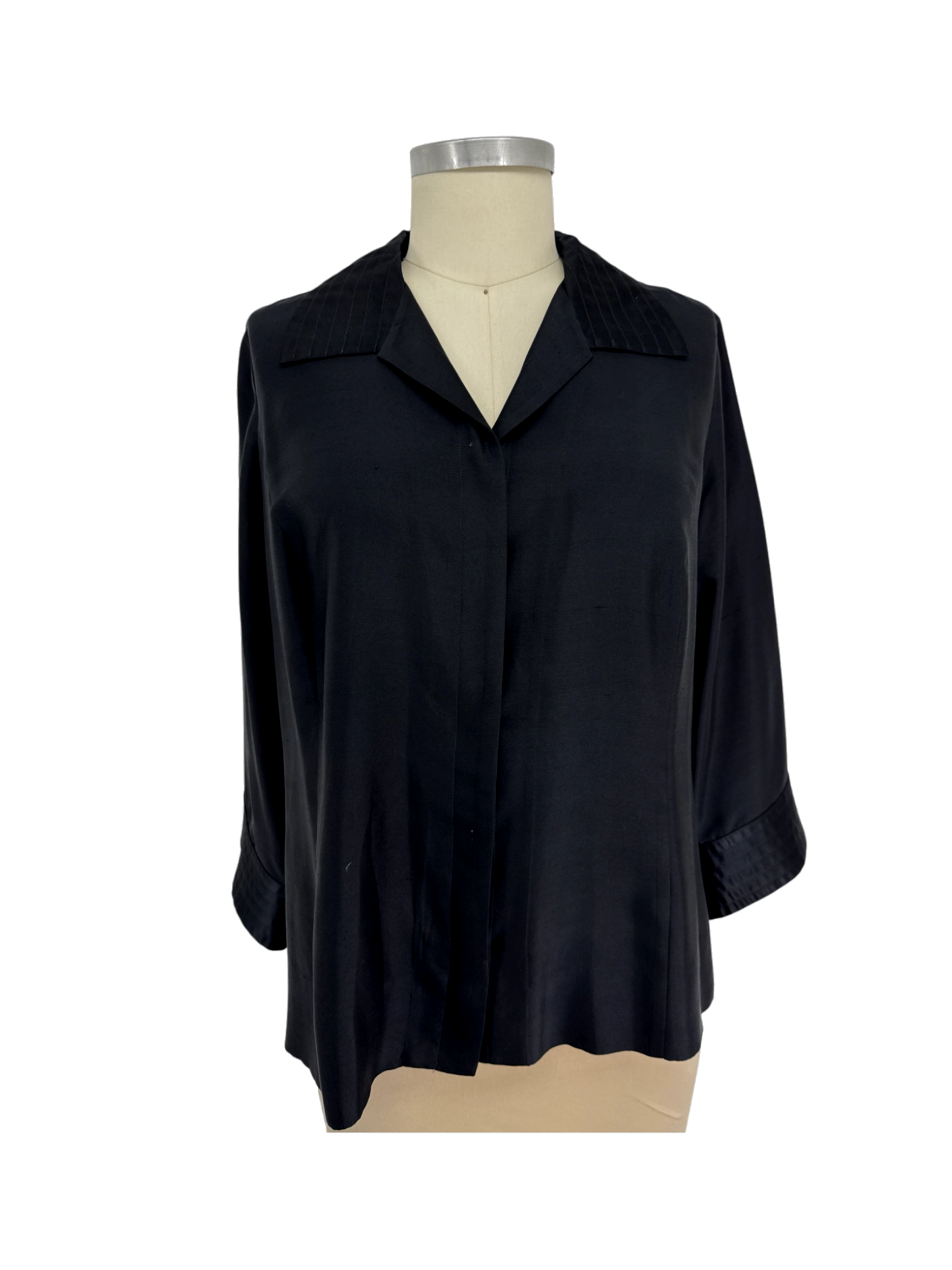 Elevate your wardrobe with this sophisticated KATE HILL blouse. Crafted from luxurious silk, this button-up blouse features a classic collar and a flattering ¾ sleeve, perfect for transitioning between seasons. Its elegant design and versatile black color make it an ideal addition to any outfit, from work attire to evening looks. This pre-owned blouse offers timeless style and comfort, making it a must-have piece for your collection.