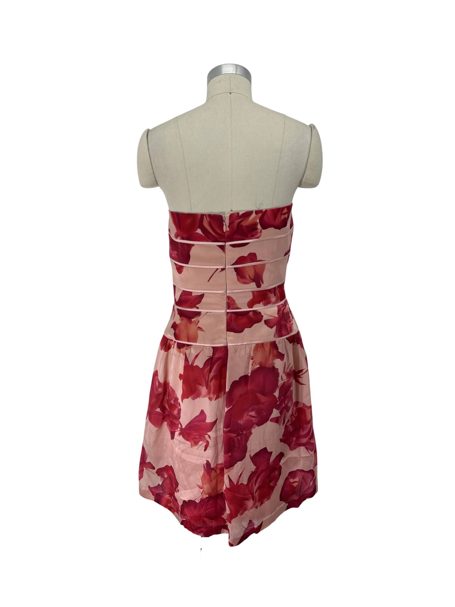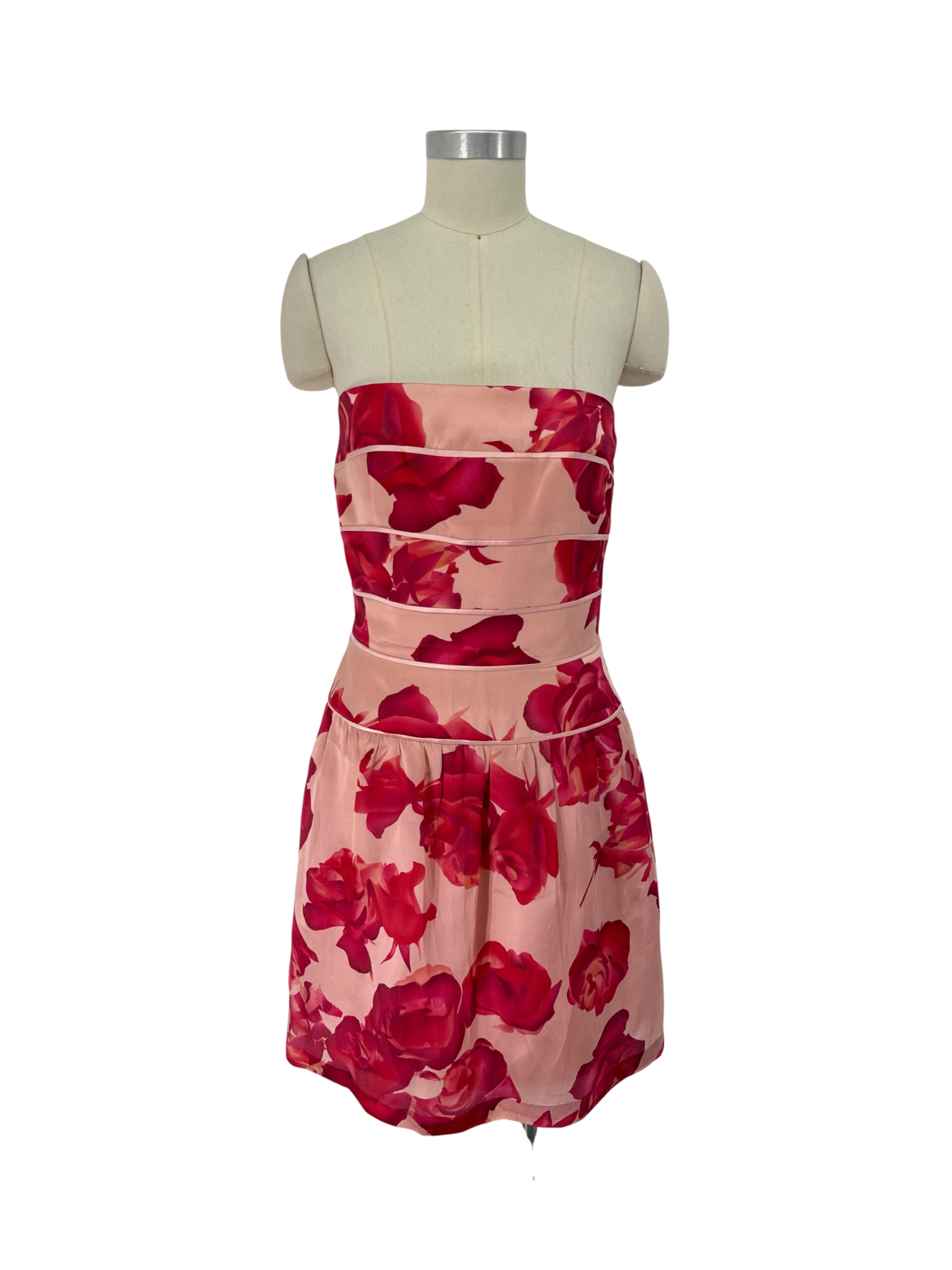 This pre-owned Kay Unger dress is a vibrant statement piece, perfect for your next special occasion. Featuring a beautiful floral print with red roses on a soft pink silk fabric, this mini A-line dress flatters the figure. The strapless design and lightweight material makes it ideal for summer or spring events. Crafted with quality and style, this dress is sure to turn heads.