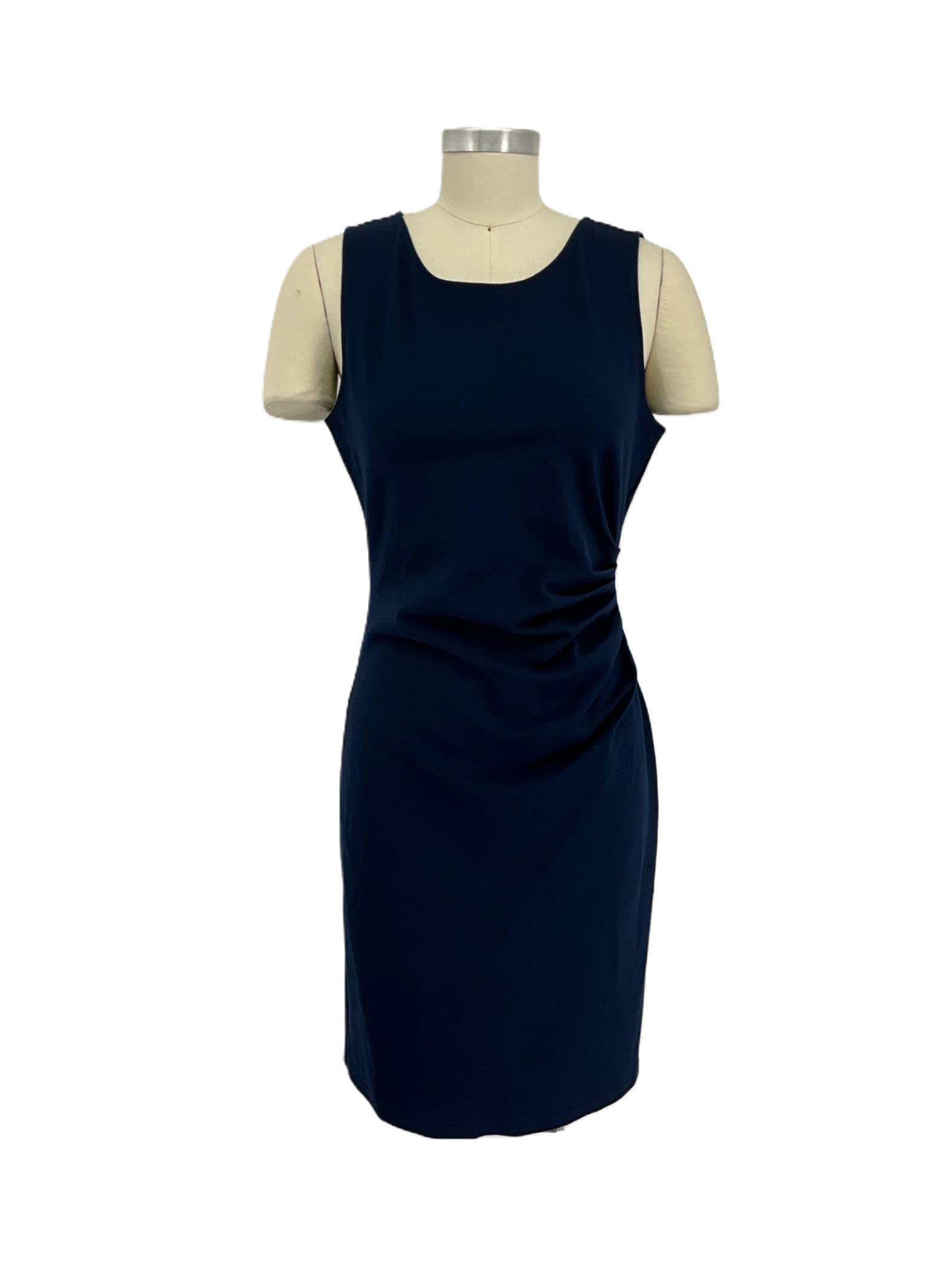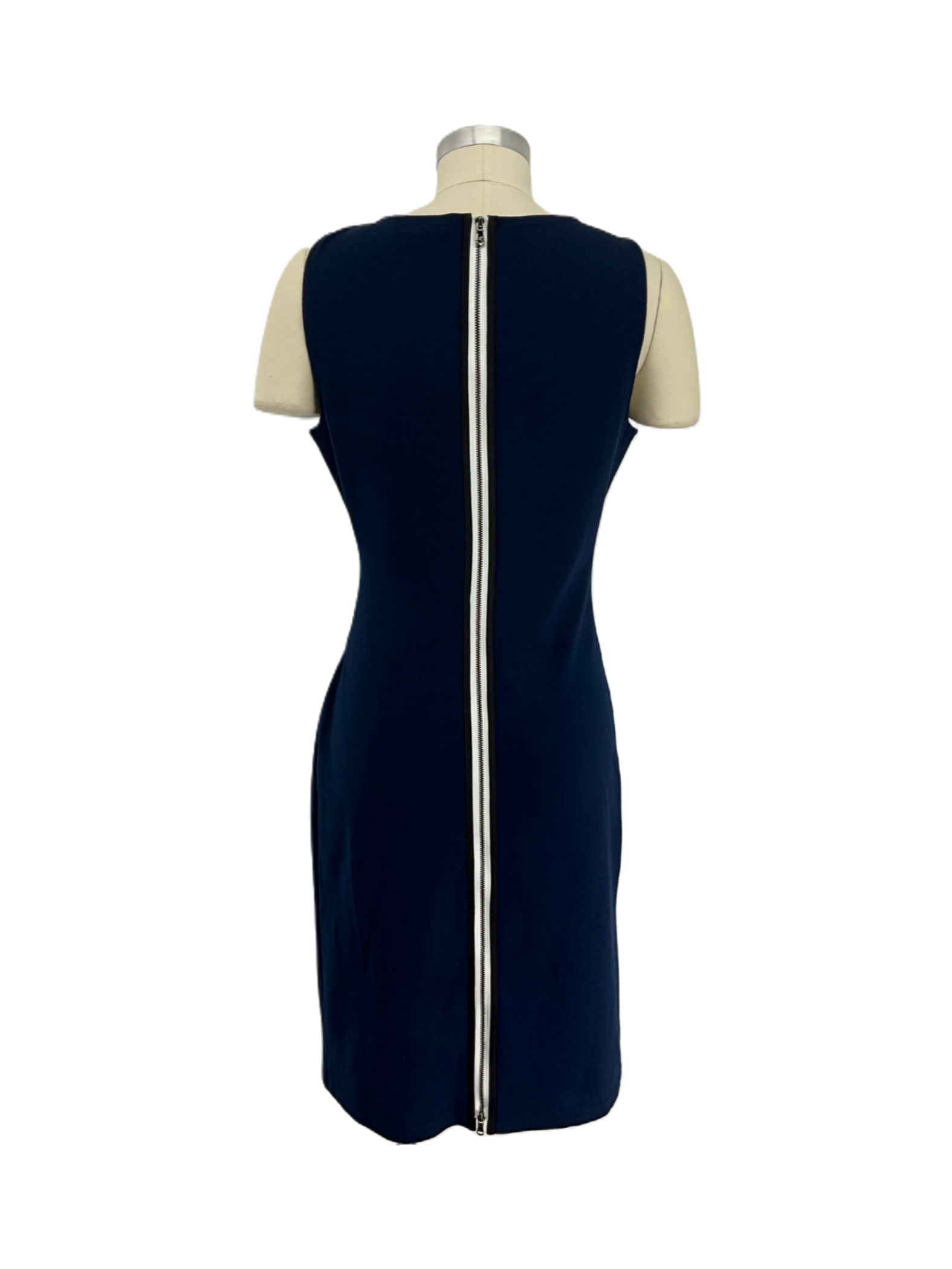 The women's dress is in navy blue color, sleeveless, scoop neck, with a back zipper closure, size 6.
