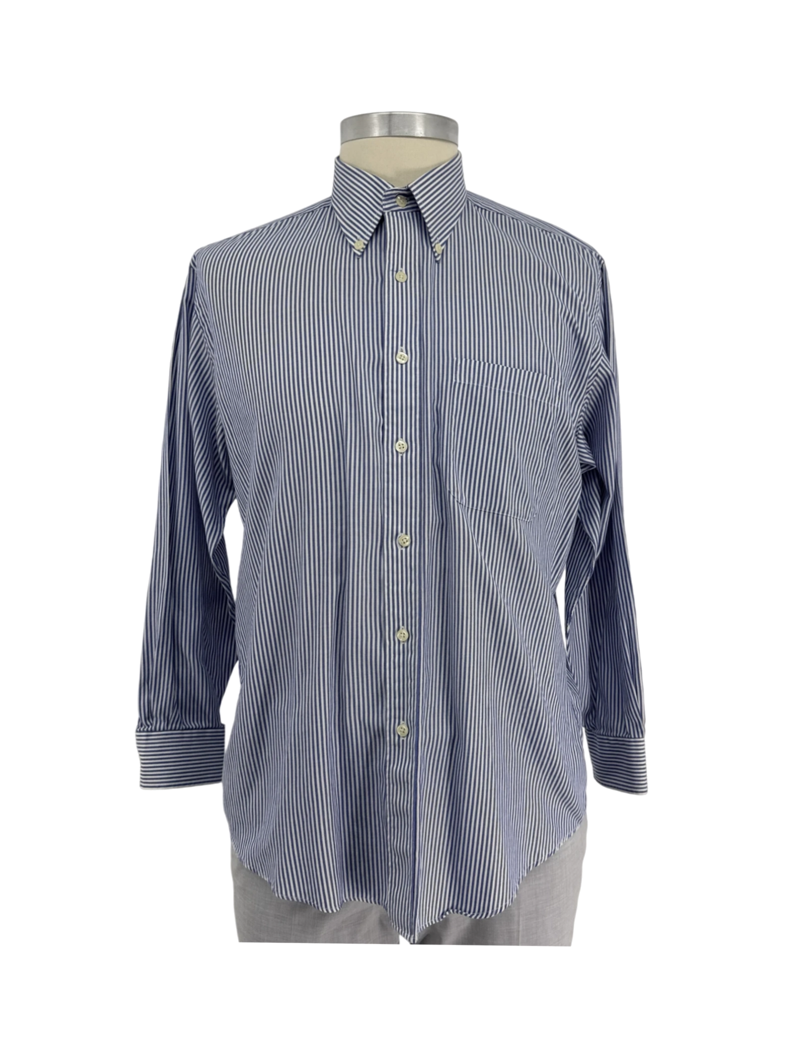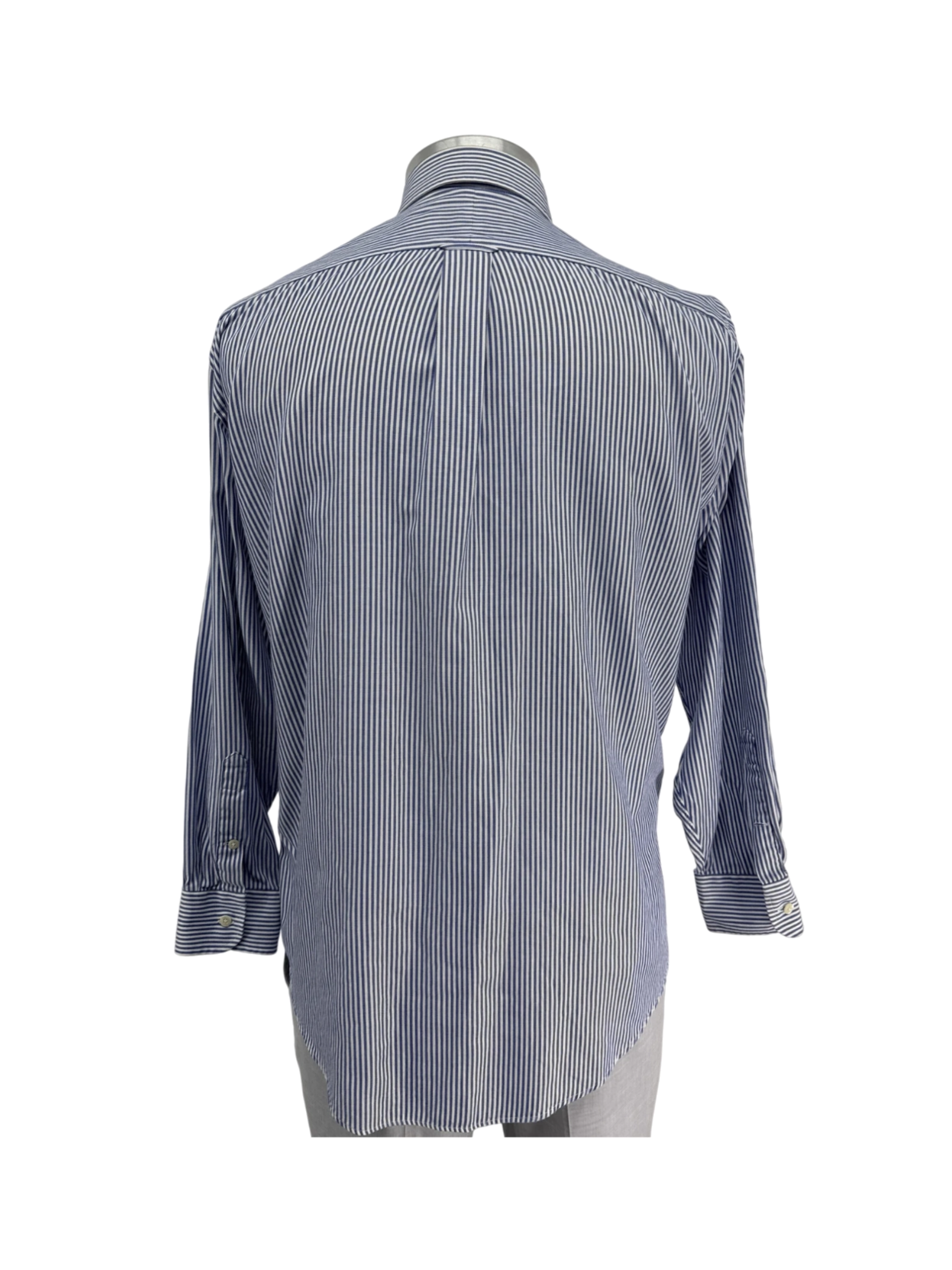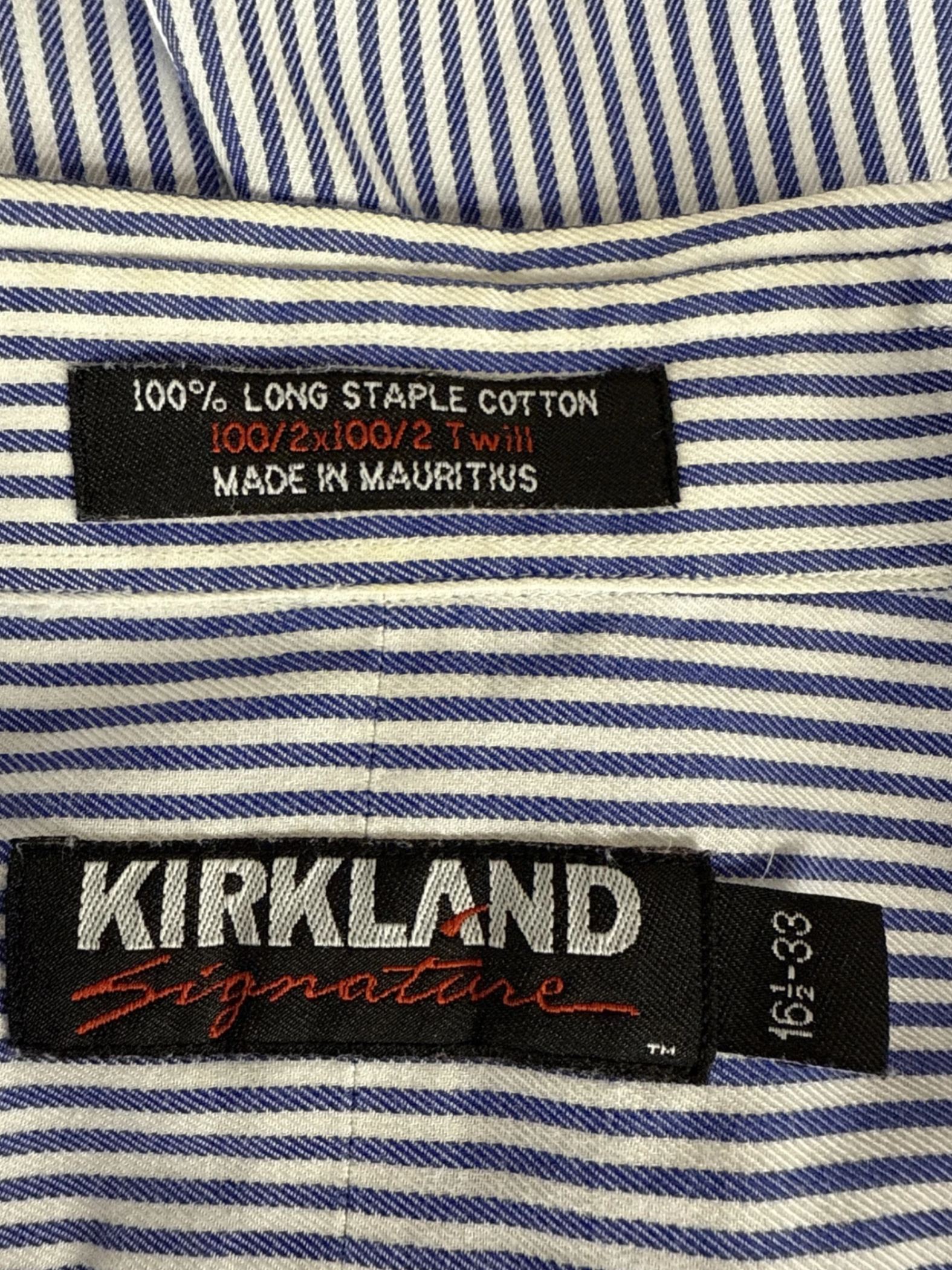 Elevate your wardrobe with this pre-owned Kirkland Signature long sleeve shirt for men. Crafted from 100% long staple cotton, this shirt offers a classic fit and timeless style. Featuring a collared neckline, button-up closure, and a sophisticated stripe pattern in blue and white. This shirt is perfect for adding a touch of elegance to your everyday attire. Ideal for both casual and semi-formal occasions, and offers all-day comfort. This shirt is a great addition to any stylish man's collection.