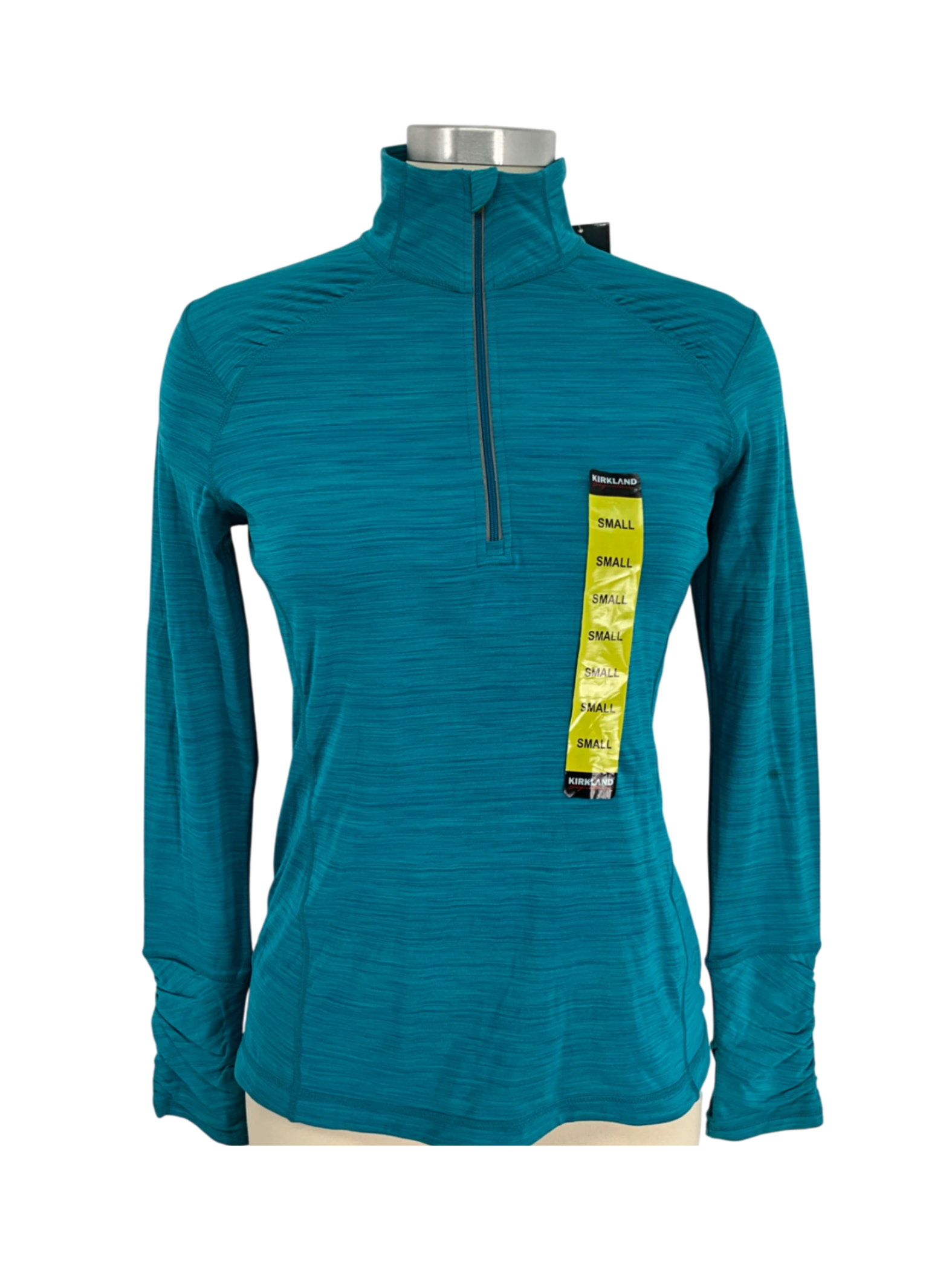 A Kirkland Signature brand activewear track jacket for women in blue, size S, is available.