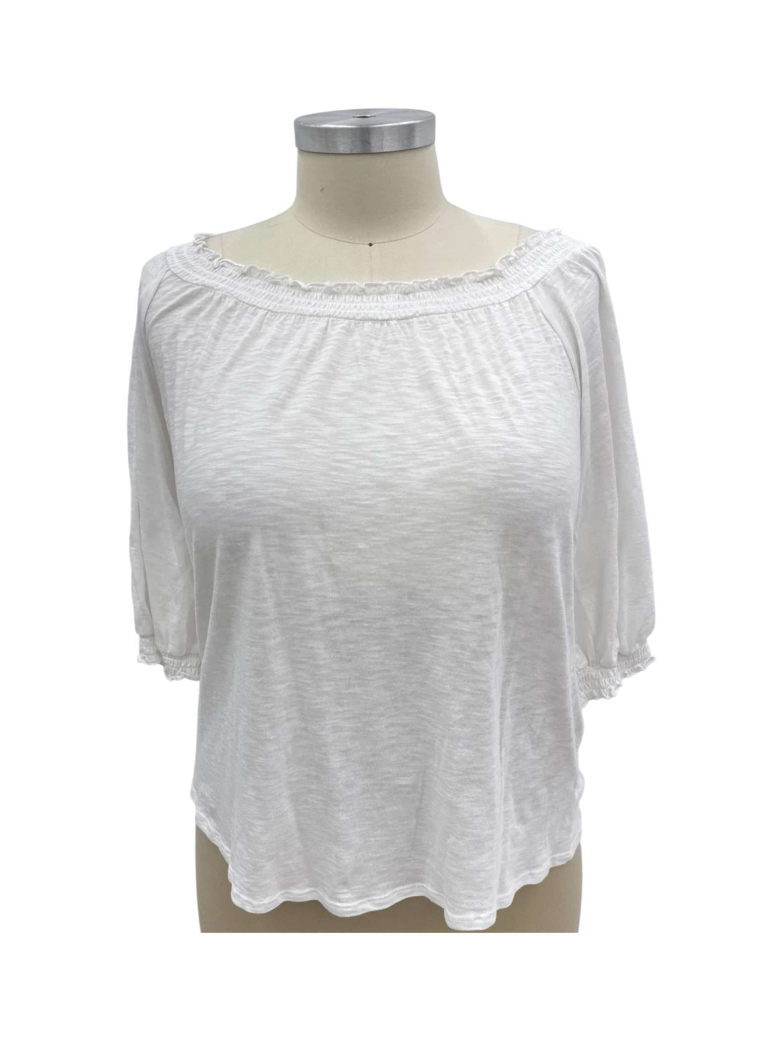 This pre-owned Knox Rose blouse is a stylish addition to any wardrobe. Made from a comfortable cotton and modal blend, this top features an elegant off-the-shoulder neckline and three-quarter sleeves. The white color makes it versatile for any occasion, from casual outings to a summer evening. Perfect for a chic, effortless look, this blouse combines comfort and style seamlessly, offering a flattering fit and easy care. It's an excellent choice for anyone looking for a versatile piece.