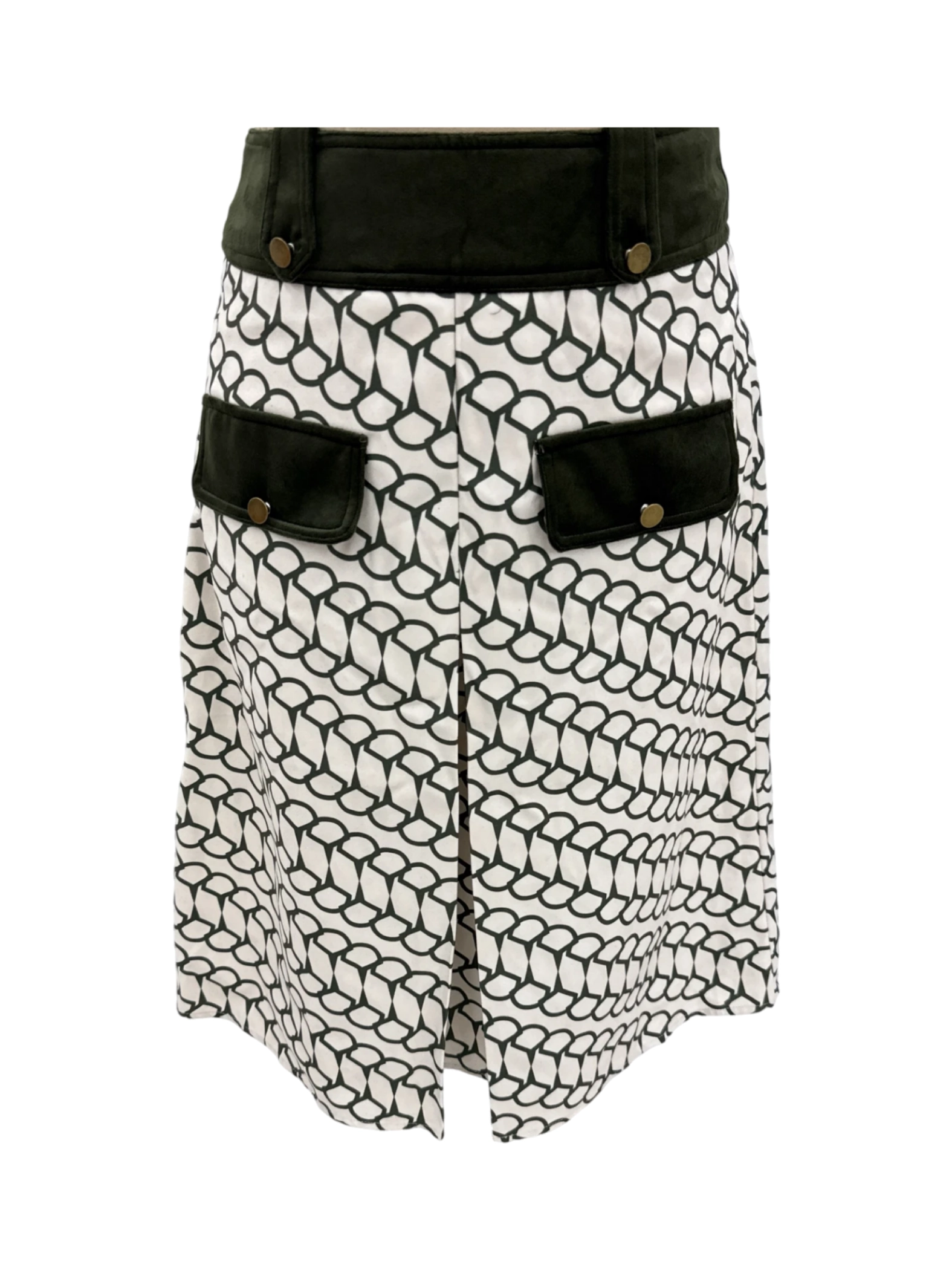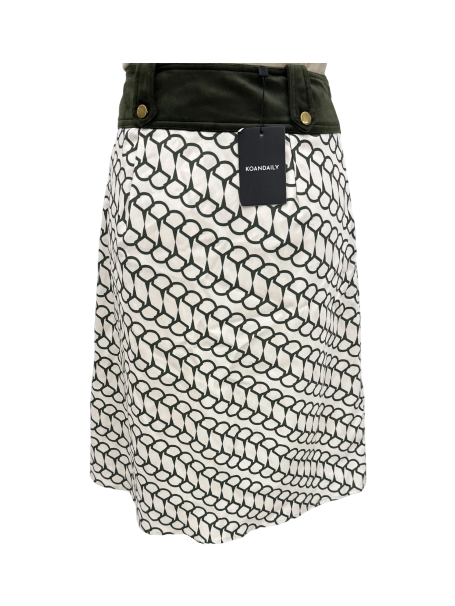 Embrace chic style with this pre-owned KOANDAILY A-line skirt. Featuring a captivating geometric pattern on a white base, this midi skirt is perfect for summer, spring, and fall. Crafted from durable polyester, it offers a comfortable fit in size M. The skirt's design includes unique pocket details, enhancing its appeal for a variety of occasions. This gently worn skirt offers a blend of elegance and practicality, making it a versatile addition to your wardrobe.