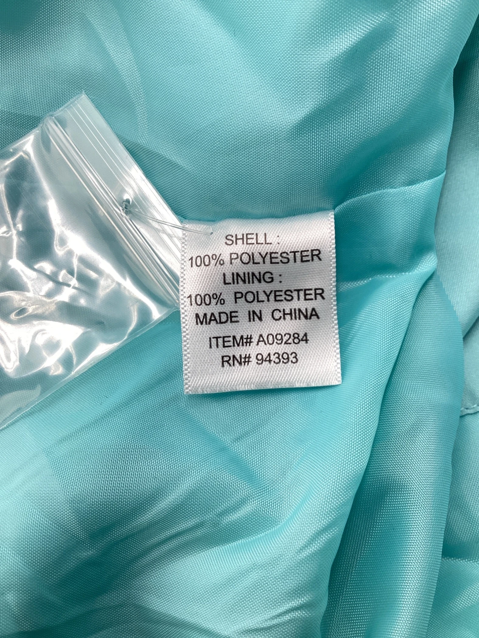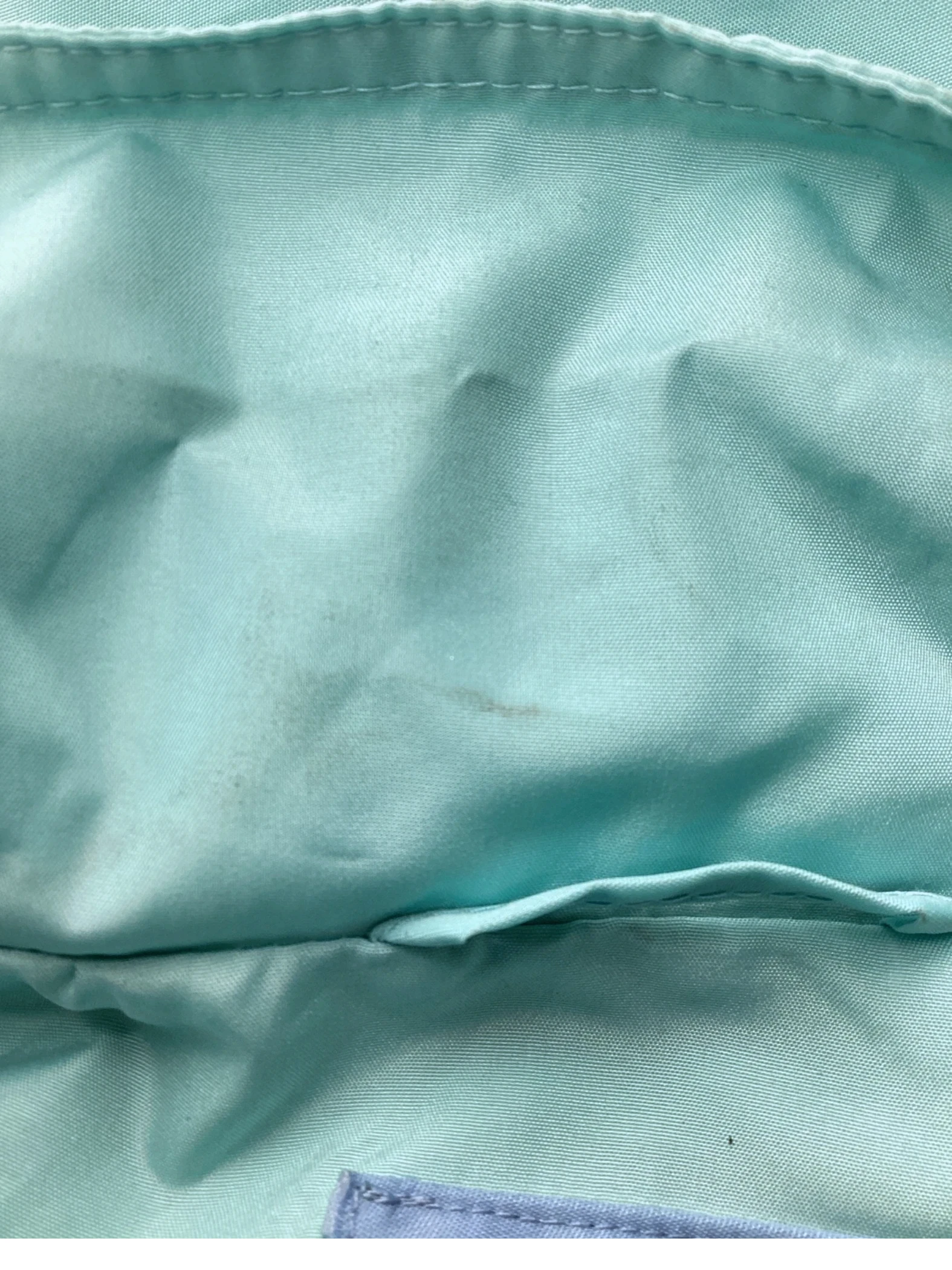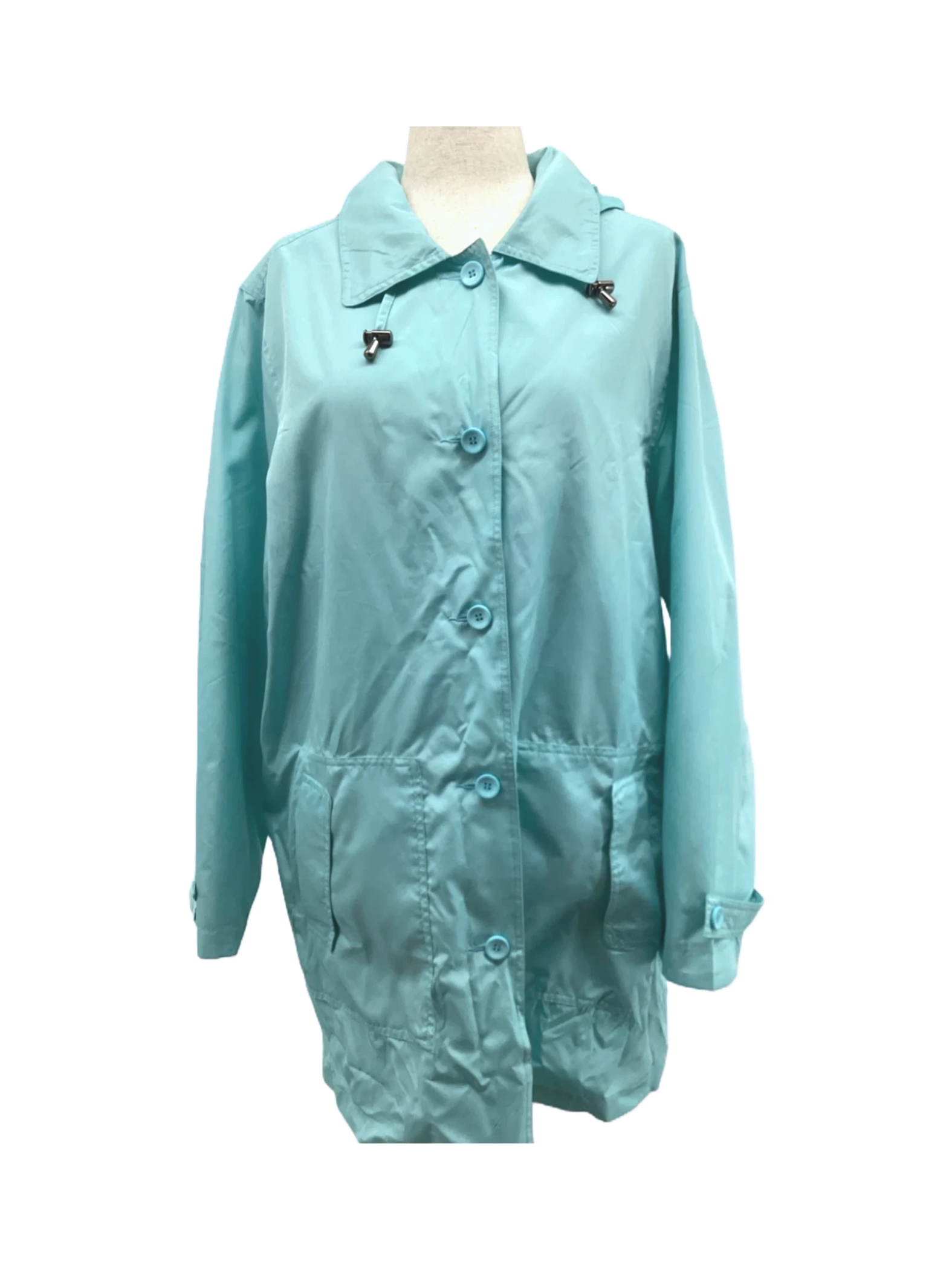 This is a women's raincoat jacket in sea foam green canvas. It has a few scuff marks but they appear to be washable.