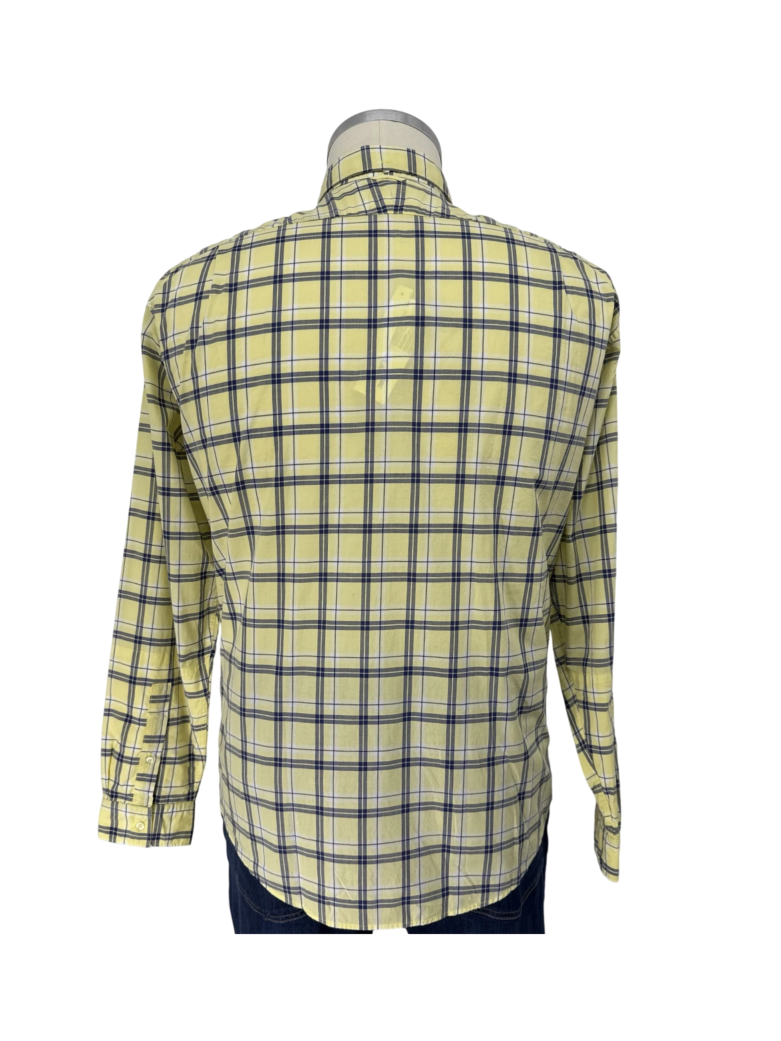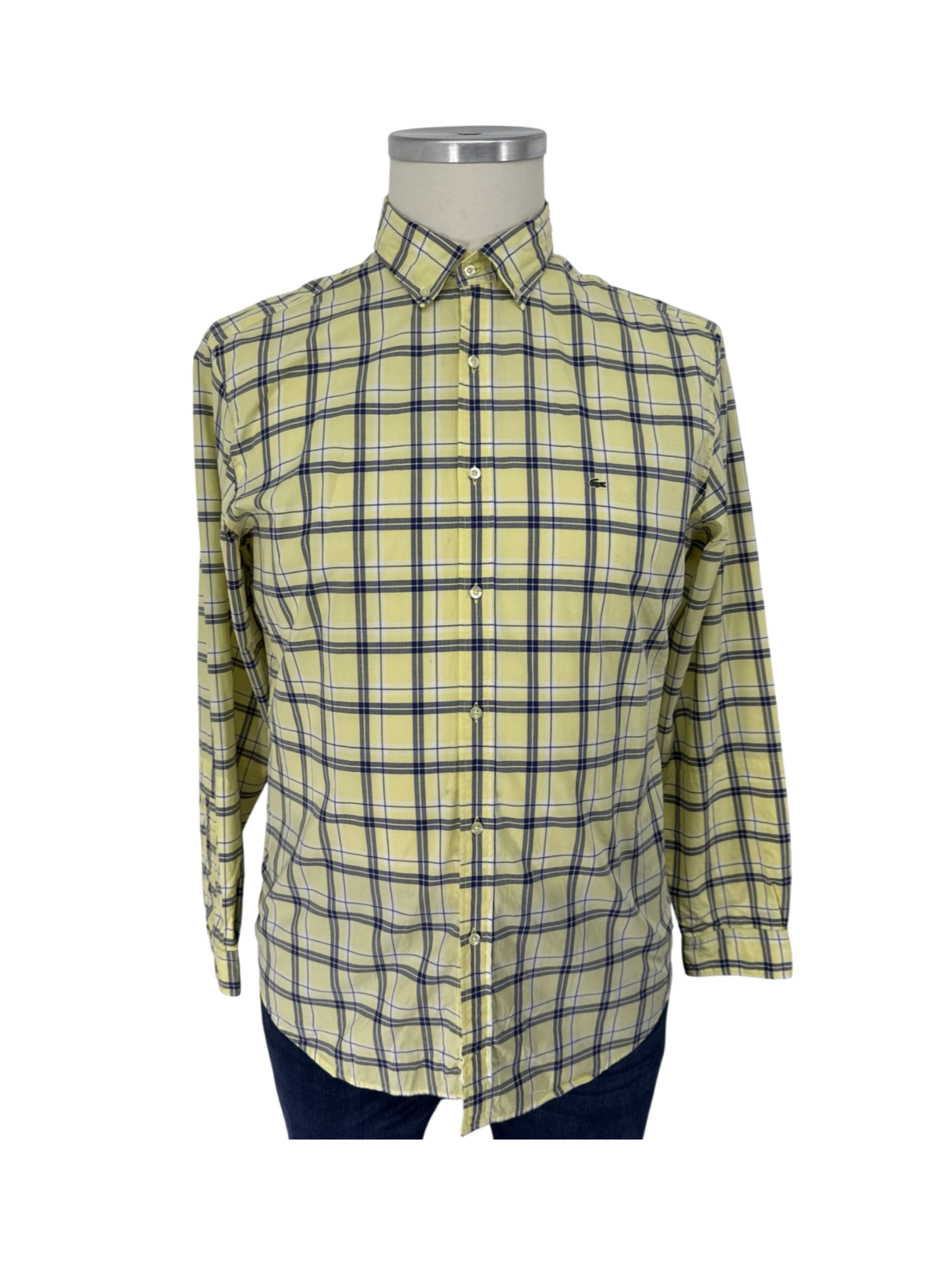 Elevate your casual wardrobe with this pre-owned Lacoste classic fit button-up shirt. Crafted from breathable cotton, this long-sleeve shirt features a timeless plaid pattern in yellow and navy. Perfect for spring and fall, it offers a comfortable fit and stylish look. A versatile piece that's ideal for everyday wear, combining both style and comfort. This shirt is a testament to Lacoste's commitment to quality and classic design.