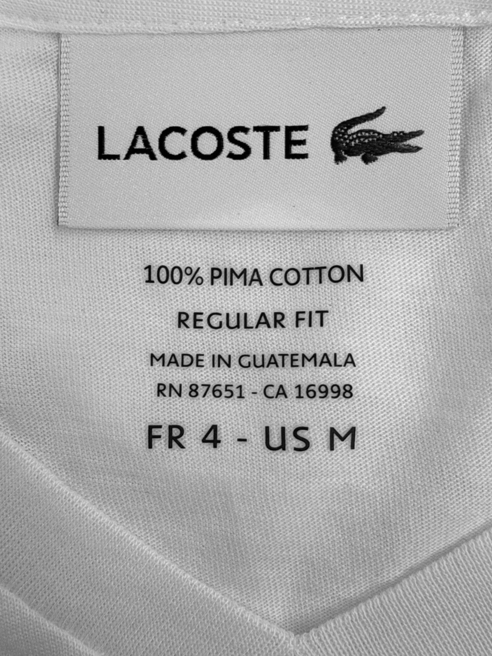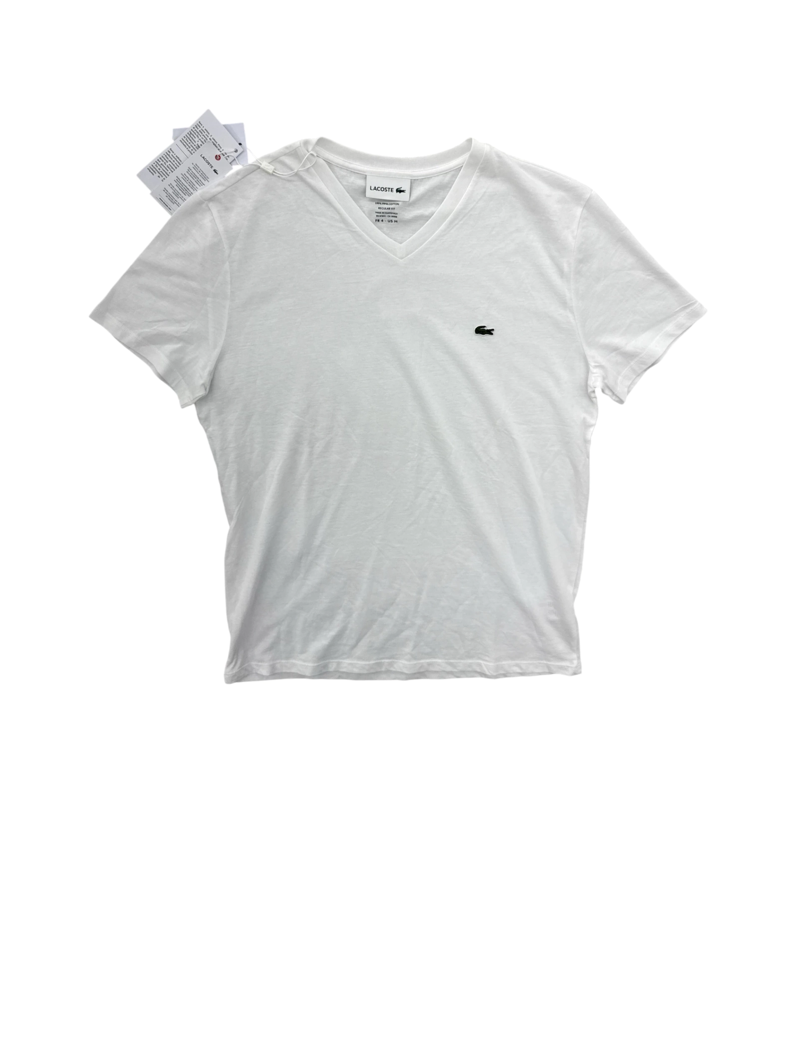 This pre-owned Lacoste T-shirt is a classic and stylish addition to any wardrobe. Crafted from 100% Pima cotton, it offers a comfortable and breathable feel. The crisp white color and V-neck design make it versatile for various occasions. Featuring the iconic Lacoste crocodile logo, this regular-fit tee is perfect for casual wear. Made in Guatemala, this T-shirt is a testament to quality craftsmanship.