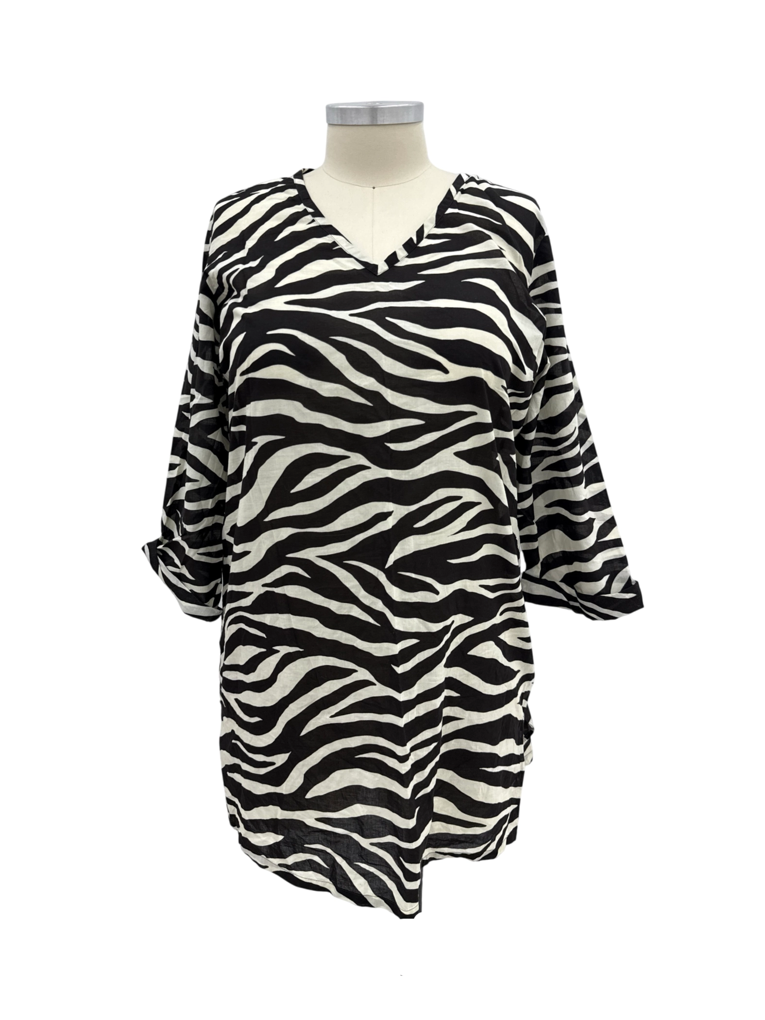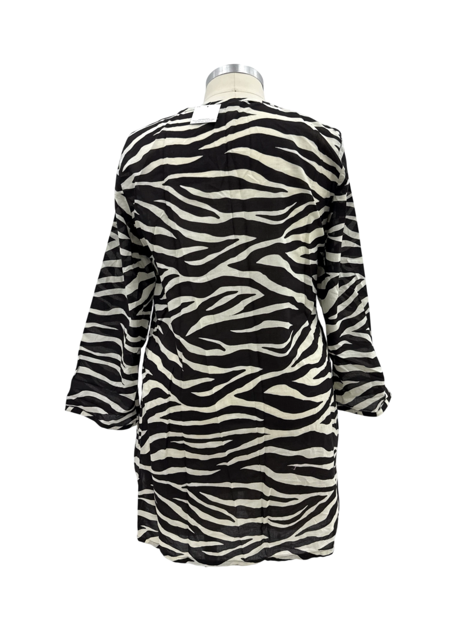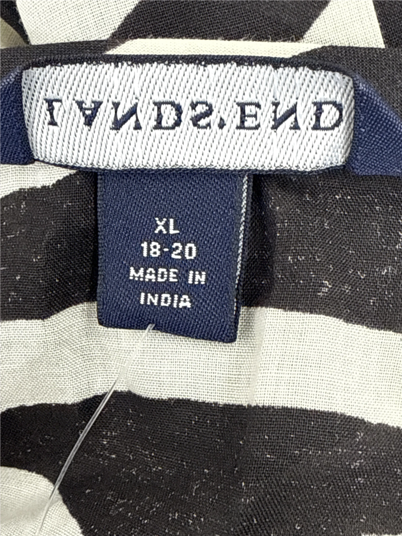 This LANDS' END dress features a striking zebra print in black and white, perfect for a bold summer look. Designed as a cover-up, it offers a relaxed A-line silhouette, flattering for various body types. Crafted from comfortable cotton, it's ideal for casual outings. The dress has long sleeves and a V-neckline. This pre-owned dress is a stylish and affordable addition to your wardrobe.