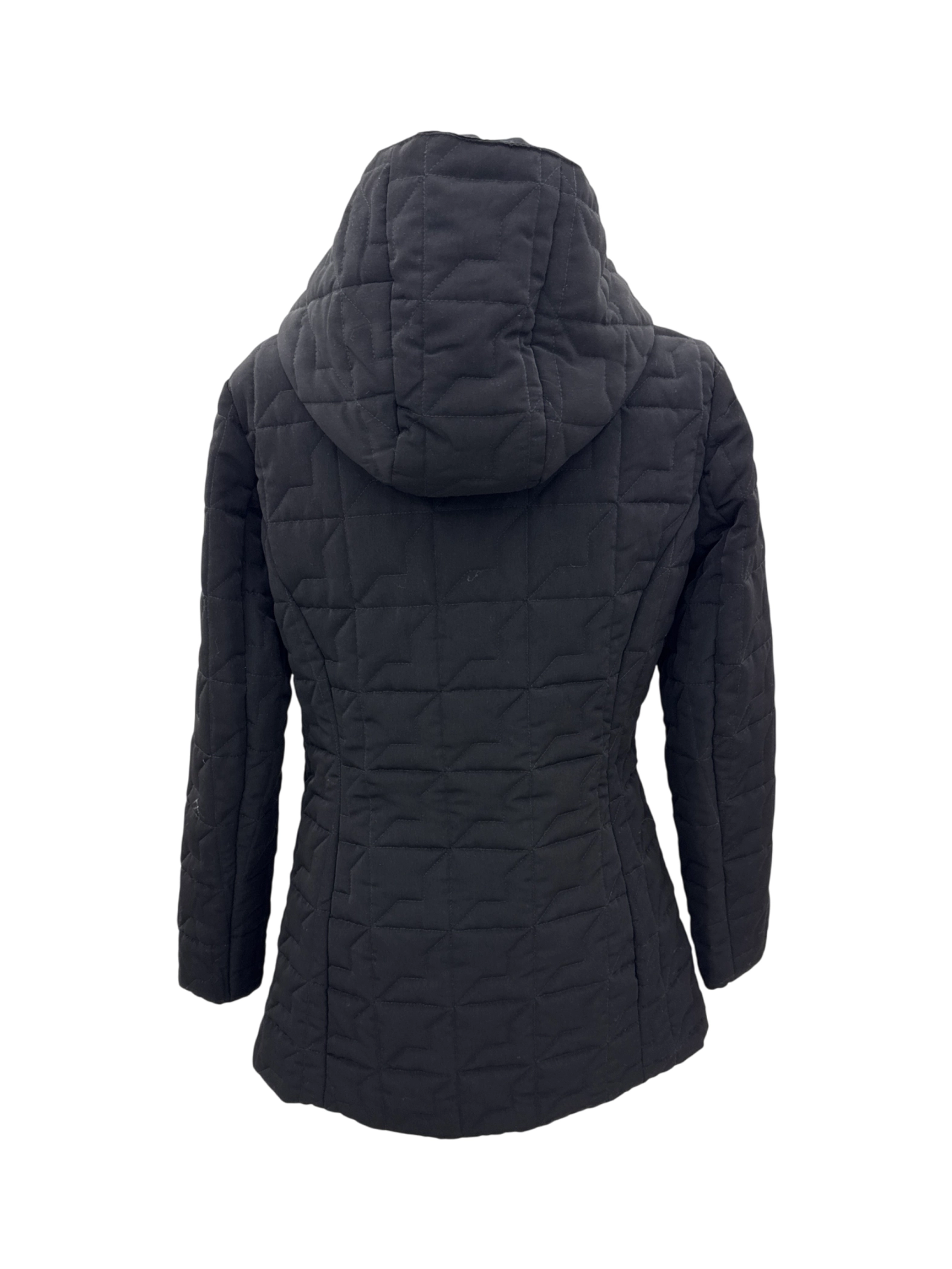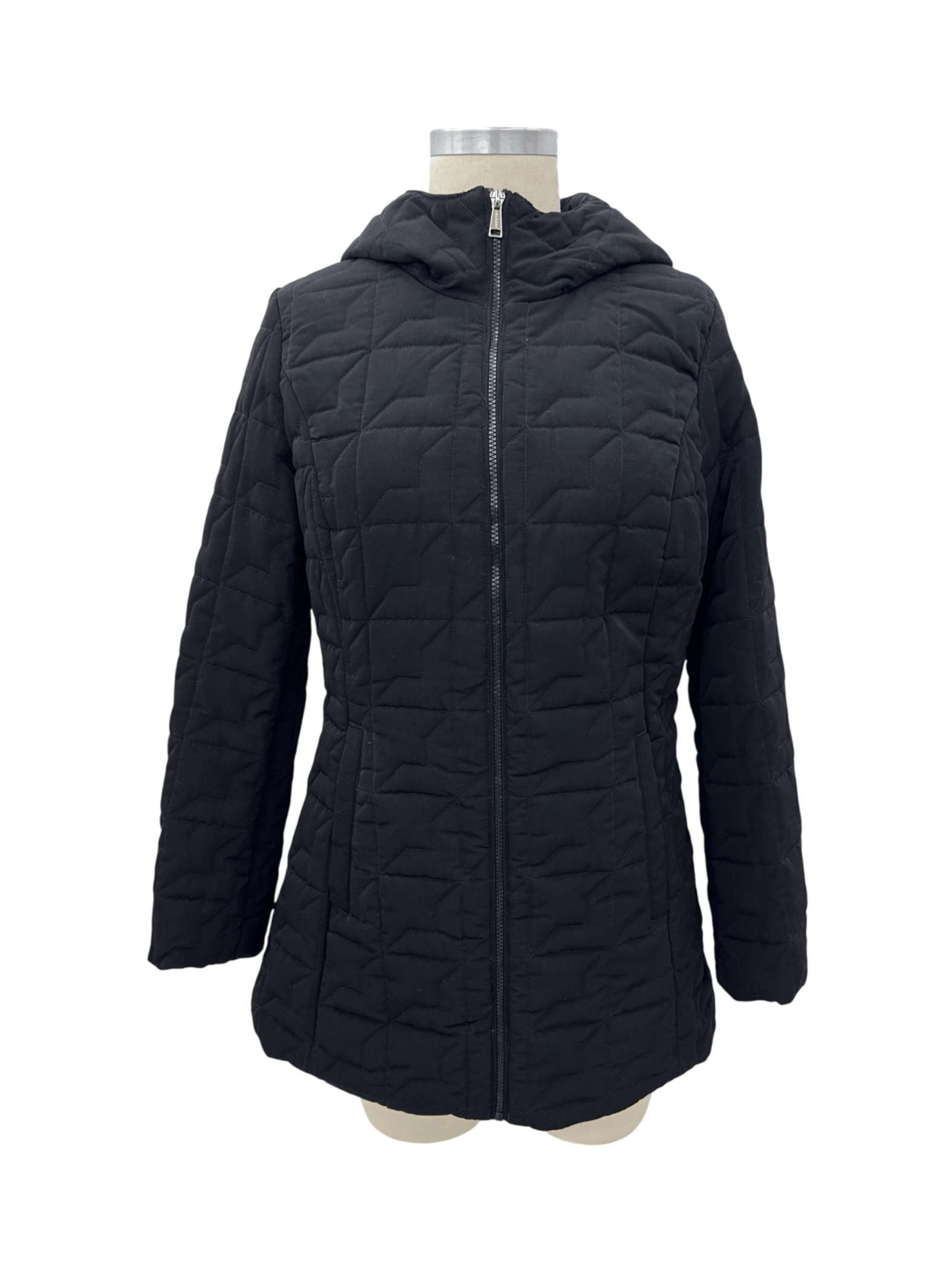 This pre-owned Laundry by Shelli Segal quilted jacket is the perfect blend of style and warmth for the fall and winter seasons. Crafted from 100% polyester, this jacket features a sleek black design with a flattering fit, and a convenient hood for extra protection against the elements. A versatile addition to any wardrobe, ideal for casual outings or layering. The jacket offers comfort and style, great for everyday wear. This gently used jacket is in excellent condition, offering a great value.