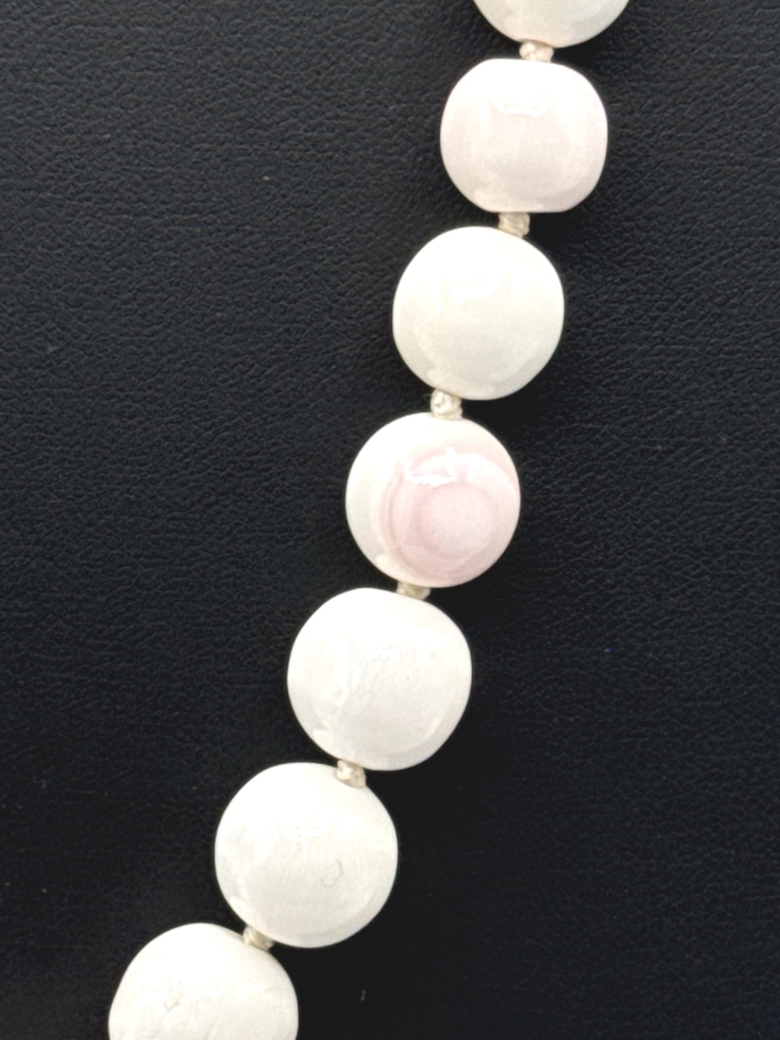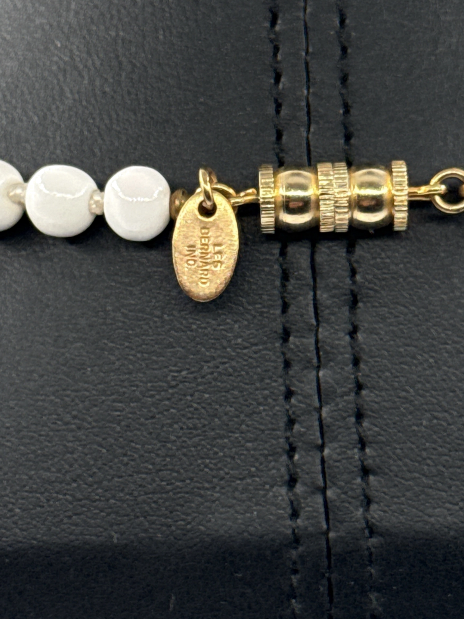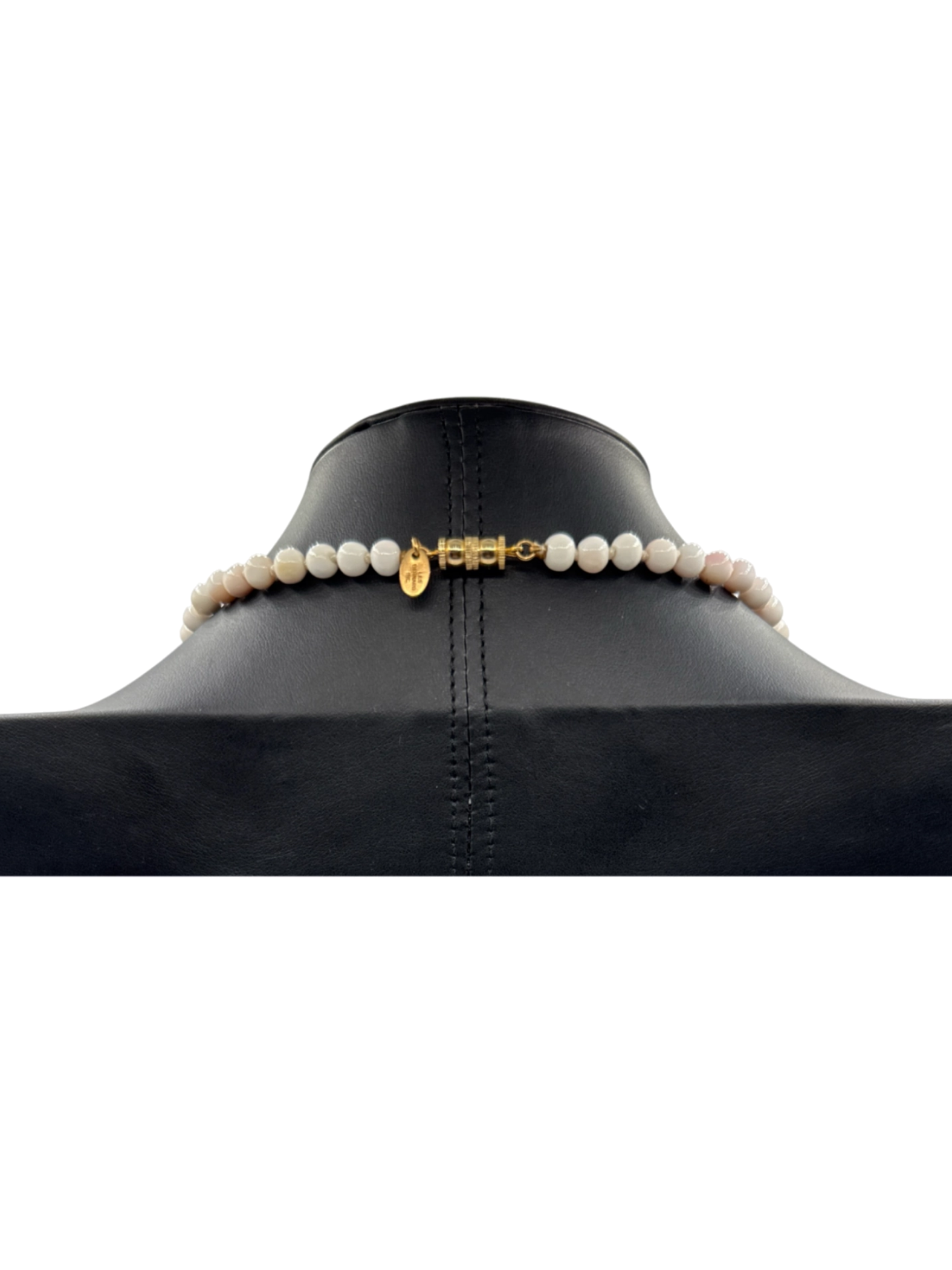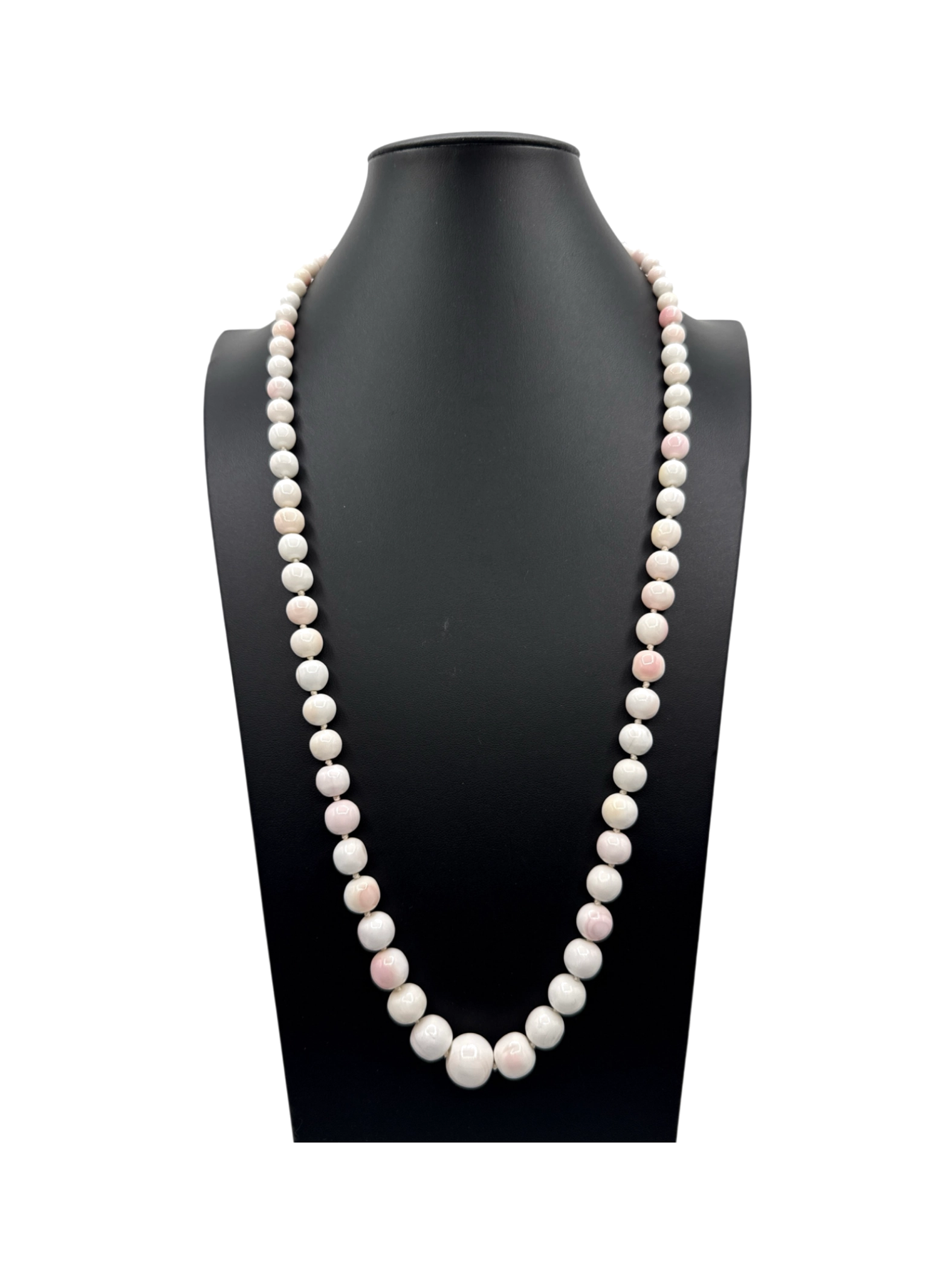 Elegant and timeless, this pre-owned Les Bernard necklace is a beautiful addition to any jewelry collection. Crafted with lustrous white and pink pearls, the necklace offers a classic and feminine look. The matinee length enhances its versatility, perfect for both everyday wear and special occasions. A gold tone metal clasp secures the piece. This piece exudes elegance and style. A perfect gift.