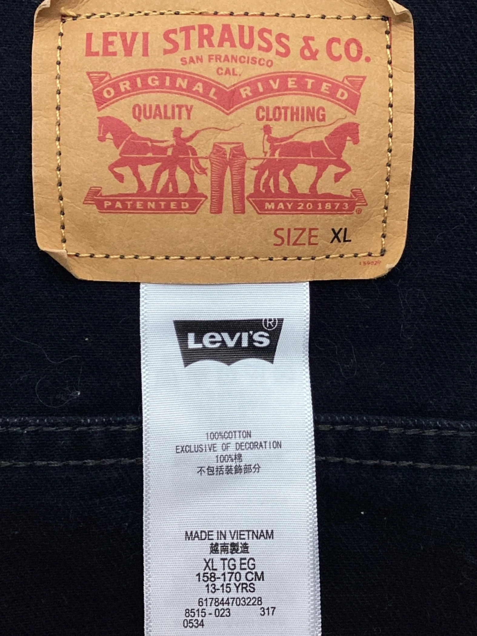 This is a Levi Kids Youth Denim Jacket with patches. It is missing a button.