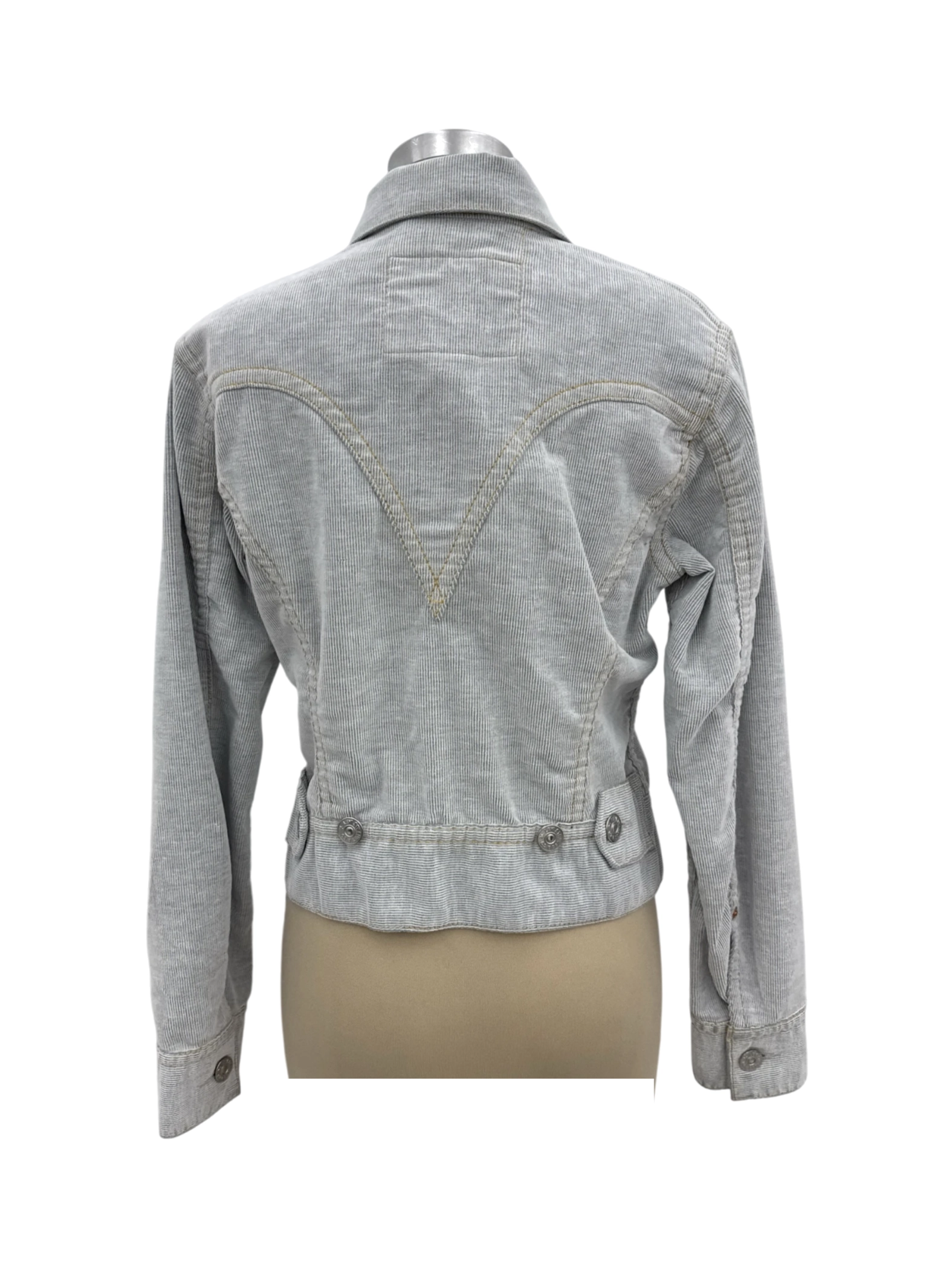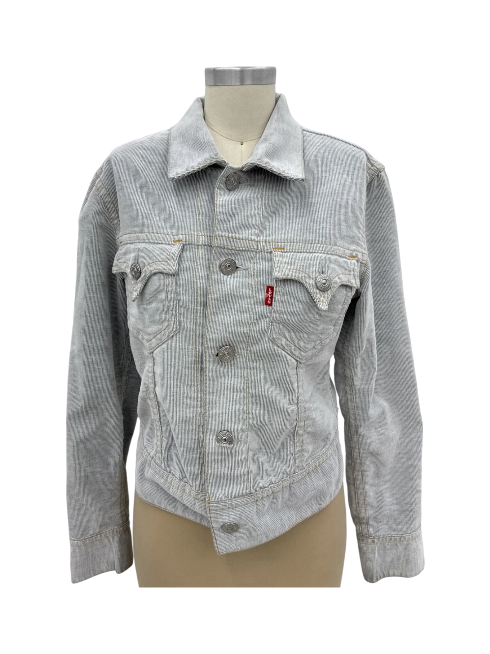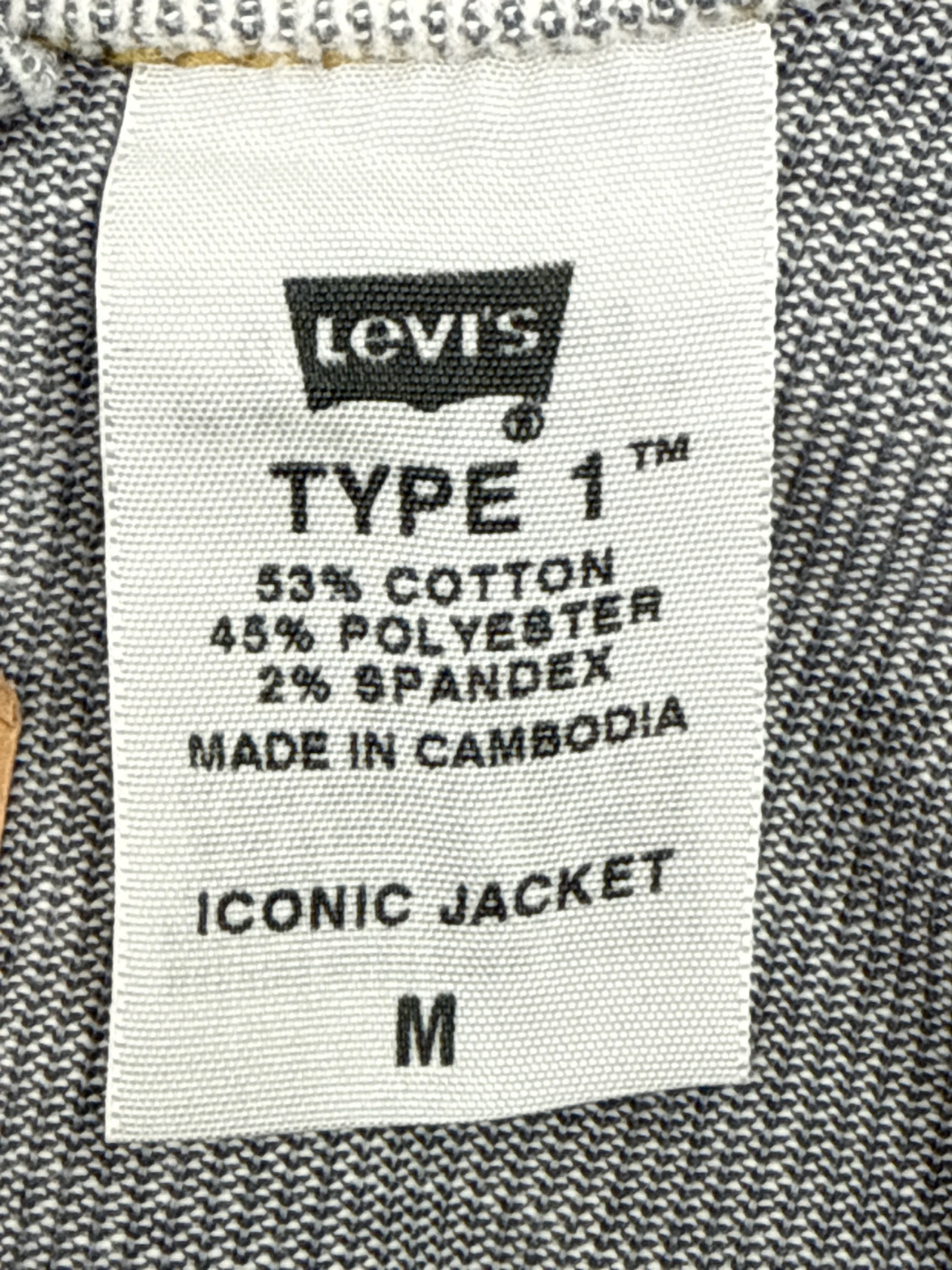 This pre-owned Levi's Type 1 denim jacket is a timeless classic. Crafted from a comfortable cotton blend, the jacket features a stylish gray hue. It's a versatile piece perfect for layering in any season. This iconic jacket is a must-have for any wardrobe and is in great condition. Experience the quality and style of Levi's, a brand that has stood the test of time and fashion.