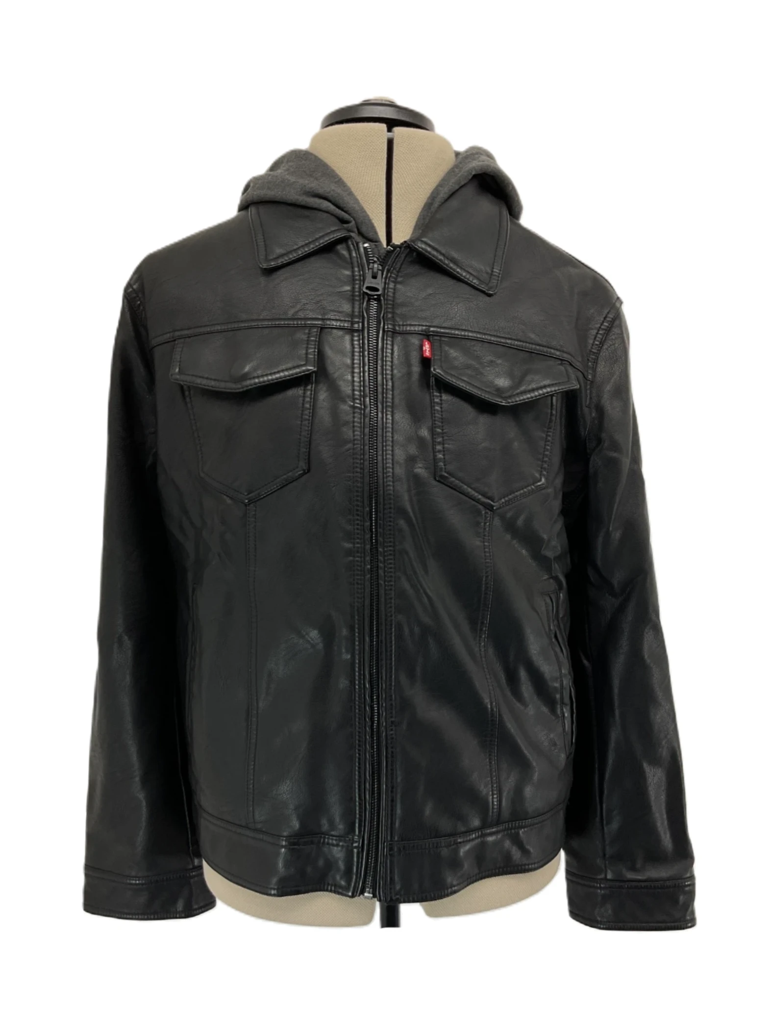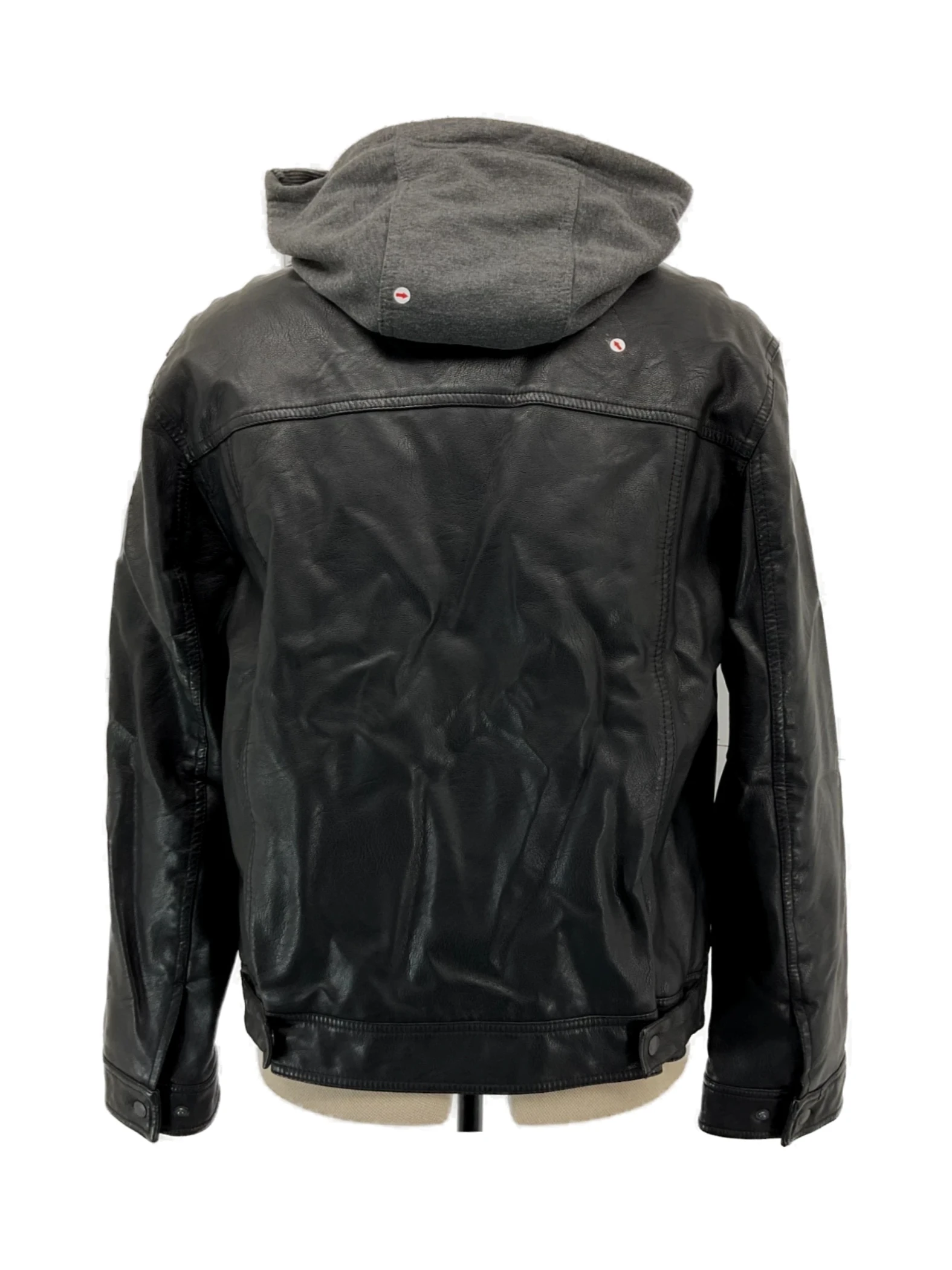 There is a men's medium black classic hooded sherpa jacket available. The jacket has several blemishes at the location indicated by the arrow in the photo.