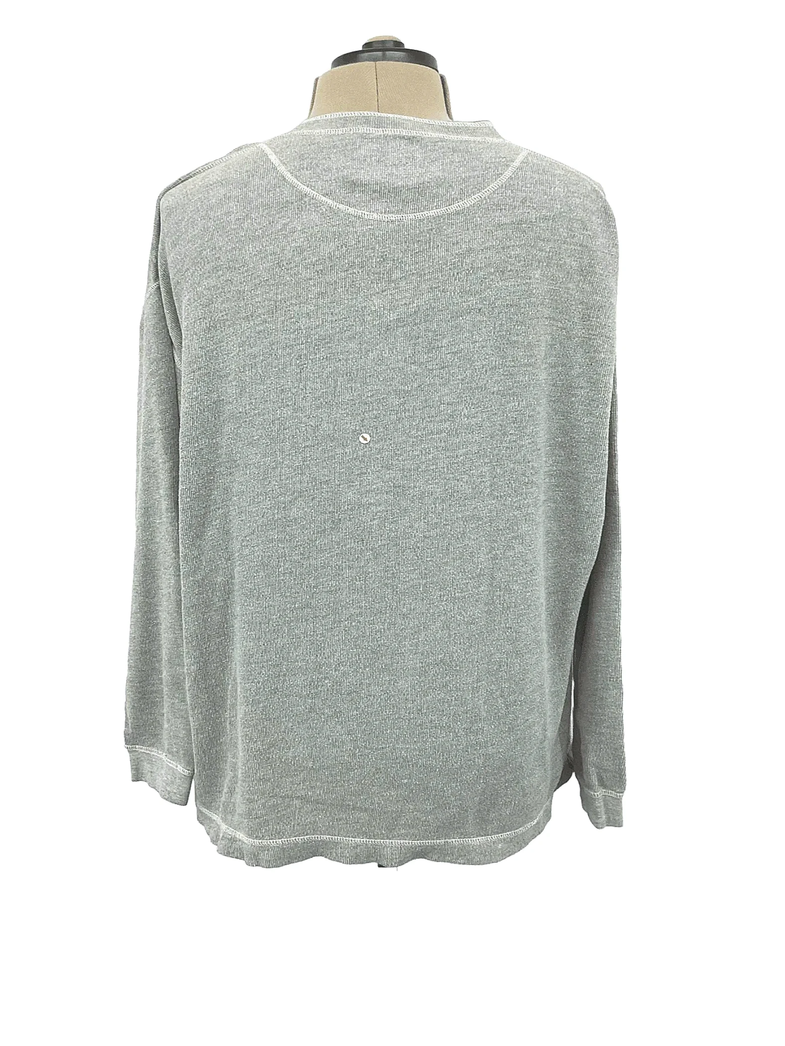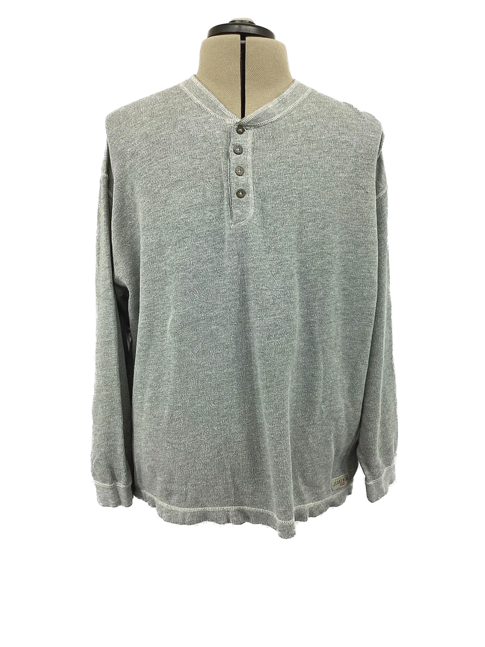 This is a men's gray Levi thermal long sleeve button-up top in size XL. The product has several small blemishes indicated by the arrow in the photo.