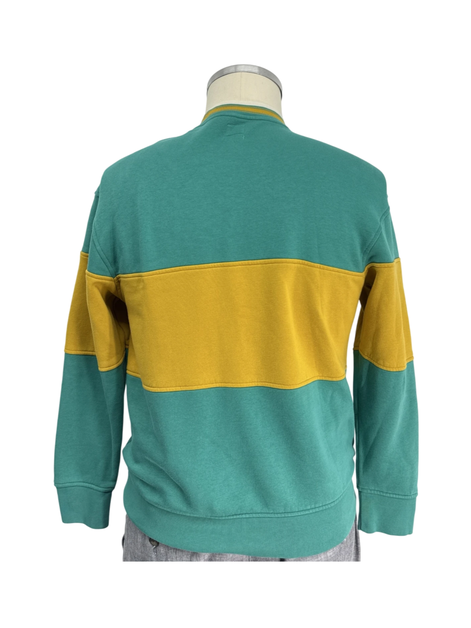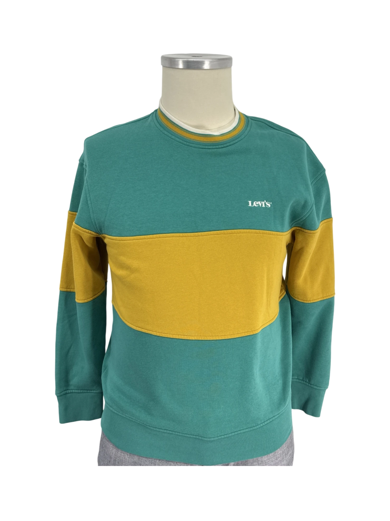 This Levi's men's sweater, a pre-owned gem, features a classic crew neck and long sleeves. This pullover is made from comfortable cotton fabric and showcases a stylish striped design. The vibrant green and yellow colorblock will elevate your everyday style. It's a perfect choice for casual outings, offering both comfort and a touch of vintage charm. A timeless wardrobe staple.