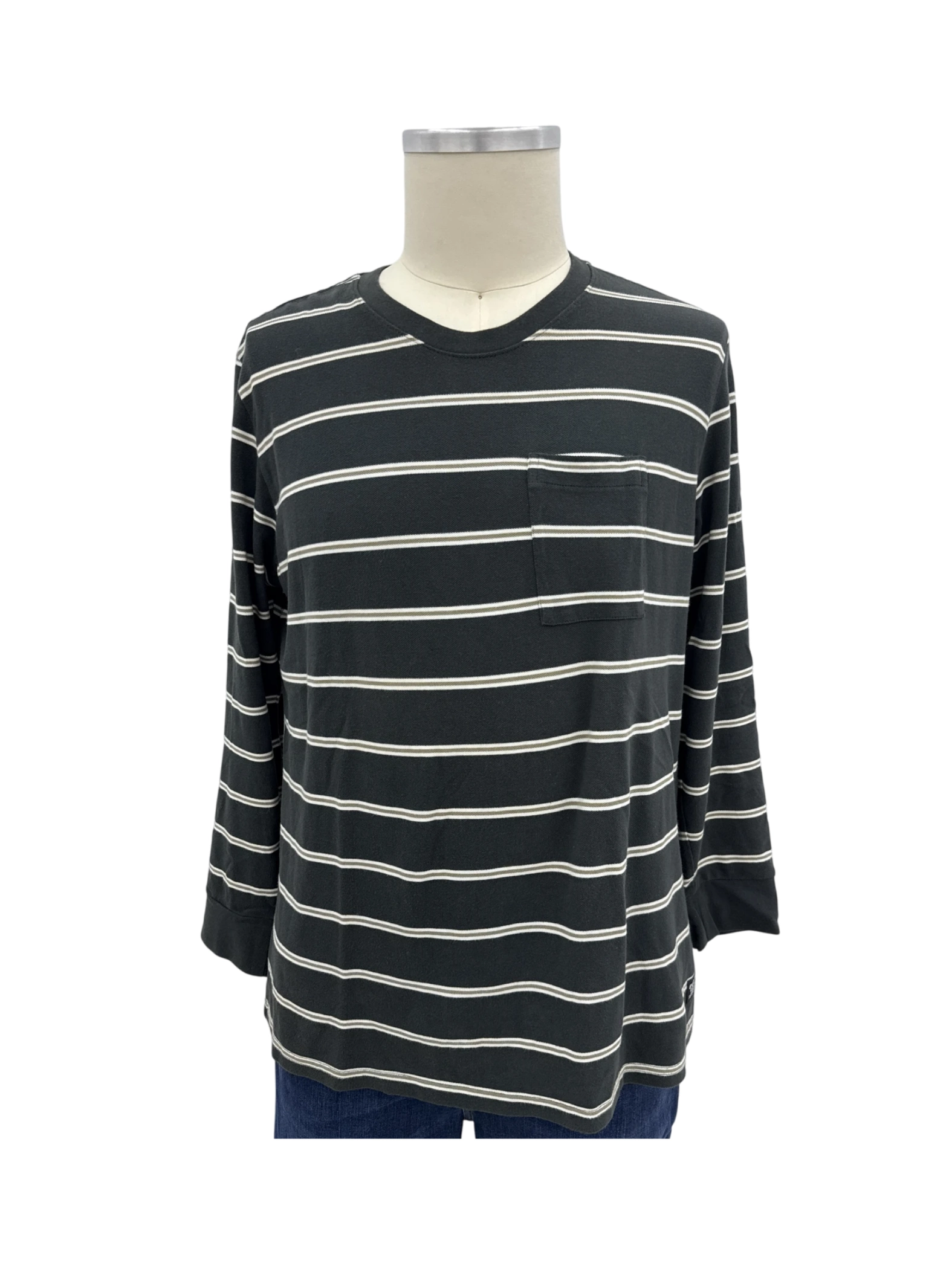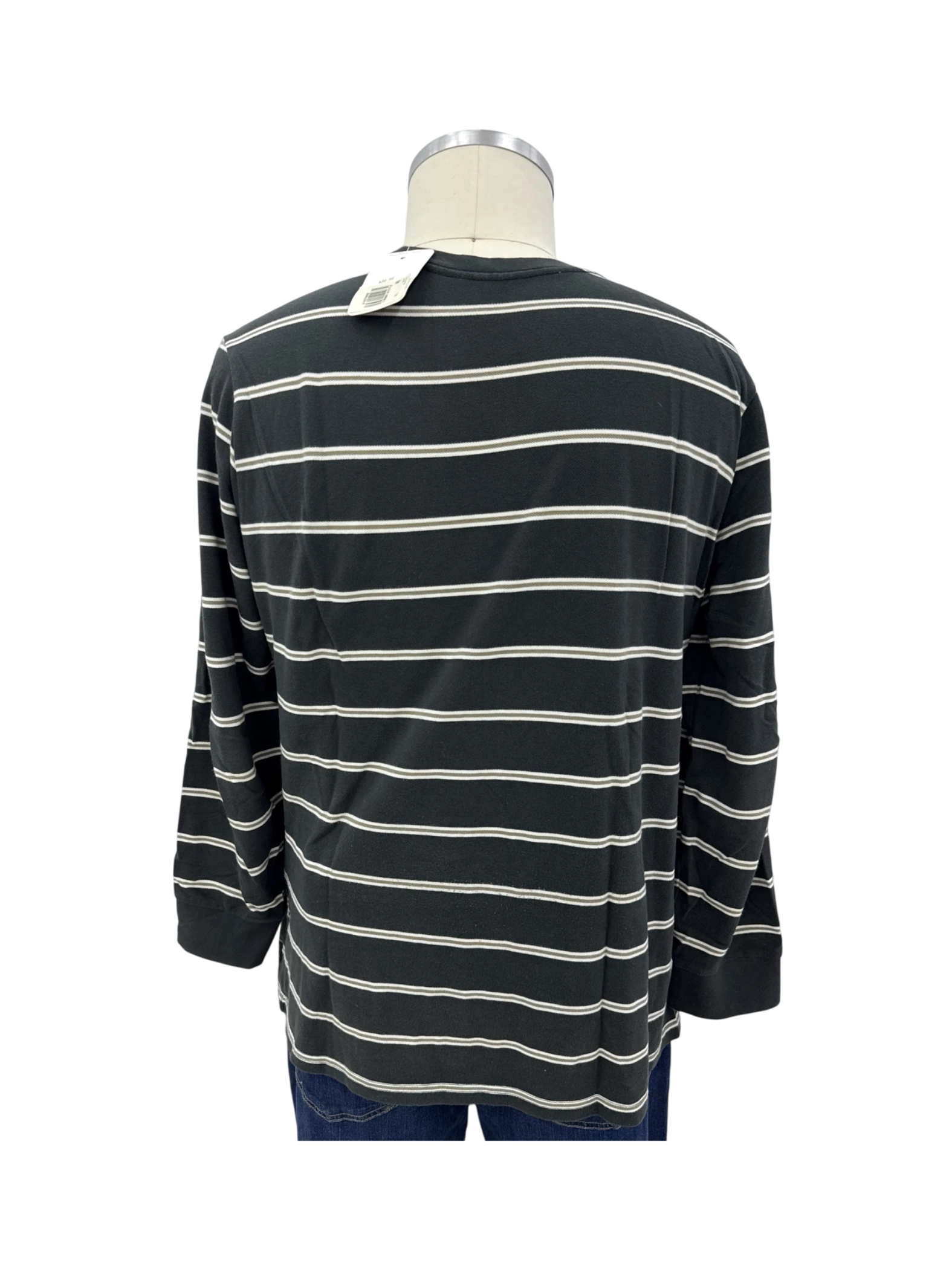 Elevate your casual wardrobe with this stylish pre-owned Levi's men's top. This long-sleeve tee features a classic round neck and a timeless striped design in black and white, perfect for adding a touch of sophistication to your everyday look. Crafted from soft cotton, it offers both comfort and durability. This versatile piece is ideal for layering or wearing on its own. Excellent condition, this top is ready to become a staple in your collection. A perfect blend of style and quality.
