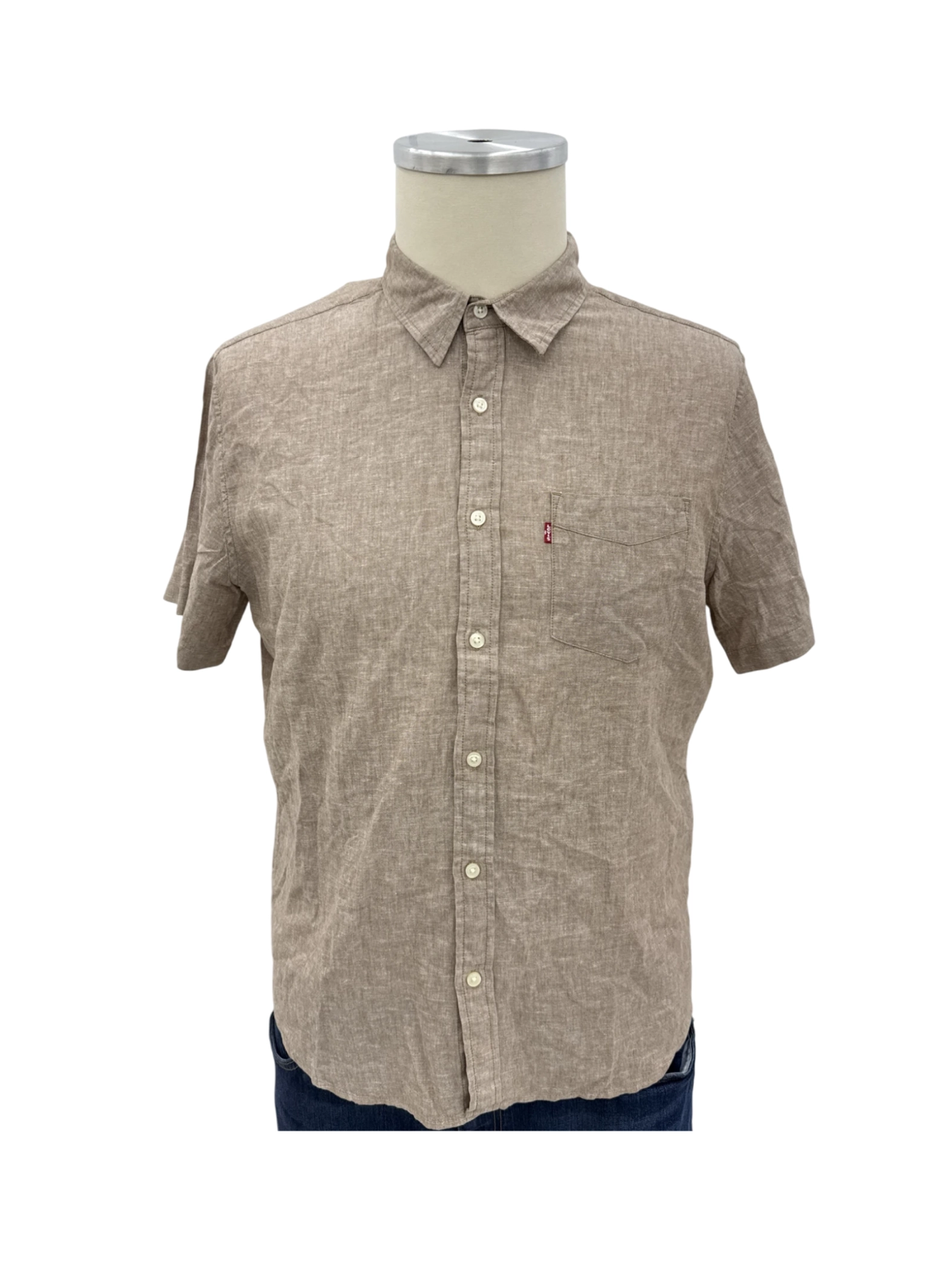 This pre-owned Levi's short-sleeve shirt is a stylish addition to any wardrobe. Made from a comfortable linen and cotton blend, it features a classic button-up design and a collared neckline. The tan color makes it versatile for various occasions. Perfect for casual wear, this shirt is a great find for those seeking quality and style. The Levi's Sunset One Pocket design adds a touch of retro charm.
