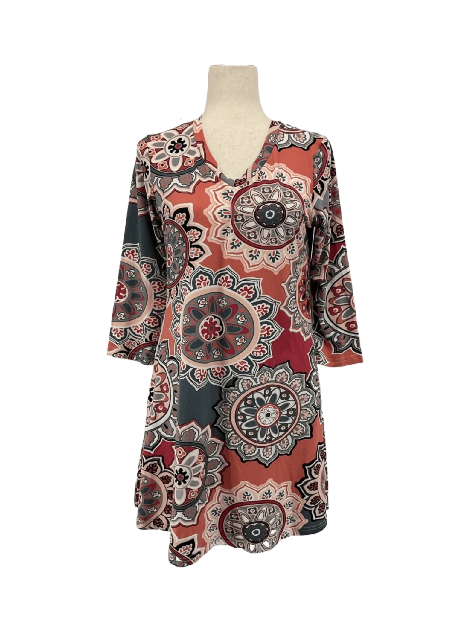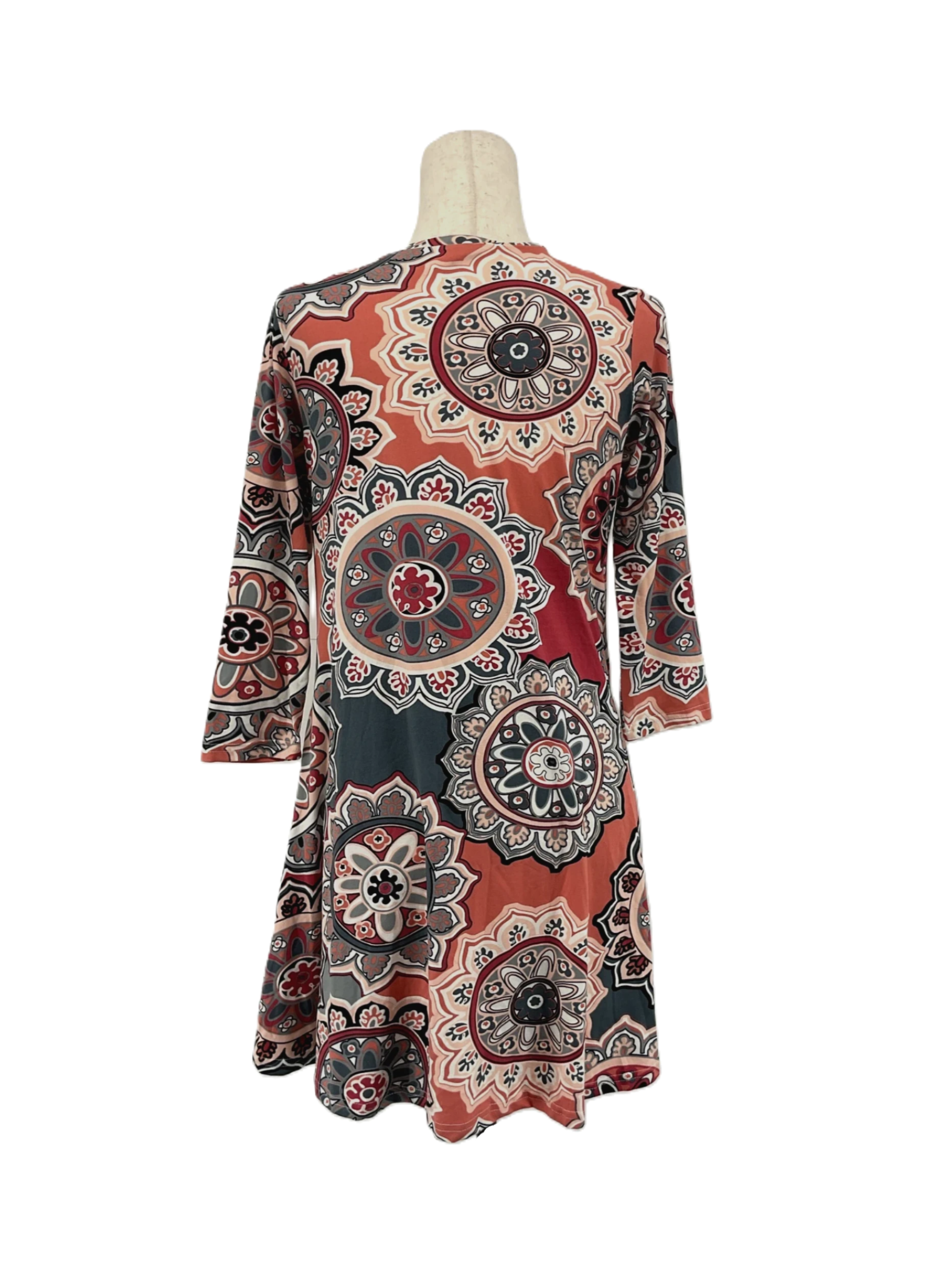 Women's 3/4 sleeve green multicolor geometric print tunic dress in size small-medium.