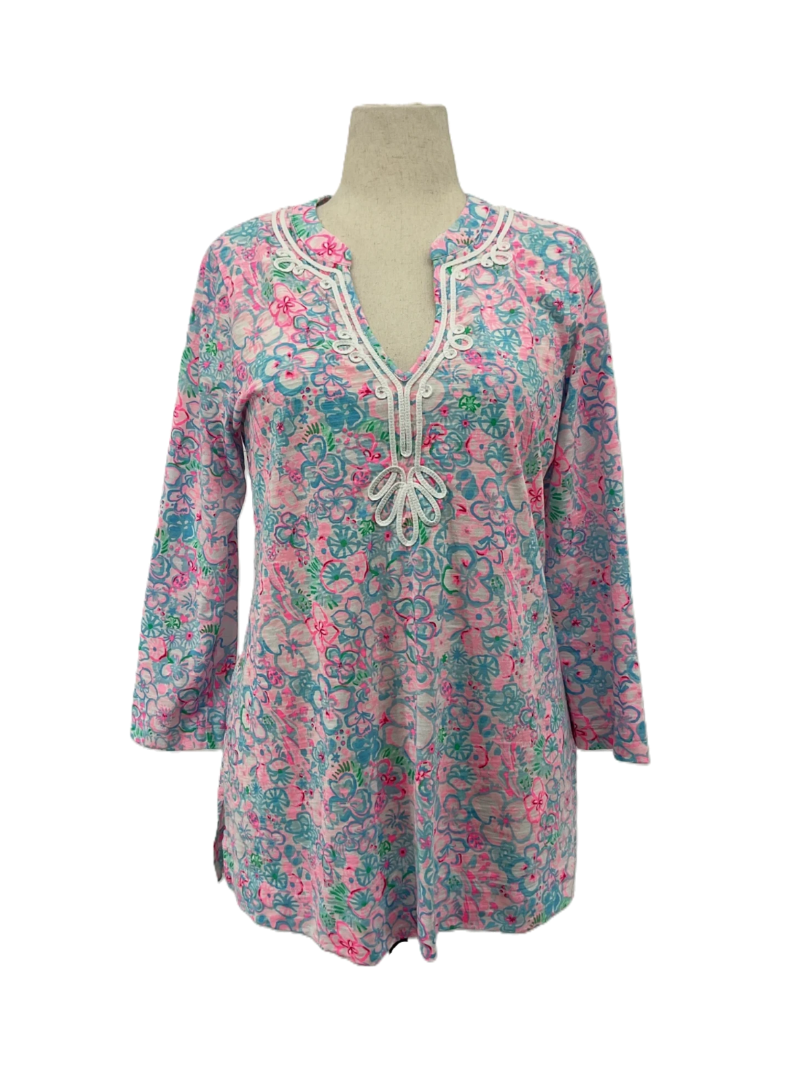 This pre-owned Lilly Pulitzer tunic top is a vibrant and stylish addition to any wardrobe. Featuring a beautiful floral pattern with pink and blue hues, this lightweight tunic is perfect for warm weather. Designed with a flattering V-neck and 3/4 sleeves, it provides both comfort and style. Made from 100% cotton, this top is easy to care for and ideal for casual outings or dressing up. Embrace the iconic Lilly Pulitzer aesthetic with this eye-catching tunic.