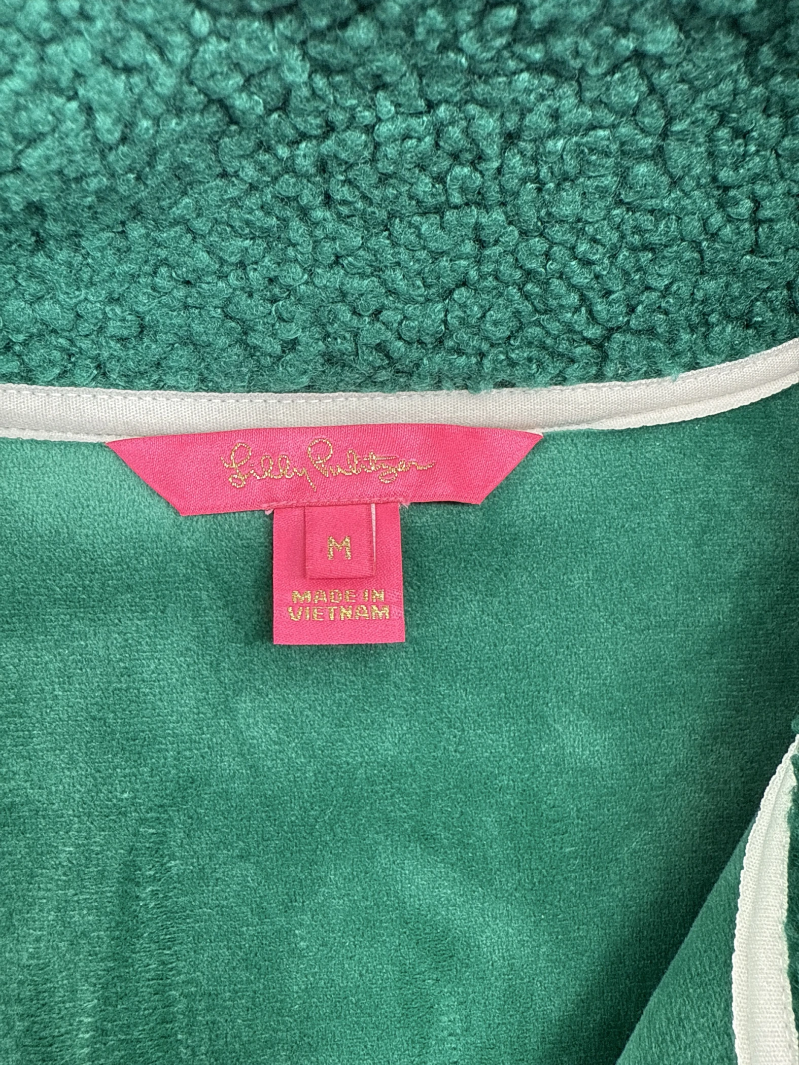 Cozy up in style with this pre-owned Lilly Pulitzer green sherpa cardigan. This warm and stylish zip-up sweater is perfect for the cooler months. Featuring a comfortable turtleneck and a convenient zipper closure, it offers both comfort and functionality. The soft polyester material adds a touch of luxury. This pre-loved cardigan is a great addition to any wardrobe, offering a stylish and sustainable choice.