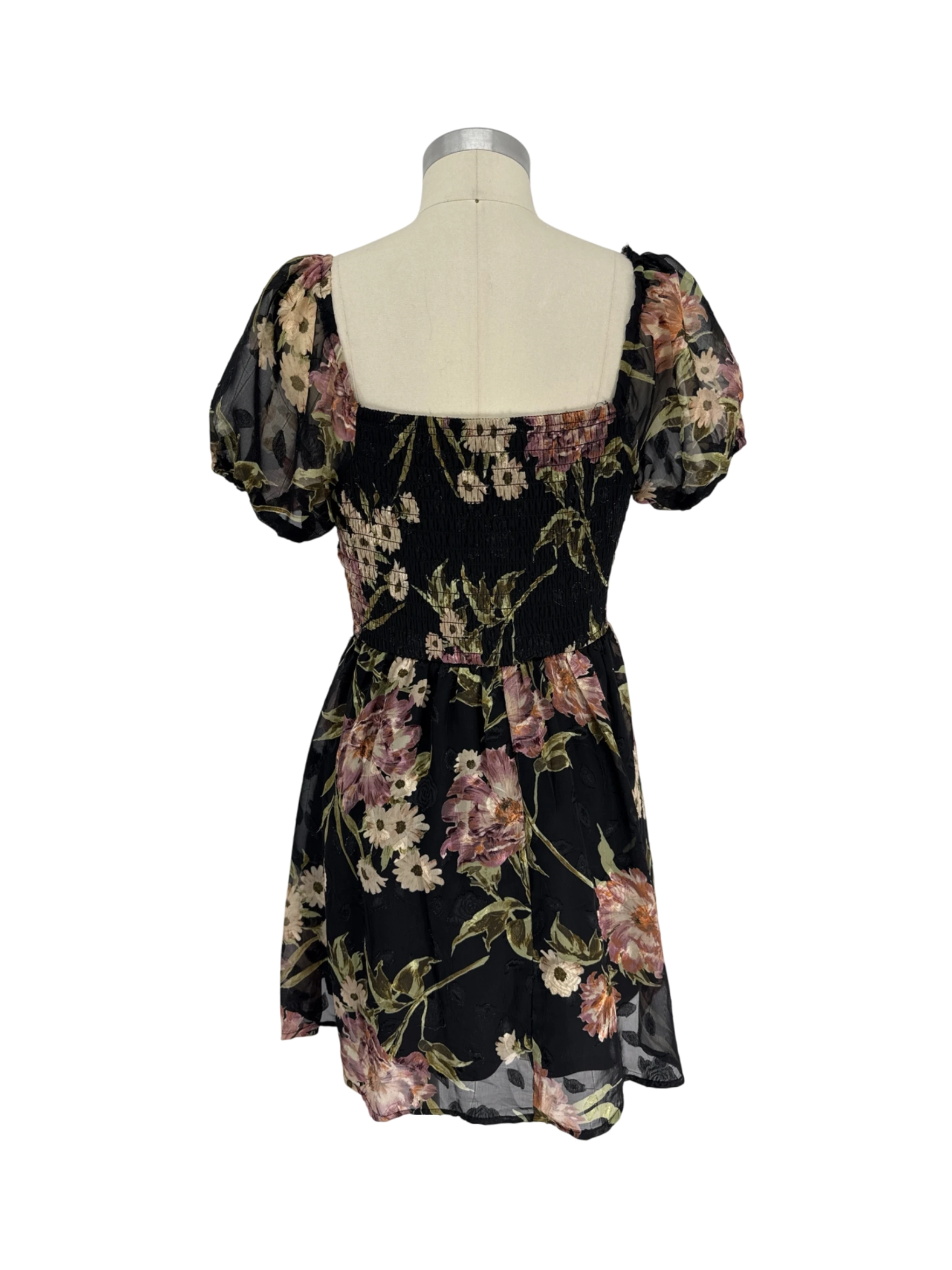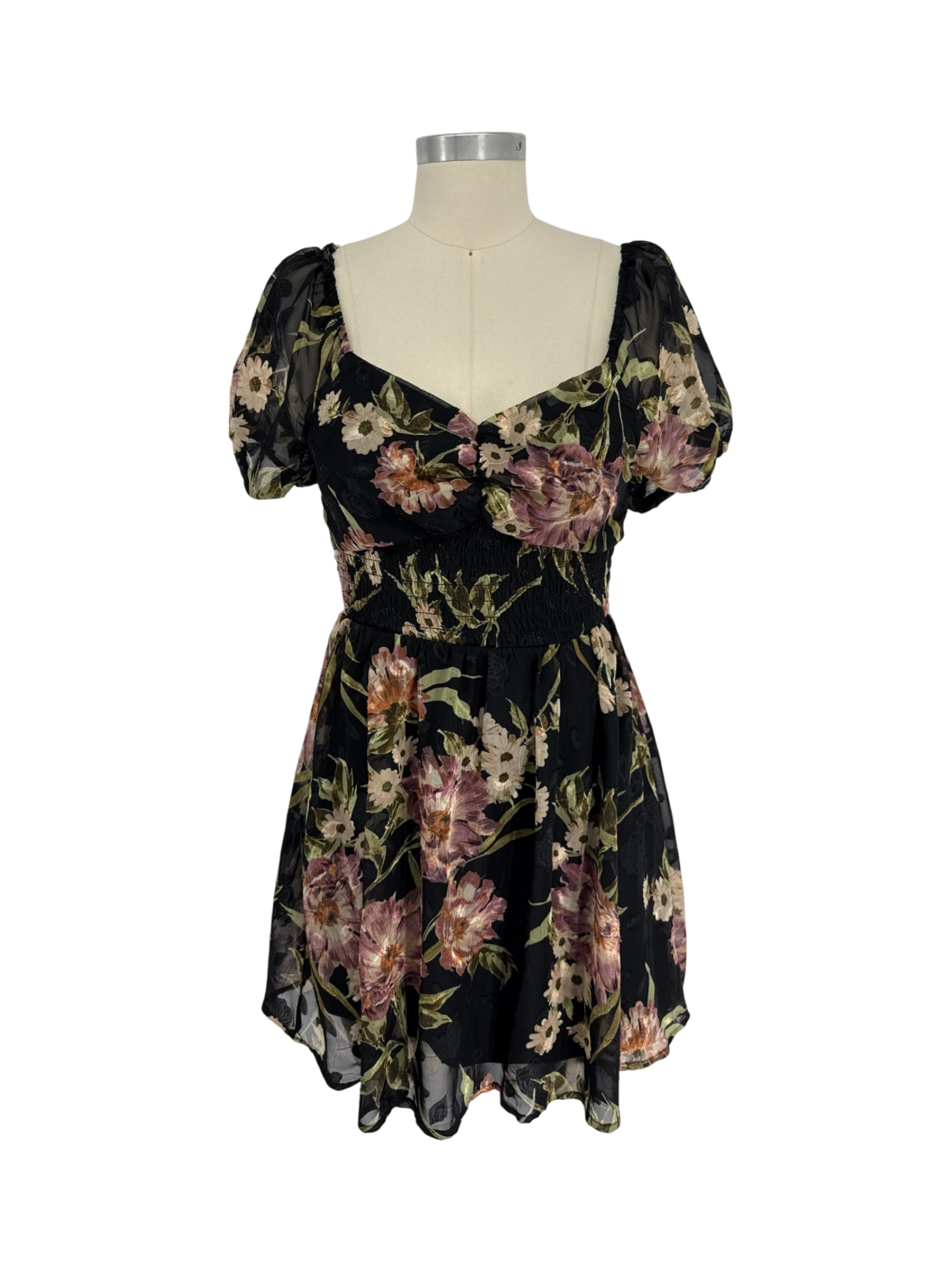 This pre-owned Lily Rose dress is a charming choice for warm weather. Featuring a flattering A-line silhouette and a playful mini length, it's adorned with a beautiful floral print on a black background. The dress boasts a square neckline and short, puff sleeves, adding a touch of sweetness. Crafted from lightweight polyester, it's perfect for casual outings and spring/summer events. A must-have for your wardrobe