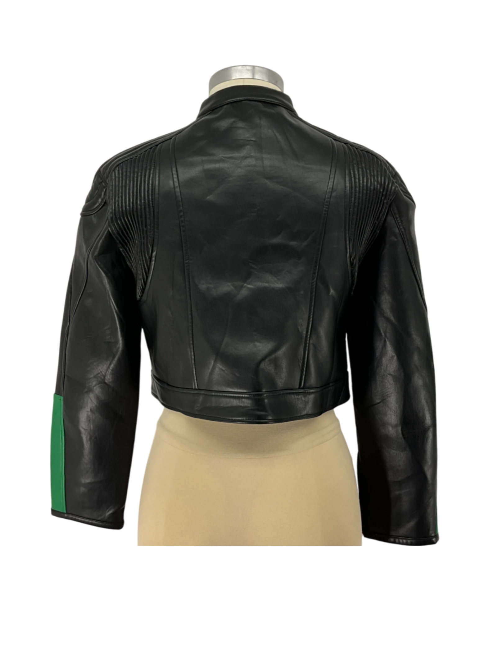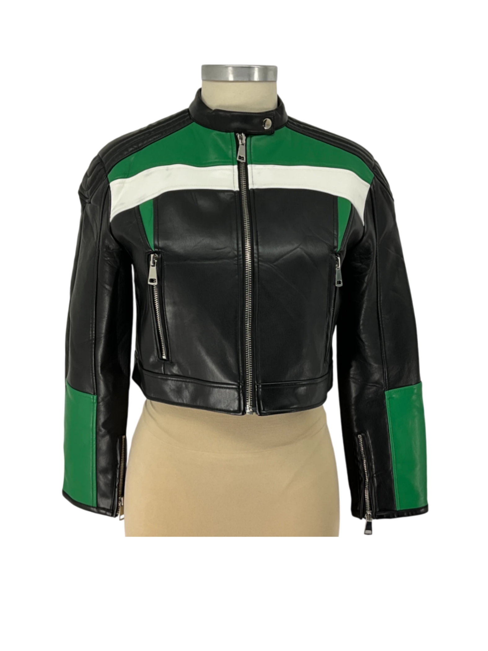 Elevate your outerwear game with this stunning Lioness motorcycle jacket. Crafted from high-quality faux leather with a bold color-block design in black, green, and white. This pre-owned jacket boasts a sleek, cropped silhouette, perfect for layering and adding a touch of edge to any outfit. Its durable construction ensures long-lasting wear, while its classic design makes it a timeless addition to your wardrobe. Designed in Australia.