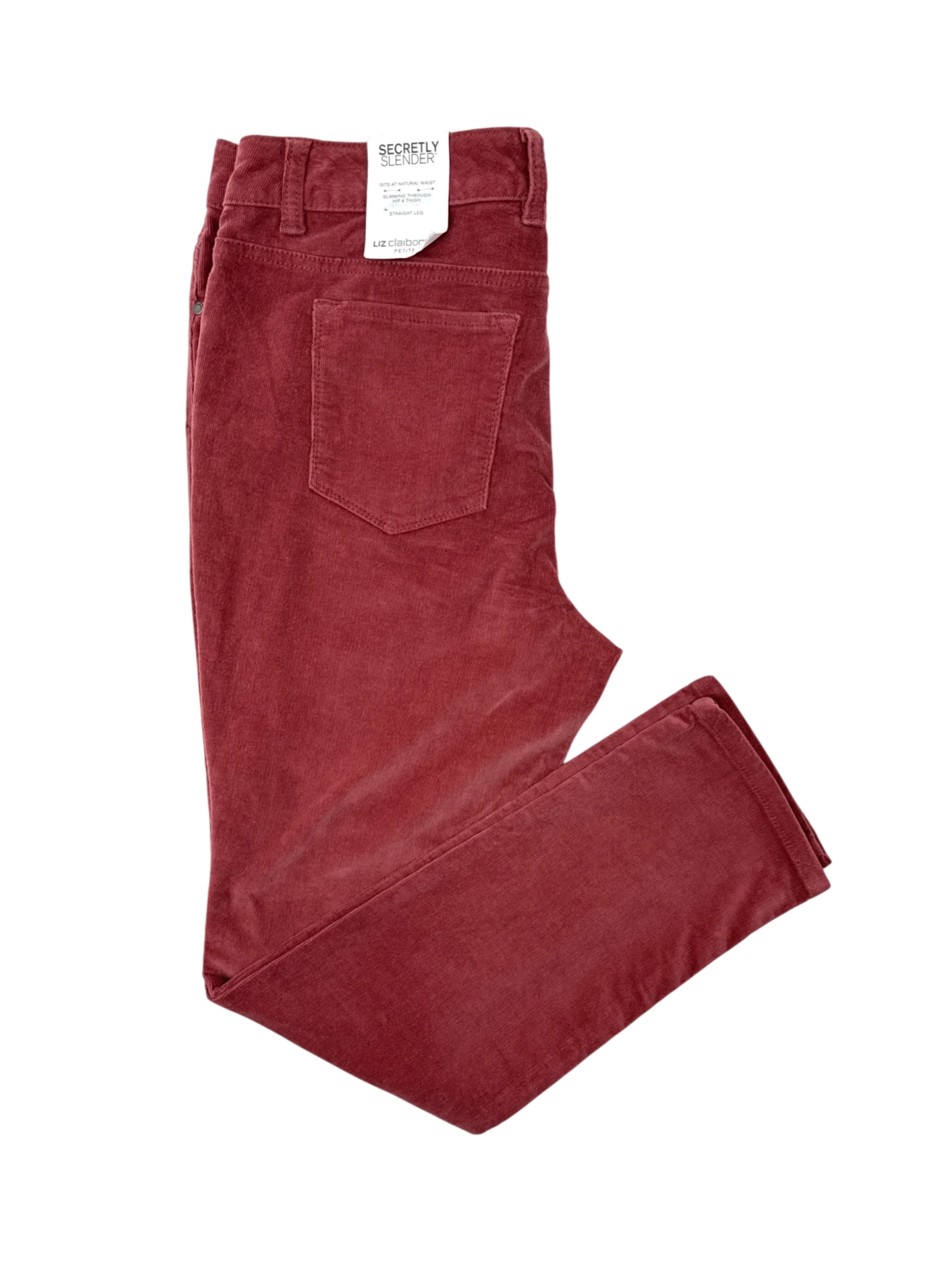 Elevate your wardrobe with these pre-owned Liz Claiborne burgundy corduroy pants. Crafted from a comfortable blend of cotton and spandex, these pants feature a classic straight leg fit. Perfect for the fall and winter seasons, they offer both style and comfort. These pants are in excellent condition.