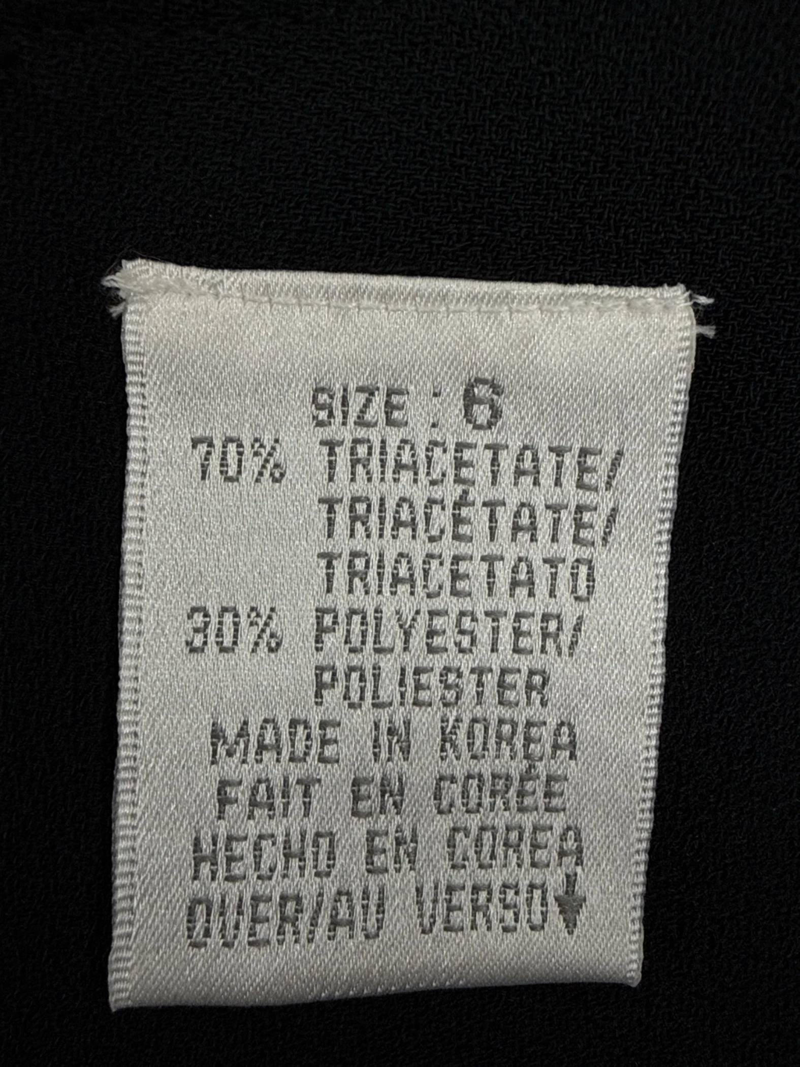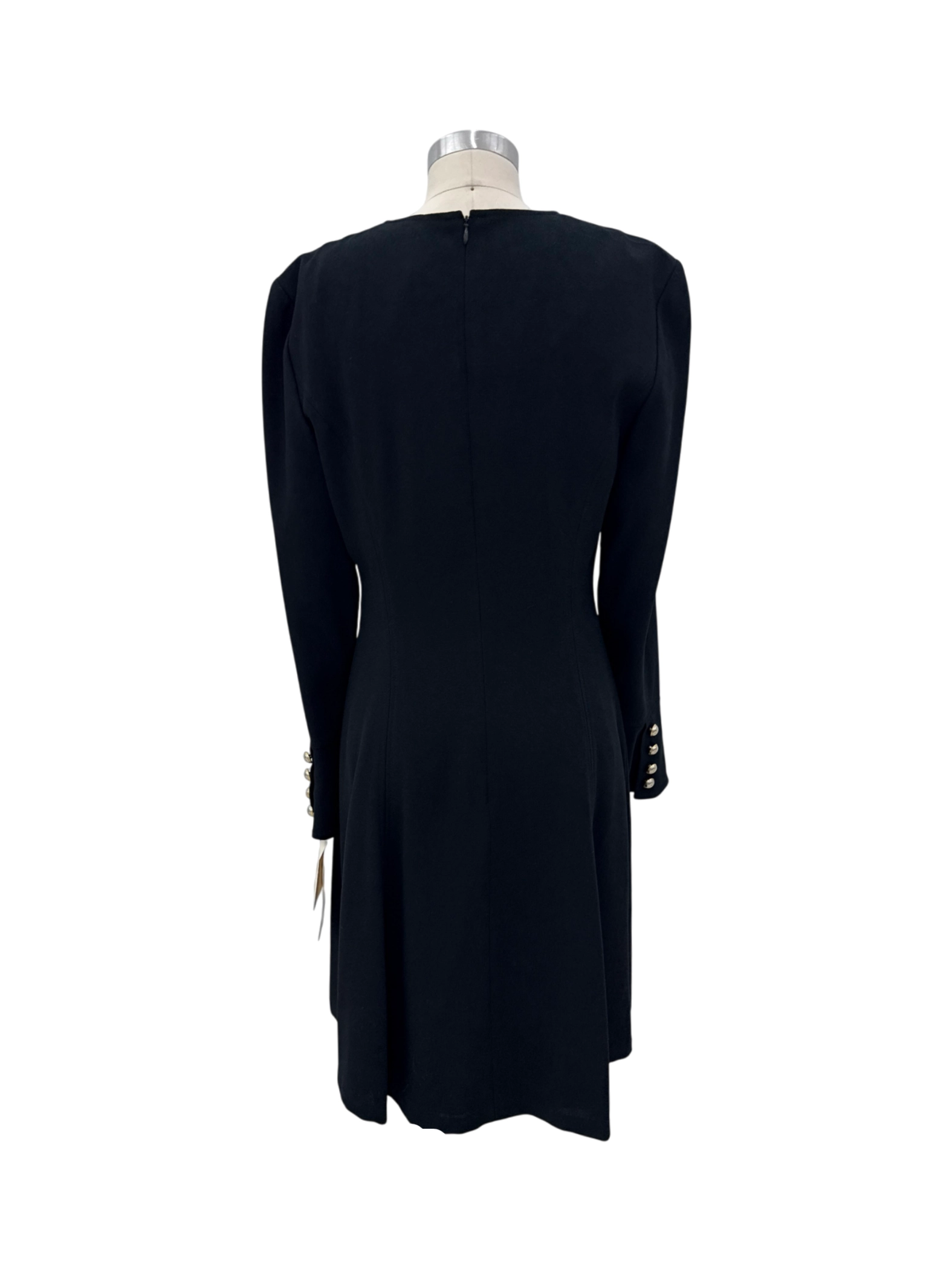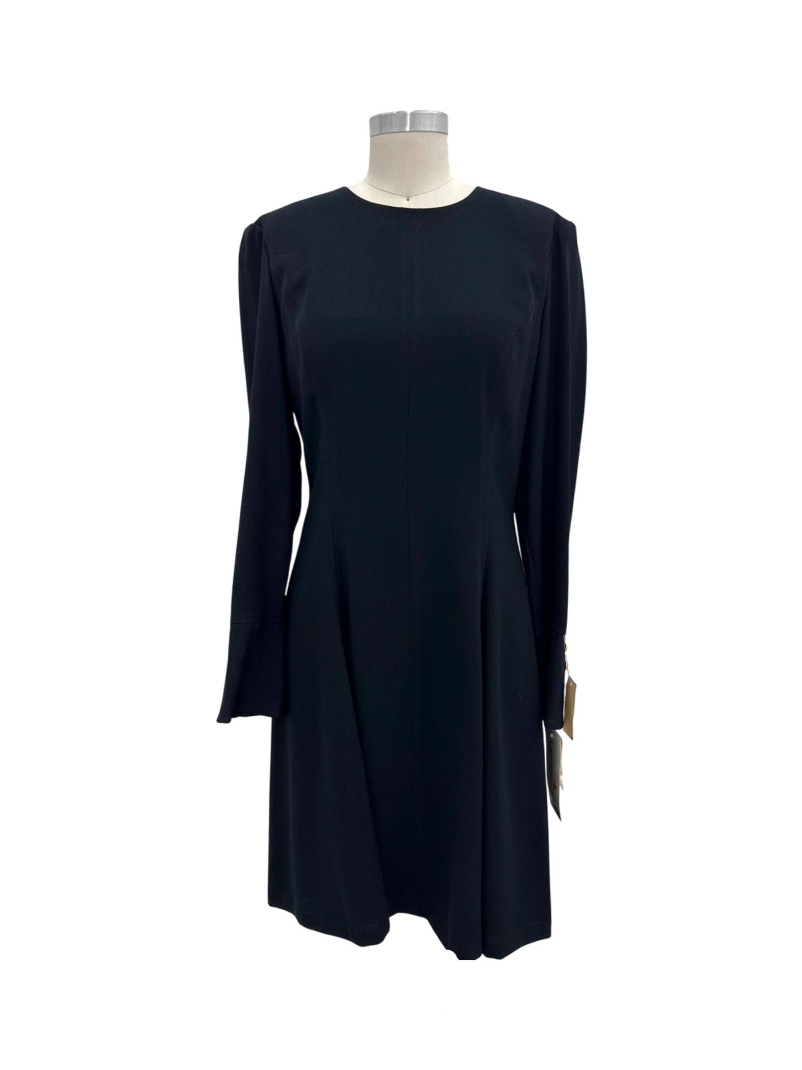 A sophisticated Liz Claiborne black dress, perfect for formal events or a night out. This vintage piece features a classic A-line silhouette, flattering long sleeves, and a comfortable fit. Crafted from a blend of triacetate and polyester for a quality feel. This dress is a timeless addition to any wardrobe, offering both style and comfort. A great find for those seeking a pre-owned designer piece.