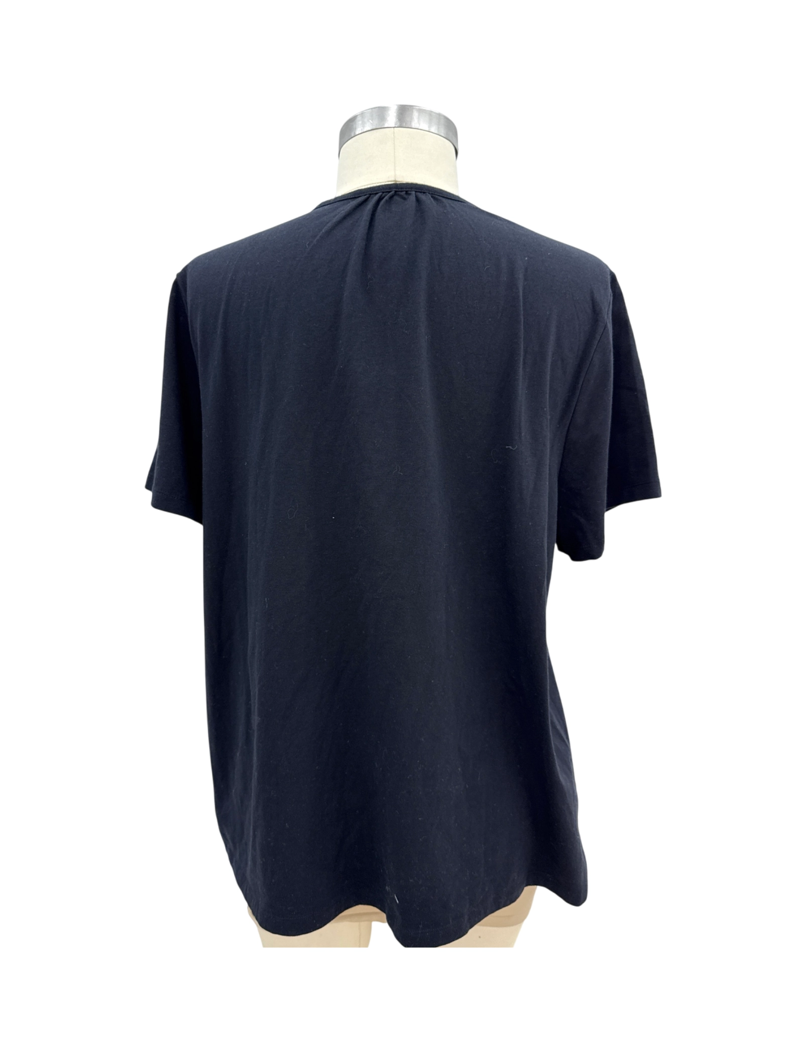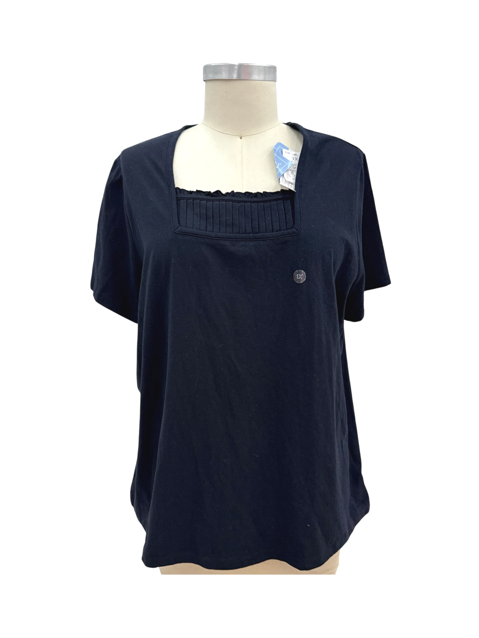 Elevate your everyday wardrobe with this Liz & Me T-shirt. This pre-owned top features a stylish square neckline and short sleeves, perfect for a casual yet chic look. Made from a comfortable cotton blend, this shirt is designed for all-day wear. The classic black color makes it easy to pair with any outfit. It's a great find for anyone seeking style and comfort at an affordable price.