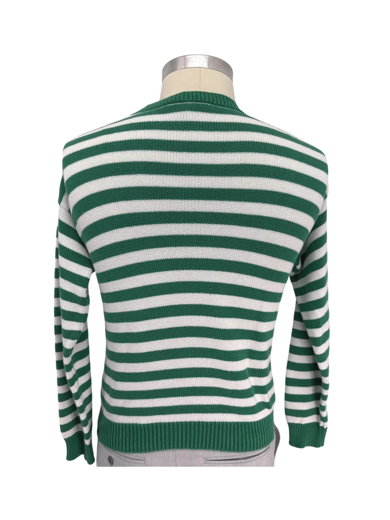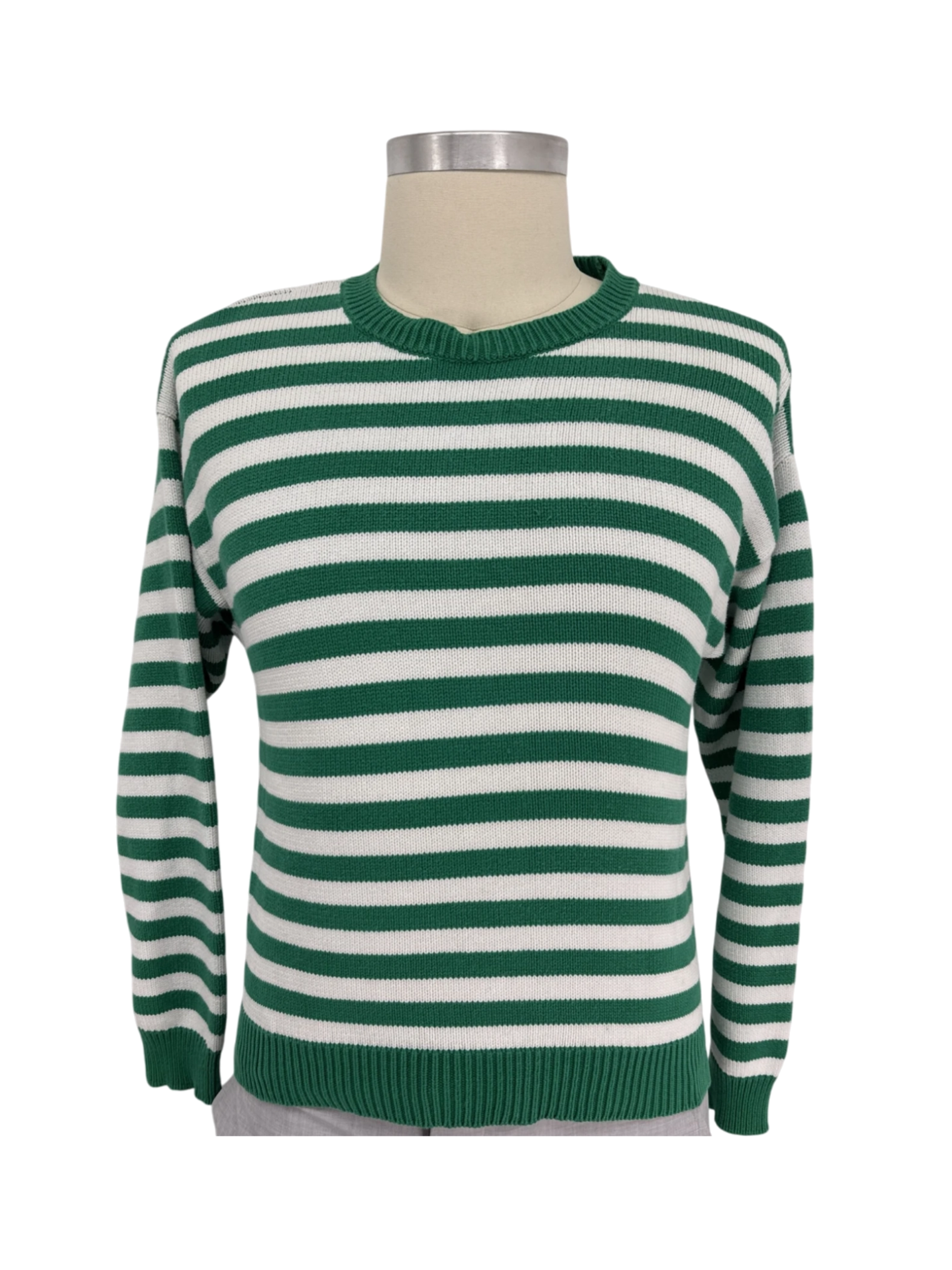 This pre-owned Lizsport sweater is a classic addition to any wardrobe. Crafted from 100% cotton, it offers both comfort and durability. The sweater features a timeless striped pattern in green and white, a crew neck, and long sleeves, making it perfect for cooler seasons. The pullover design ensures easy wear, while the size S offers a flattering fit. This versatile sweater is ideal for casual outings or layering under a jacket.