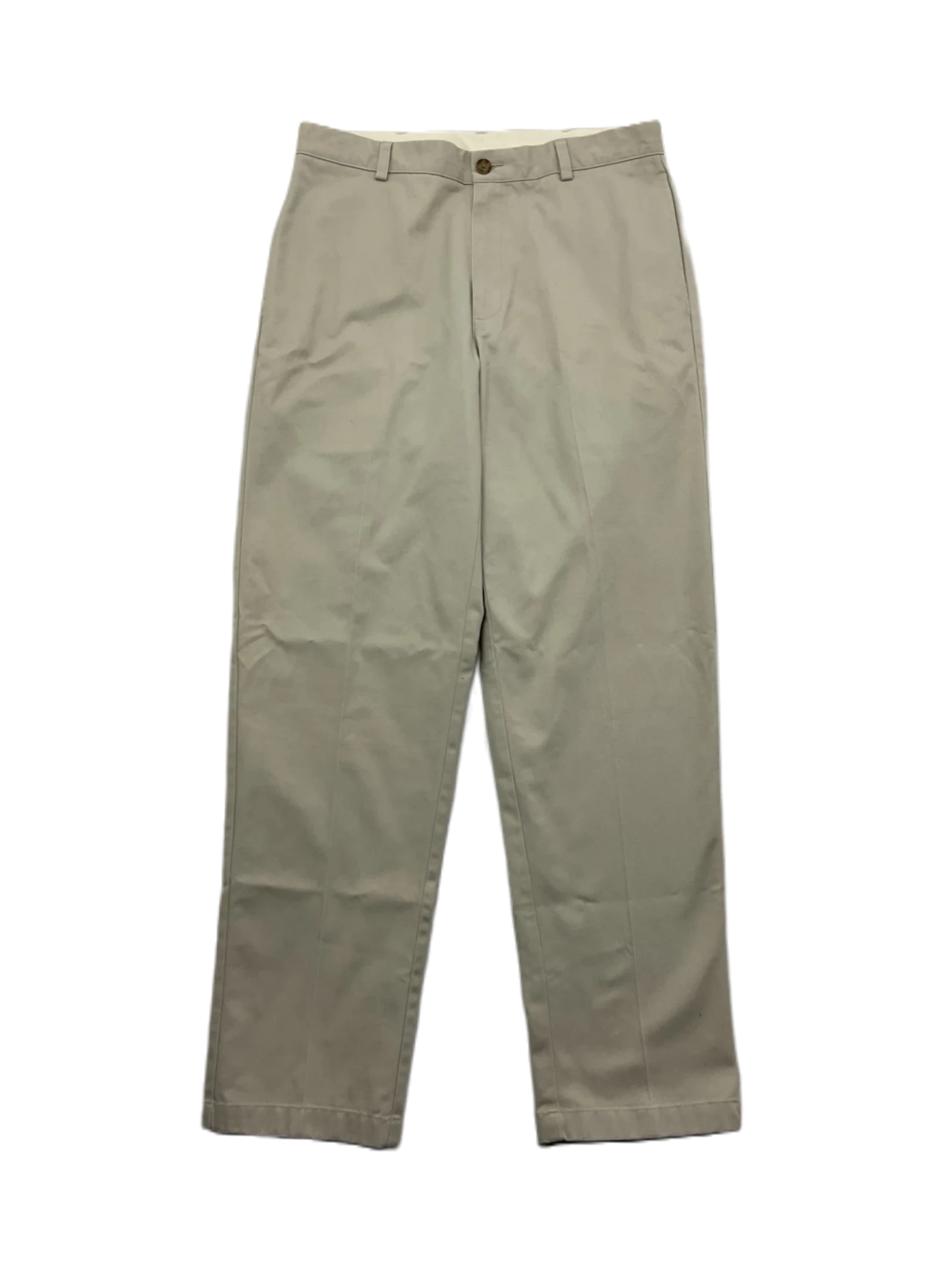 These are men's beige traditional fit chino pants. The arrow in the photo indicates a minor blemish on the fabric, which does not affect the garment's quality or wearability. It adds unique character, making it a comfortable and versatile option for various occasions.