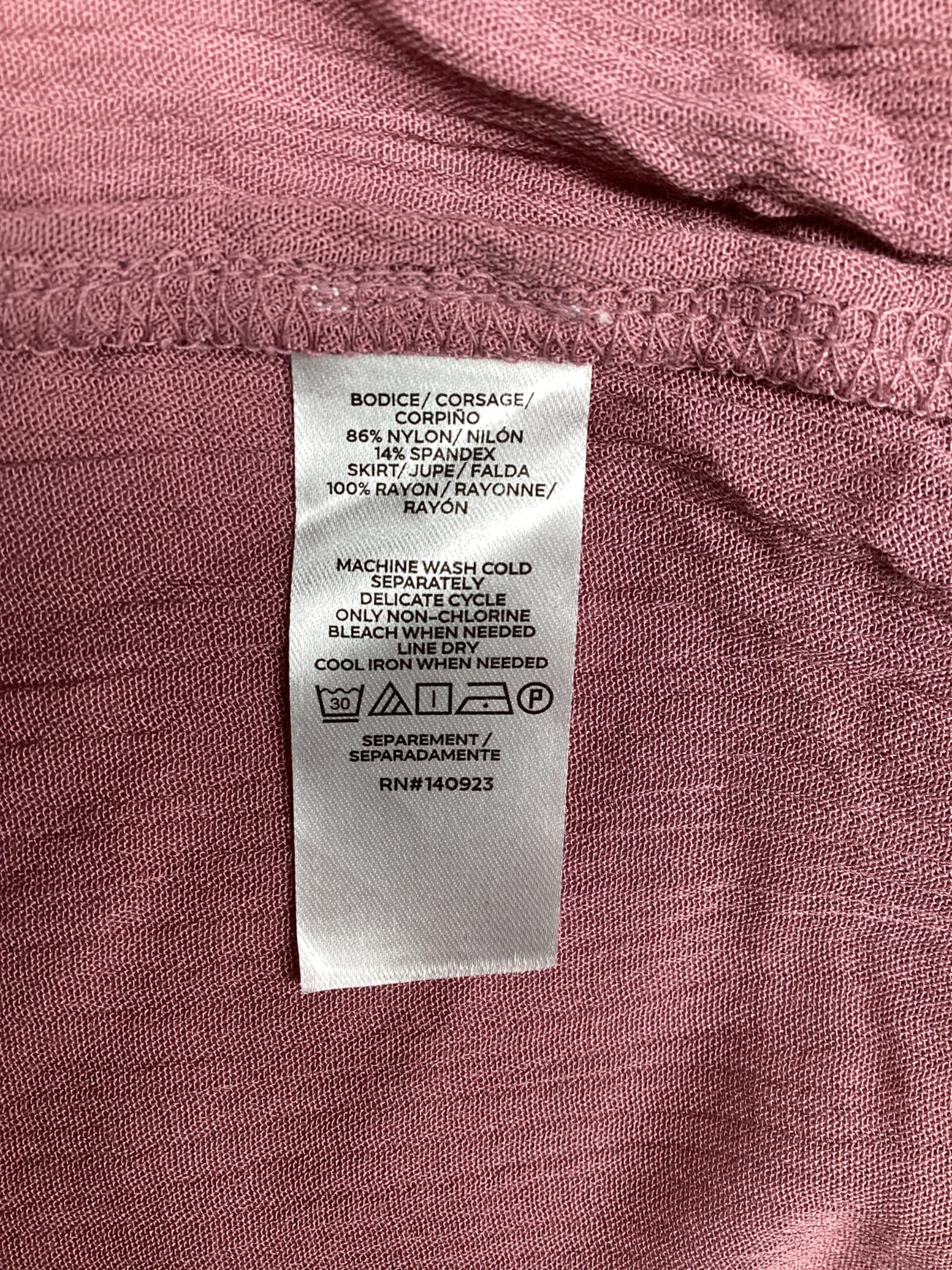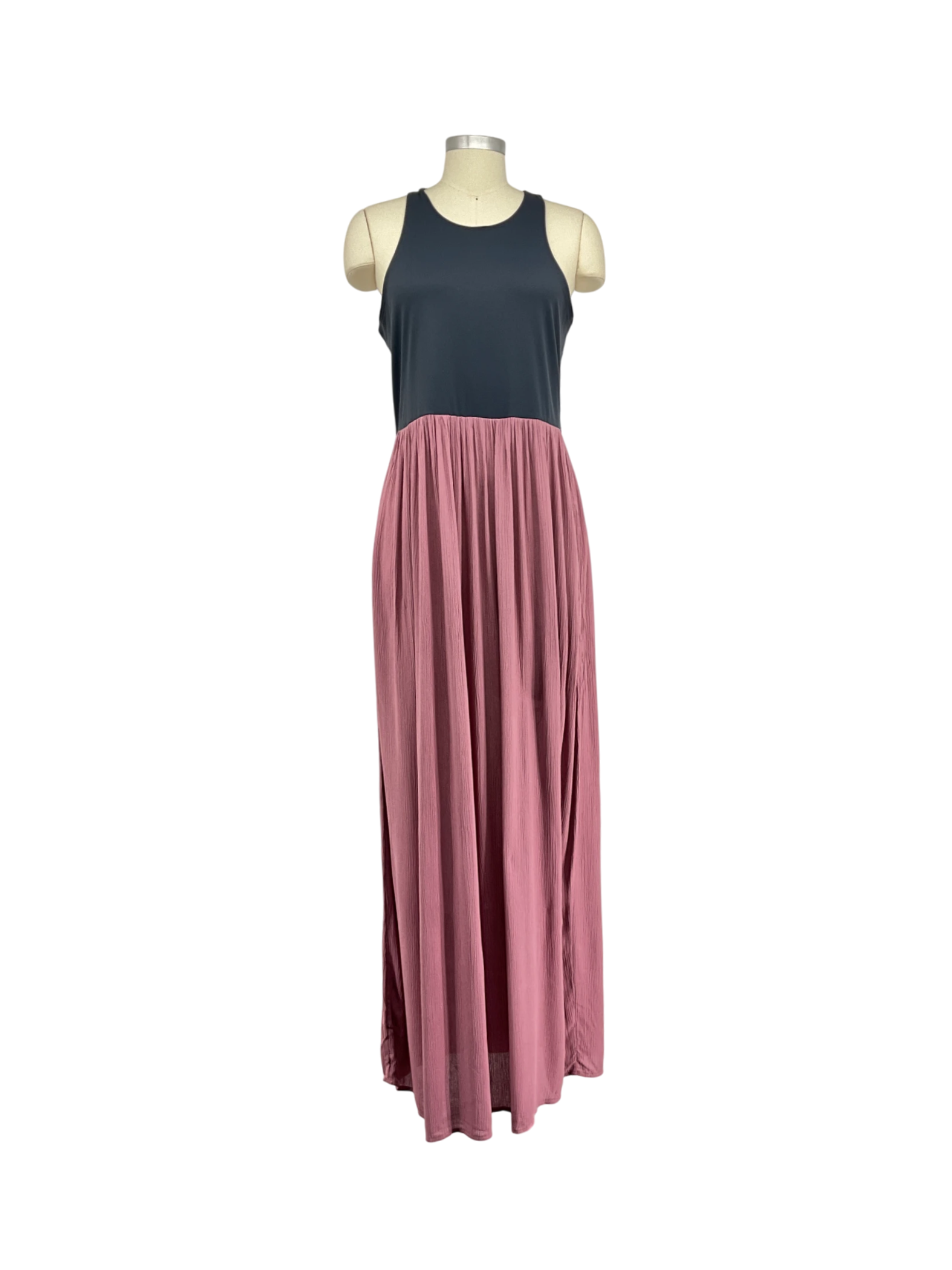 Loft women's maxi dress with a pink paperbag skirt, and a black sleeveless boat neck, in size L.