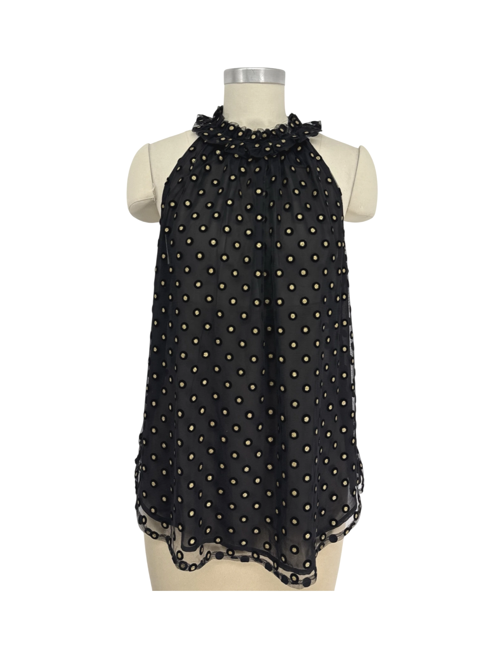 Must have - Elevate your wardrobe with this stylish LOFT blouse. This pre-owned top features a chic polka dot pattern on a black background, perfect for any occasion. Its sleeveless design and comfortable fabric make it ideal for warmer weather. The blouse's versatile design allows you to pair it with pants or skirts for a polished look.