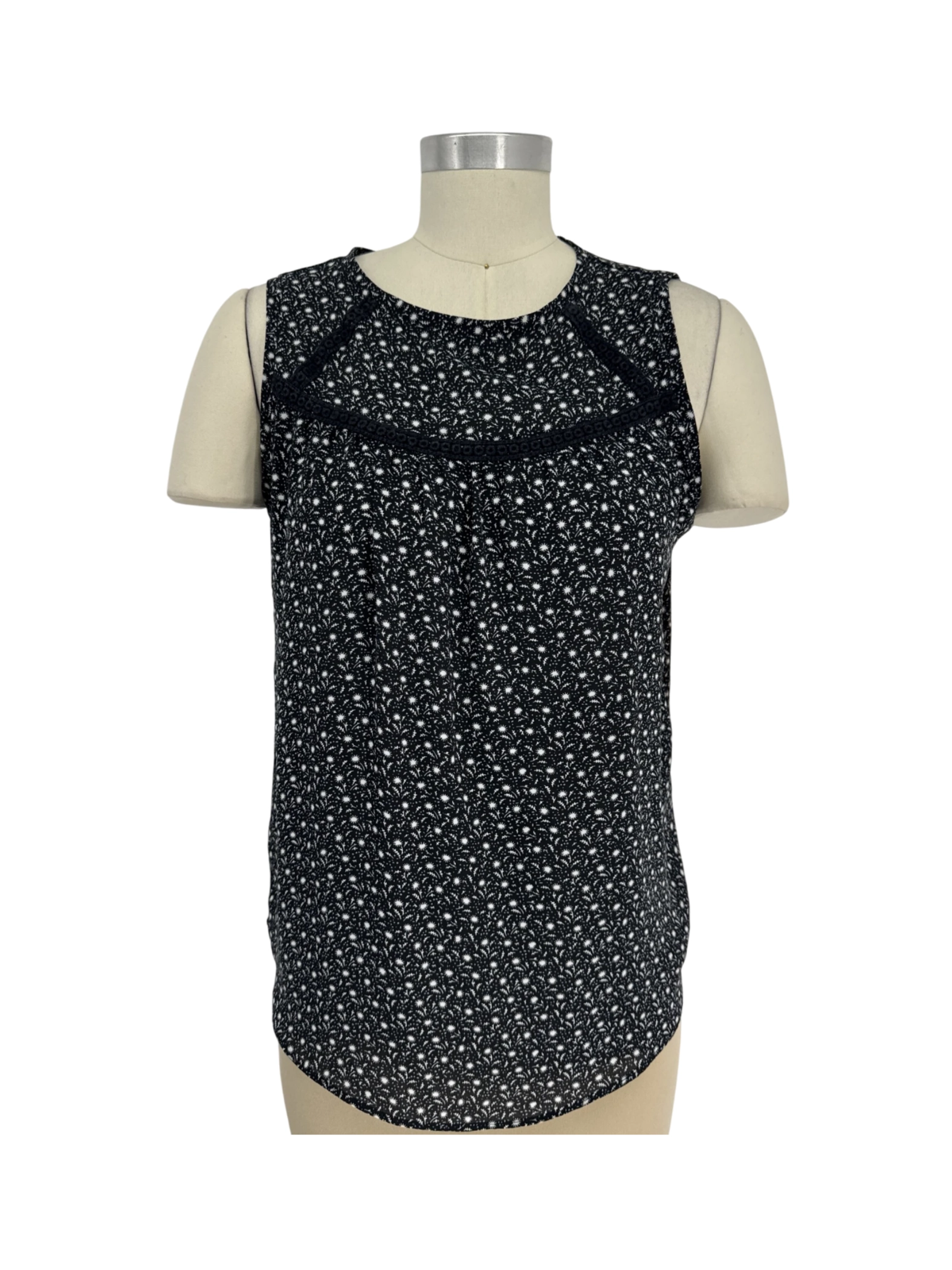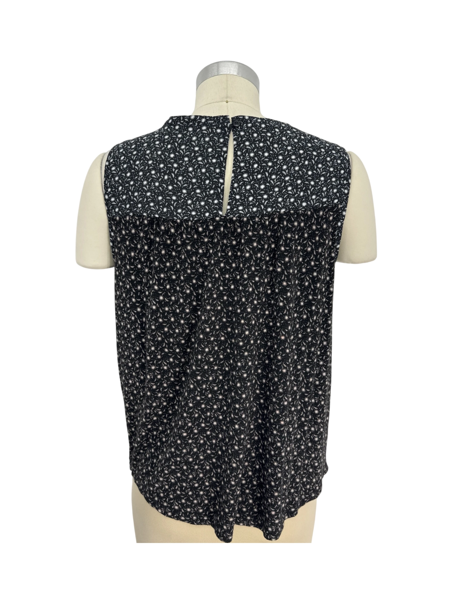 This pre-owned LOFT sleeveless top features a beautiful black floral pattern, perfect for a chic and versatile addition to any wardrobe. Crafted from a blend of polyester and rayon, this top offers a comfortable and flattering fit. Its round neckline and sleeveless design make it ideal for warmer weather. The blouse is in excellent condition, ready to elevate your style with ease. This top is stylish and easy to care for, it's a great addition to your wardrobe.