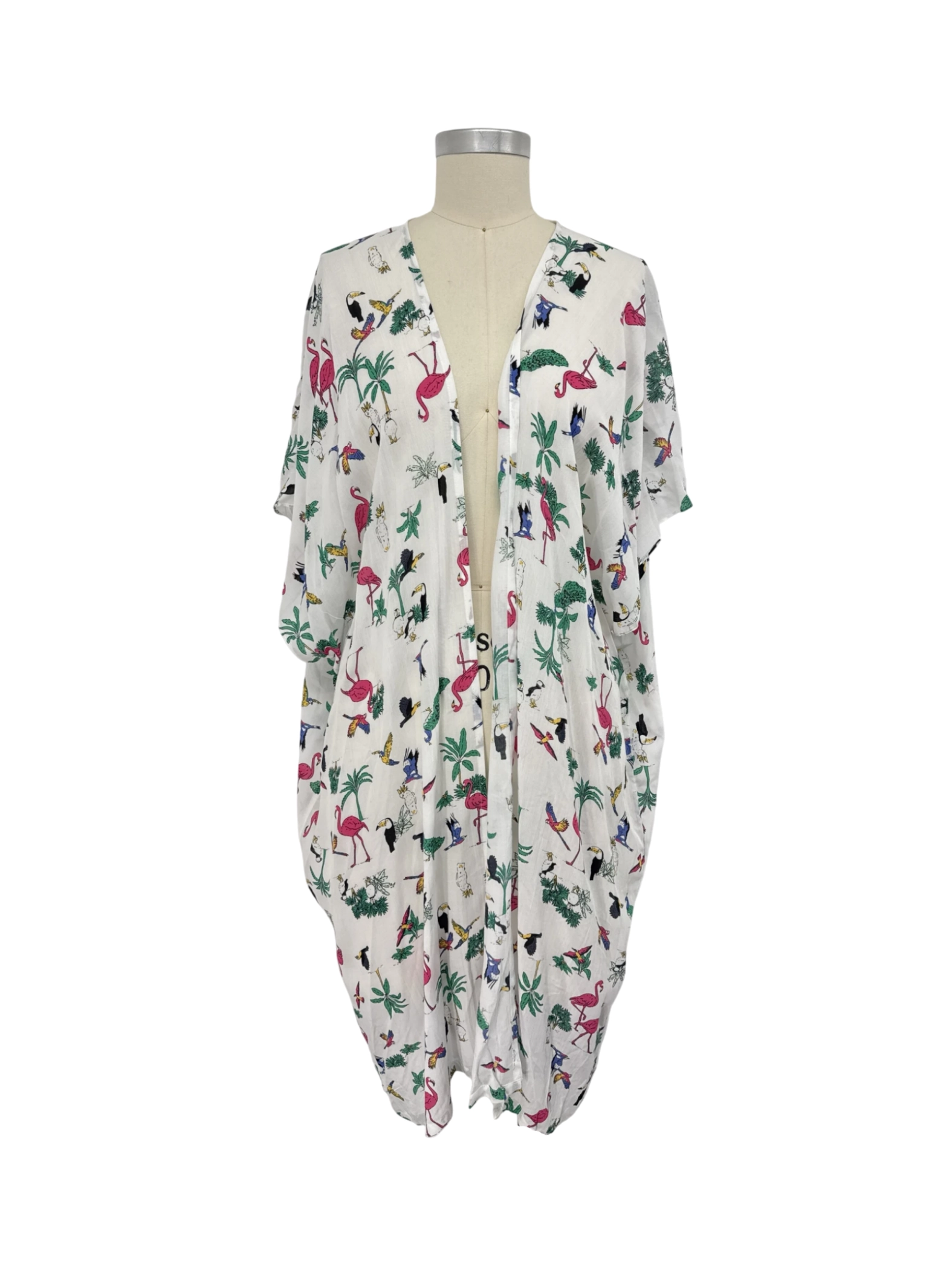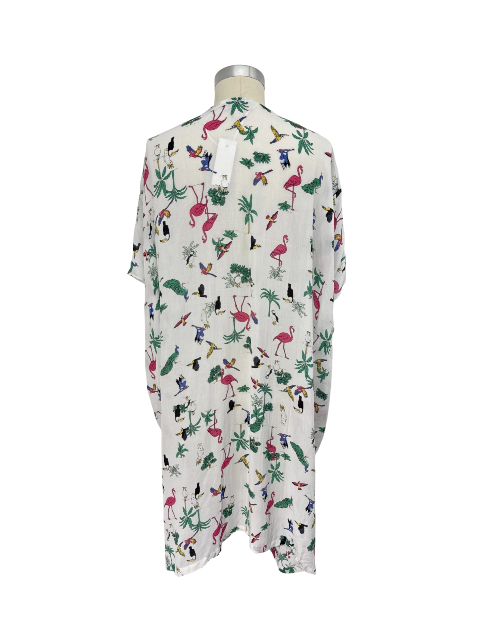 This pre-owned LOFT tunic top is a perfect addition to your summer wardrobe. Crafted from a lightweight modal fabric, it features a vibrant floral print with flamingo and bird accents. The open-front design and short sleeves make it an ideal layering piece for warmer weather. Size XS/S, this tunic is designed for a comfortable and flattering fit. This top offers a breezy, stylish look. - This pre-owned Loft outlet blouse is perfect for a breezy summer day. Featuring a unique floral pattern, including vibrant birds, this top is stylish and comfortable. It's made from a soft Modal fabric and has a relaxed fit. Ideal for layering over a tank top or wearing on its own, this blouse adds a touch of tropical flair to any outfit. This piece is in excellent condition, ready to elevate your wardrobe with a touch of elegance and fun.