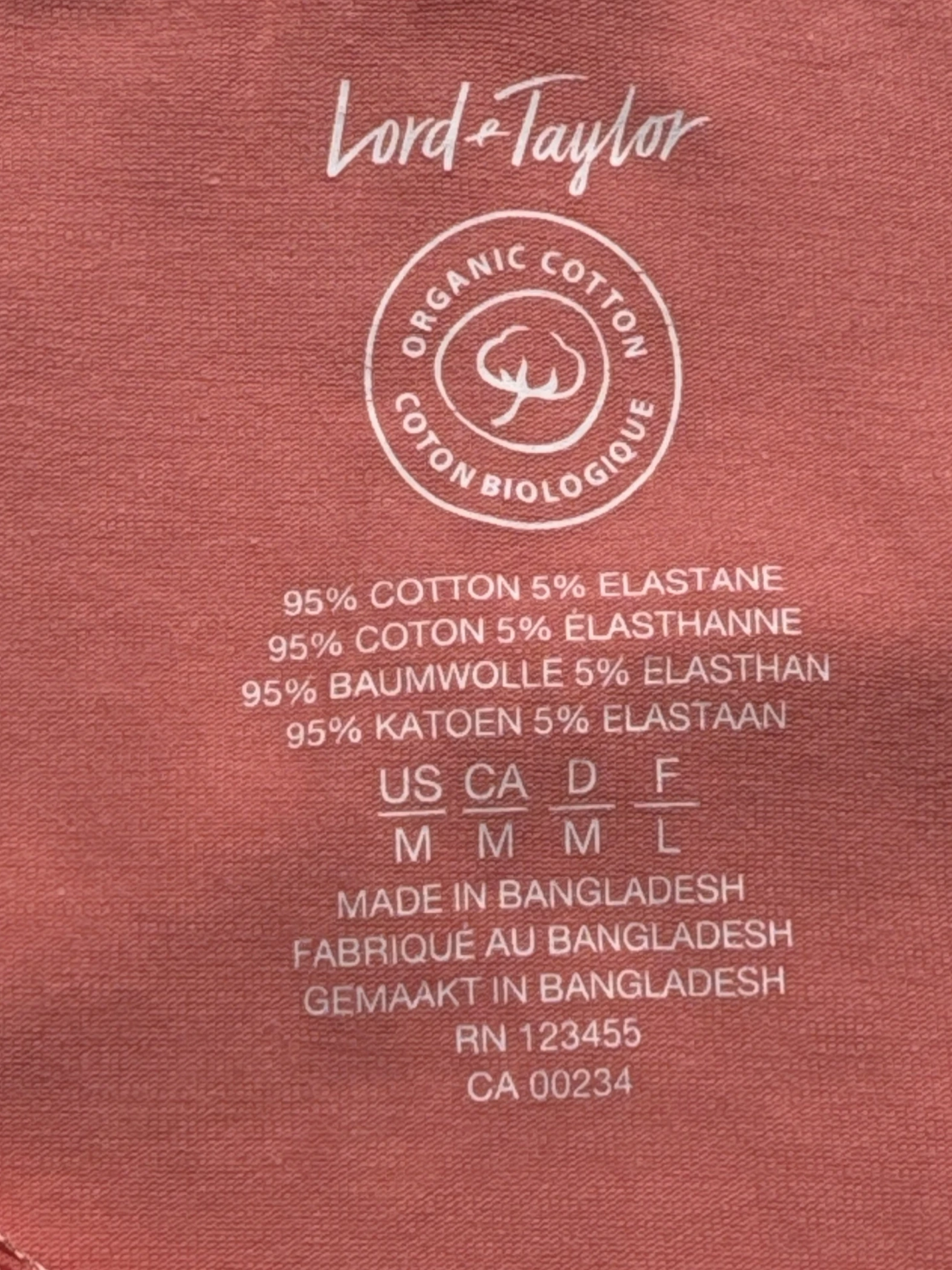 This Lord & Taylor T-shirt is a stylish and comfortable addition to any wardrobe. The shirt is made of organic cotton and spandex. Perfect for warm weather, the shirt features a classic round neck and short sleeves. This pre-owned shirt is in excellent condition, making it a great sustainable fashion choice. Ideal for casual outings or layering.