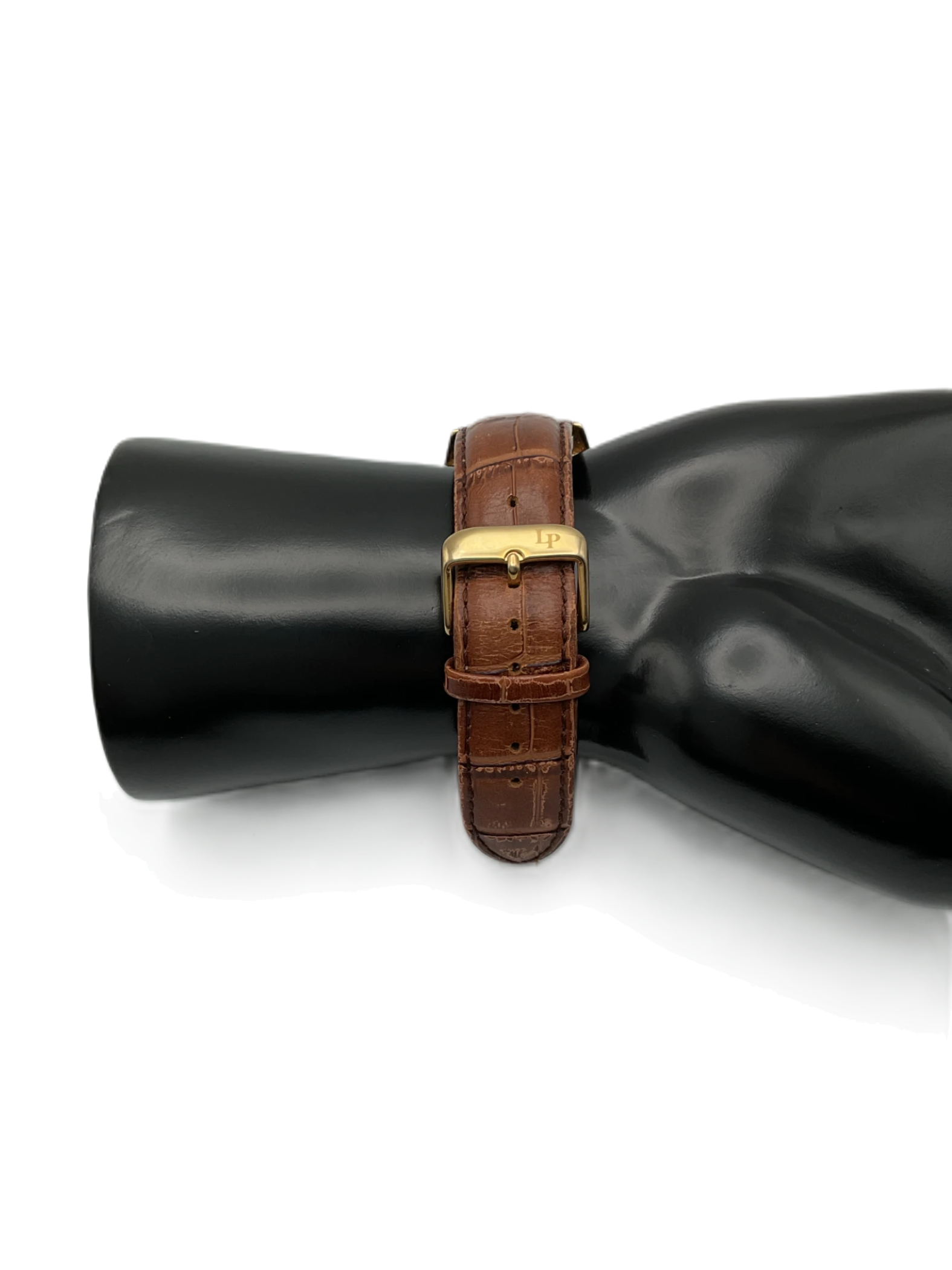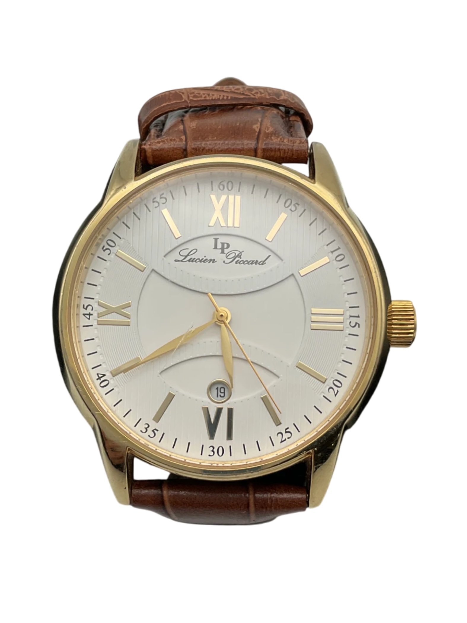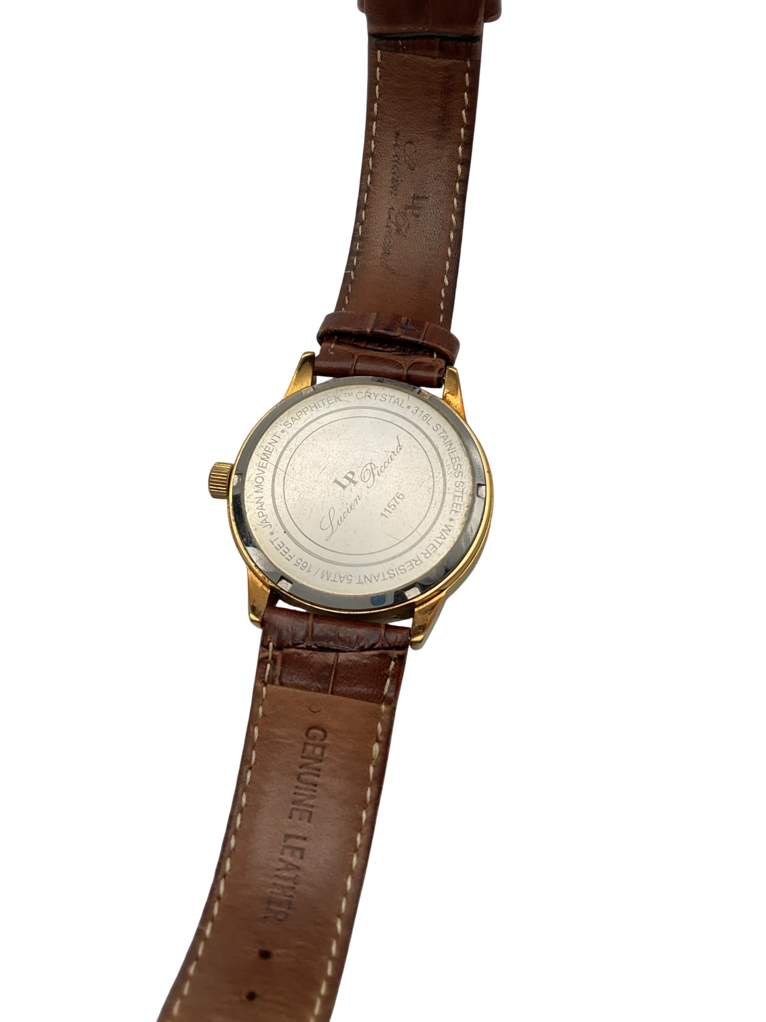 The Lucien Piccard Roman watch features a goldtone textured stepped band in brown color.