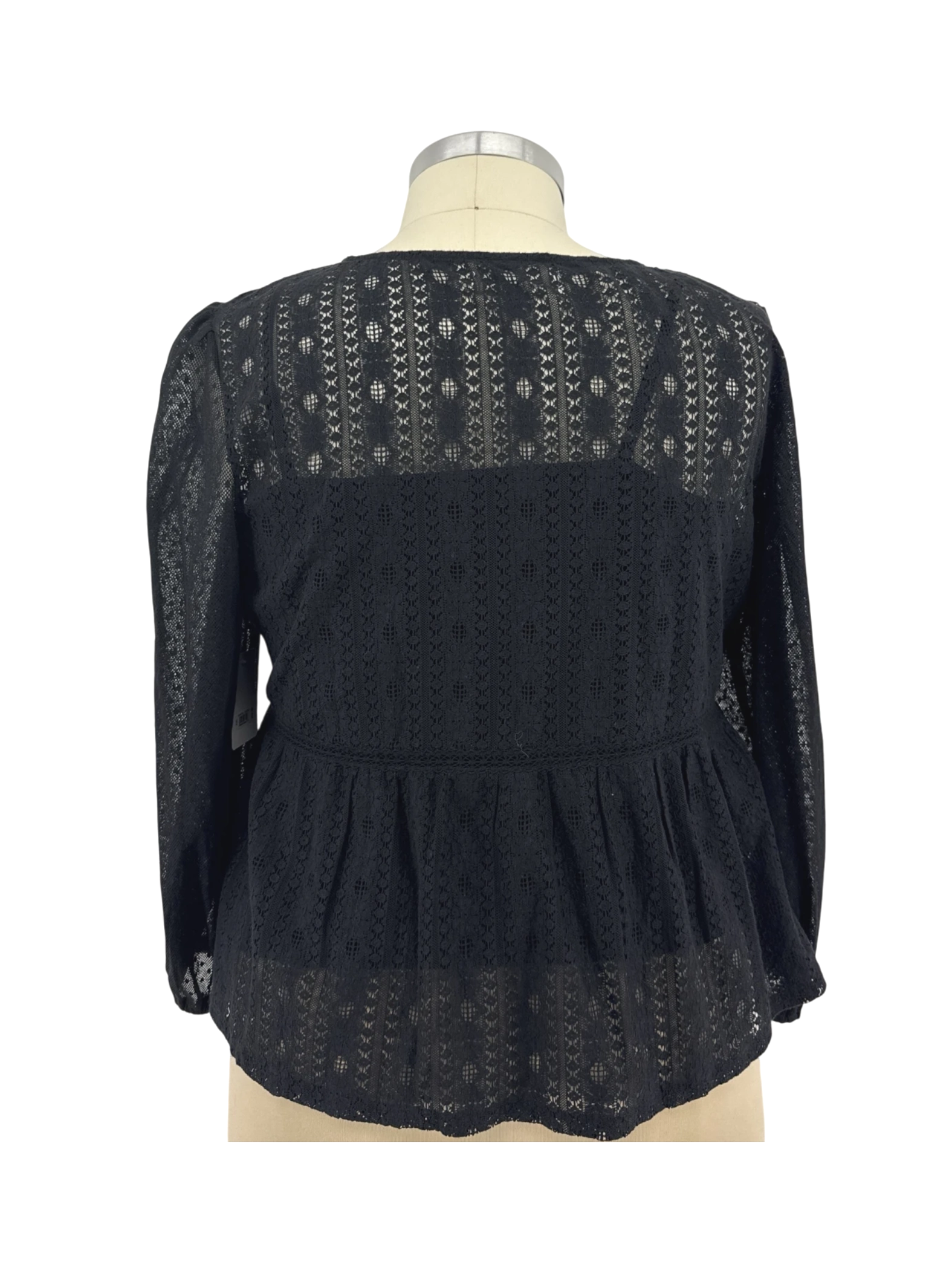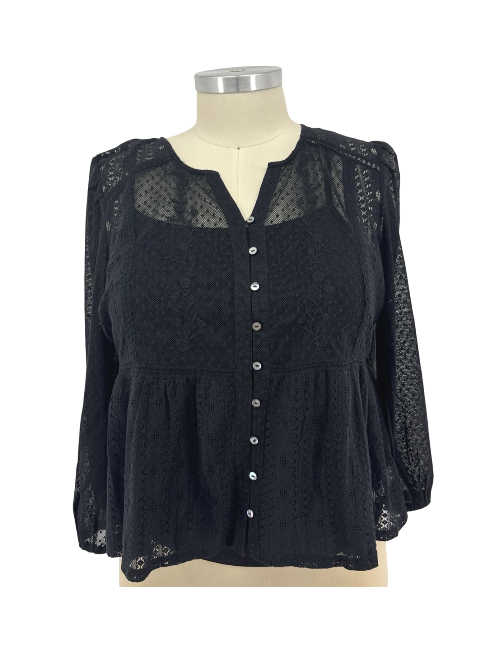 Elevate your wardrobe with this stylish Lucky Brand blouse, perfect for any occasion. This pre-owned top features a delicate lace pattern, a flattering V-neckline, and long sleeves for a chic look. Made from lightweight polyester, it's ideal for warm weather. The button-up design adds a touch of sophistication, while the XXL size ensures a comfortable fit. This versatile blouse transitions seamlessly from casual to dressy.