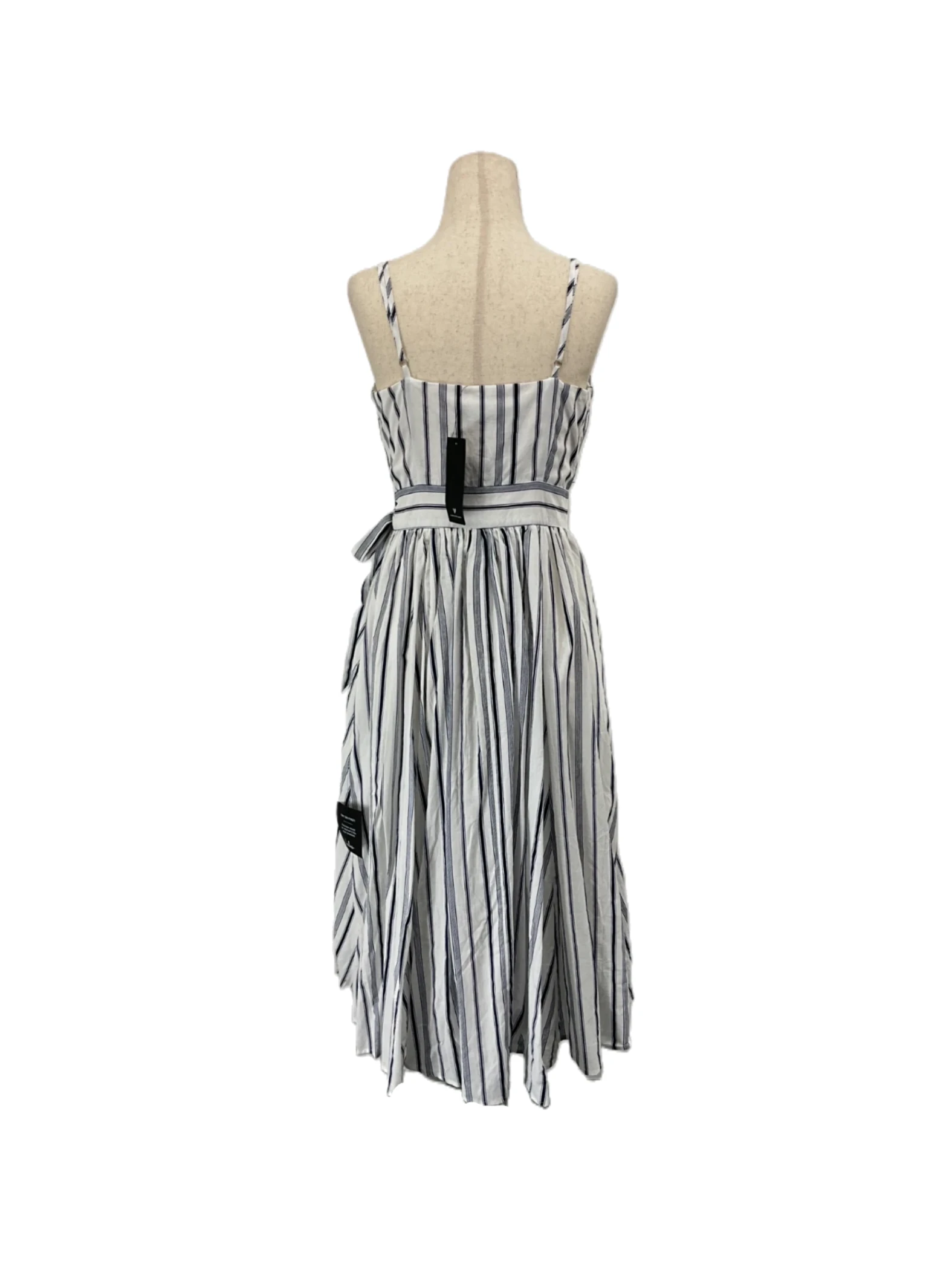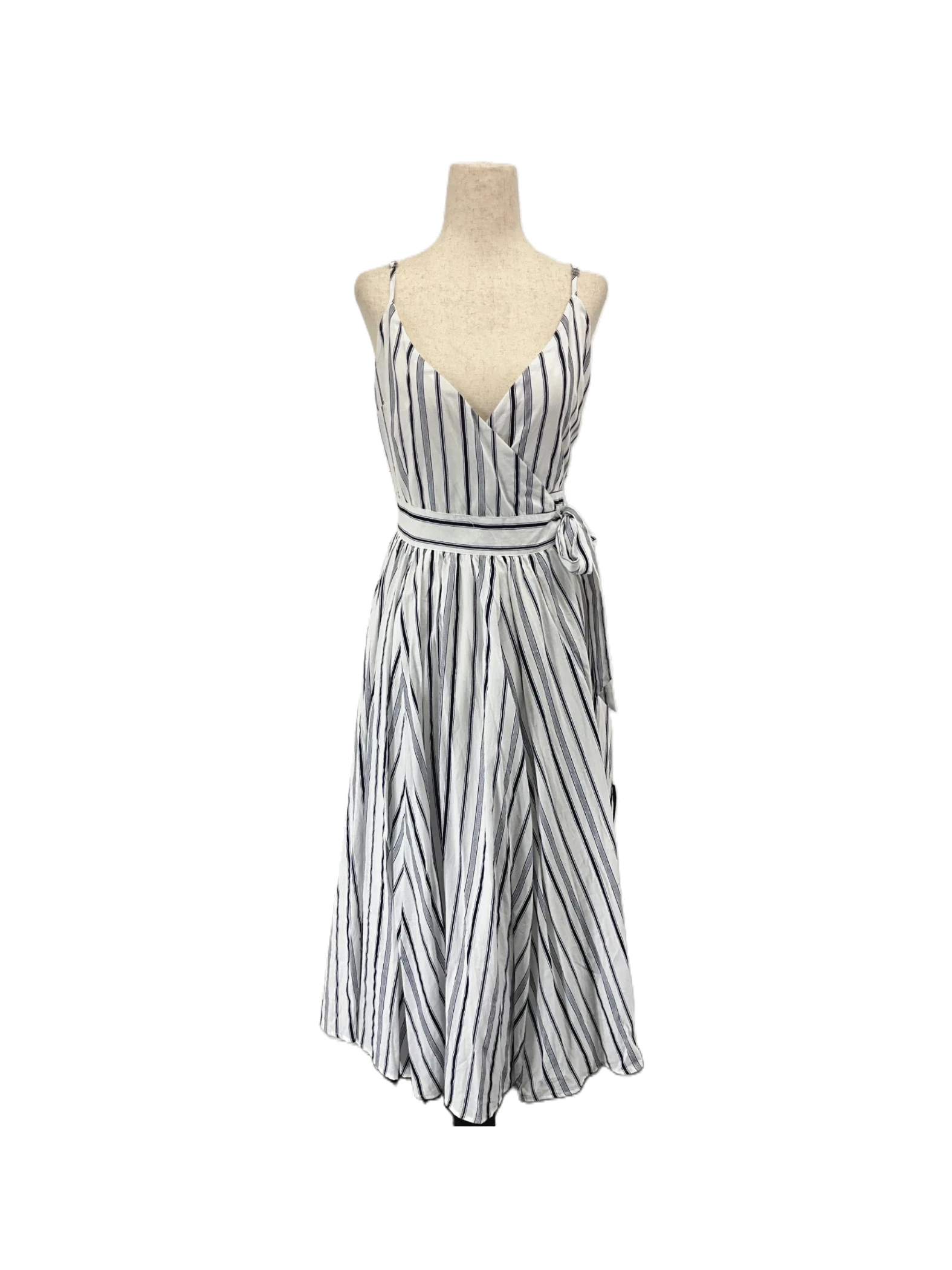 This is a women's striped sleeveless summer dress with a V-neck, high waist, and midi length.
