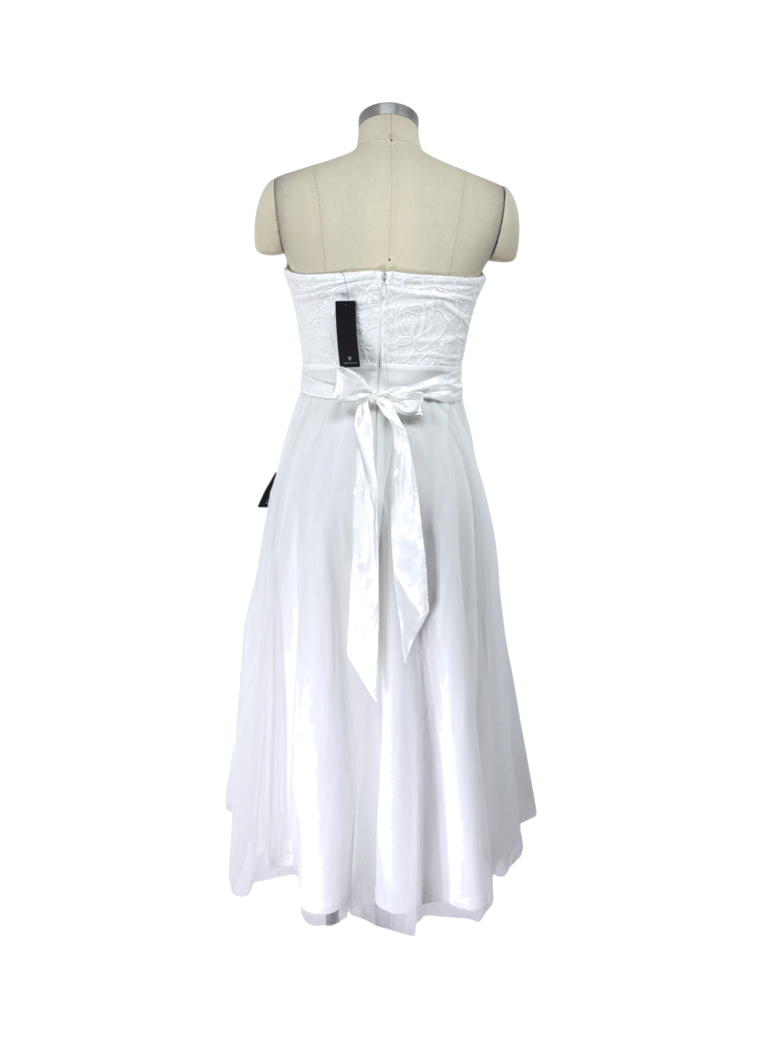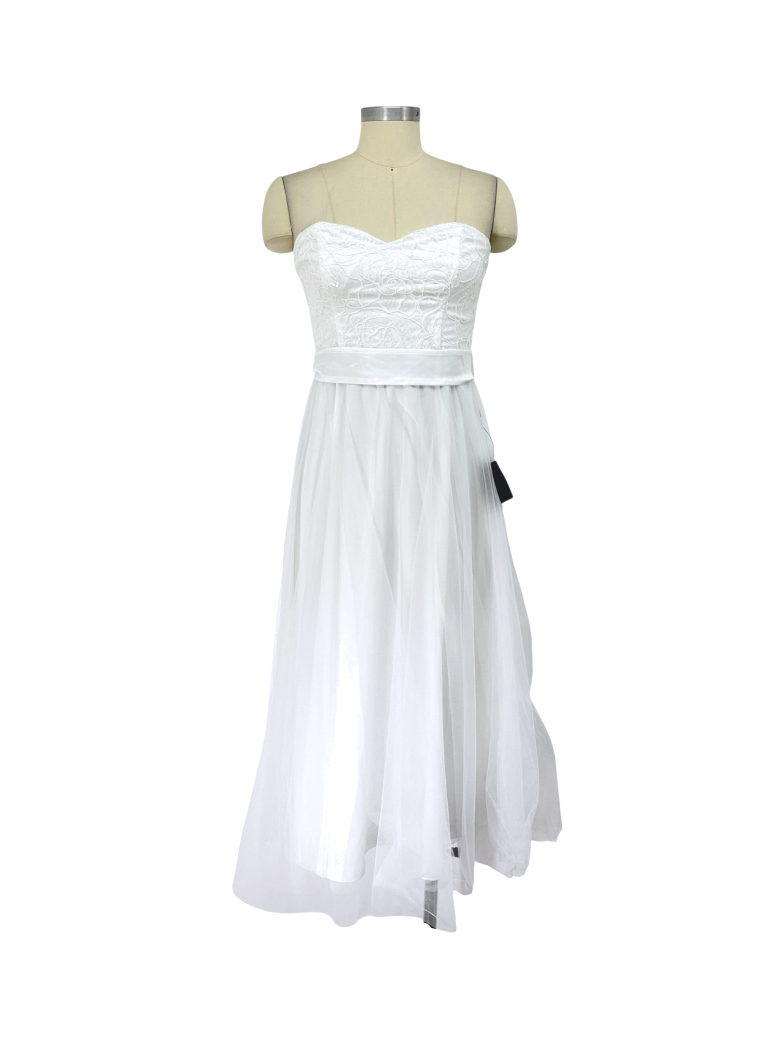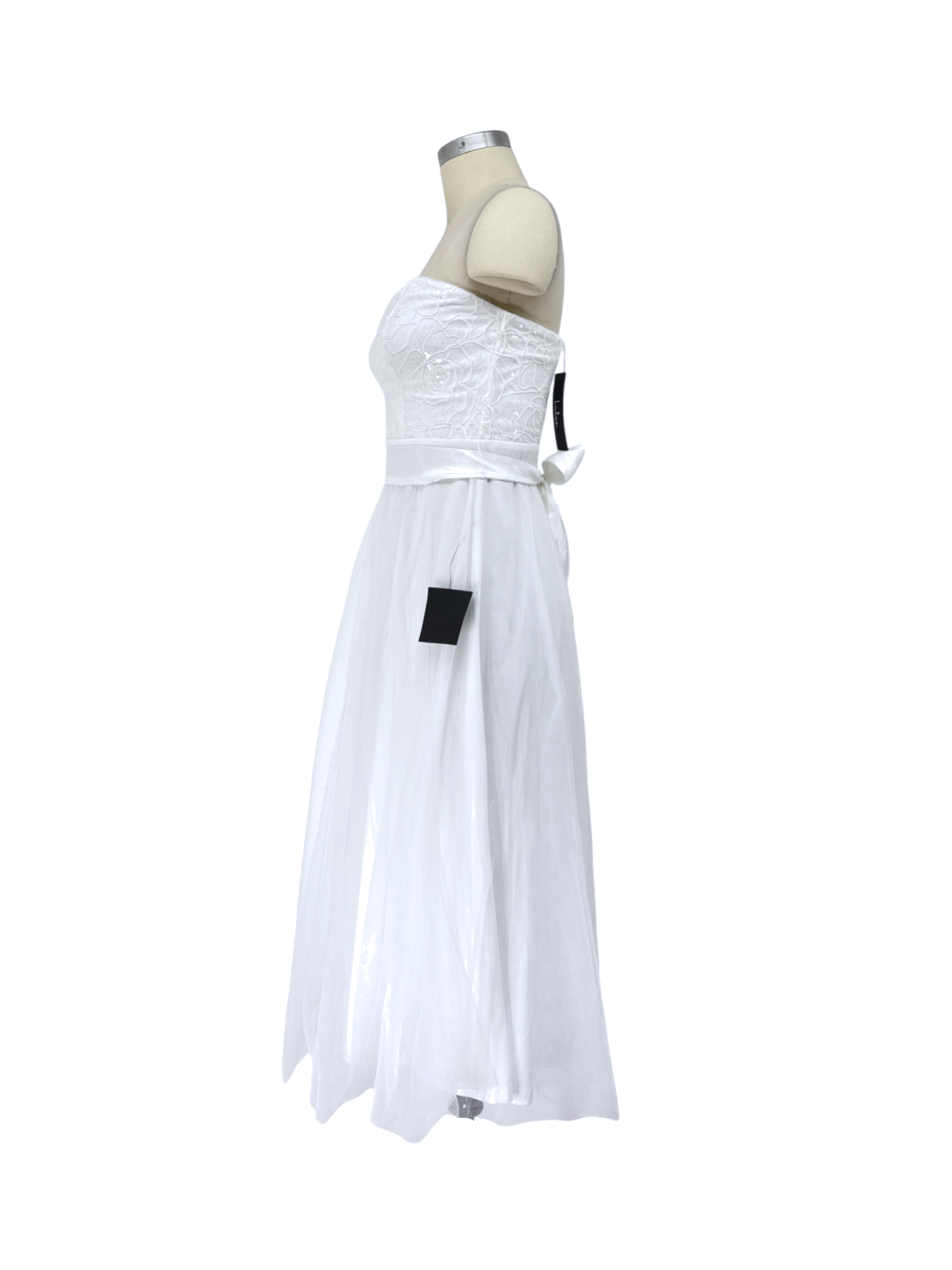 This stunning pre-owned Lulus dress is perfect for a special occasion. Featuring a beautiful white color, this maxi dress boasts a strapless neckline and a flowing skirt, ideal for summer events. Crafted from delicate polyester, it promises comfort and elegance. The dress includes a detailed bodice adding a touch of sophistication. A size S, it offers a flattering fit. This dress will make you feel confident and chic at any party.