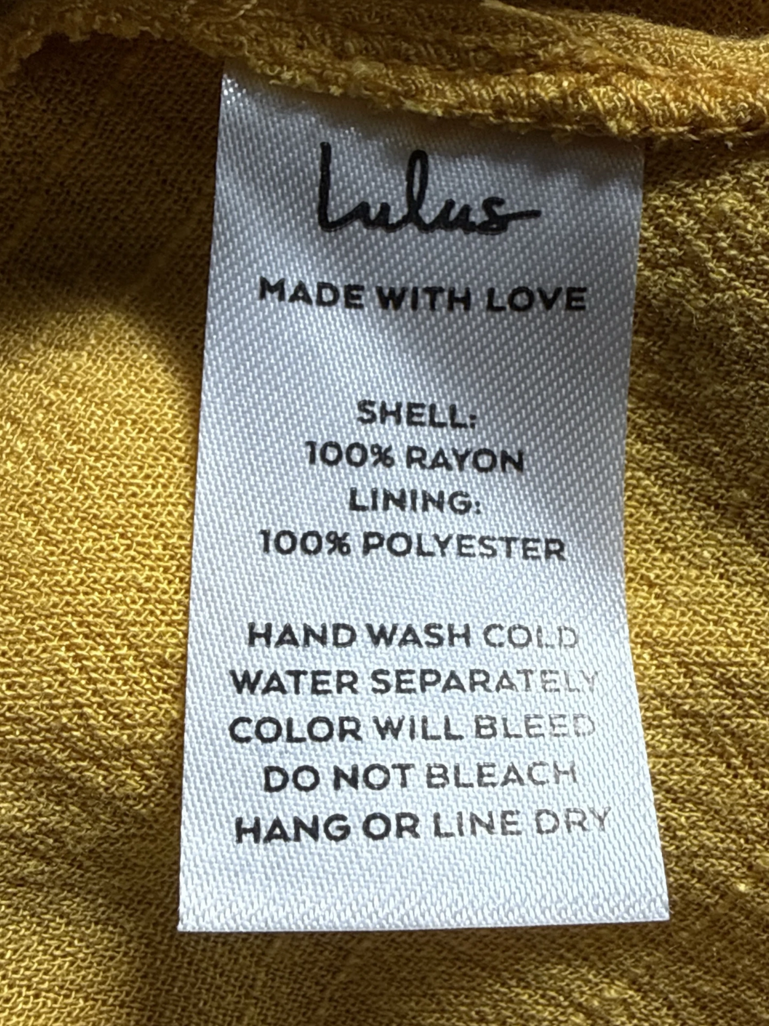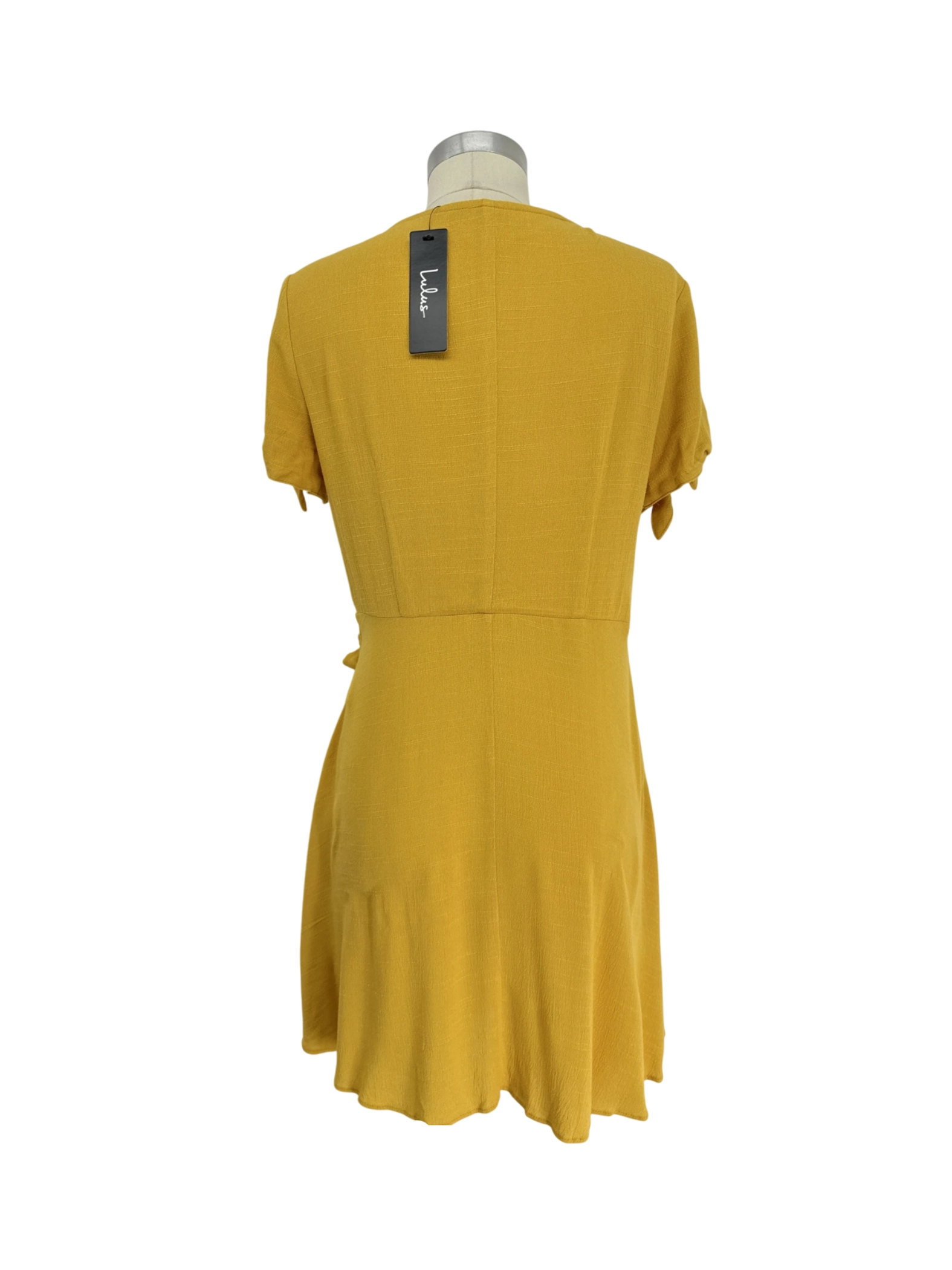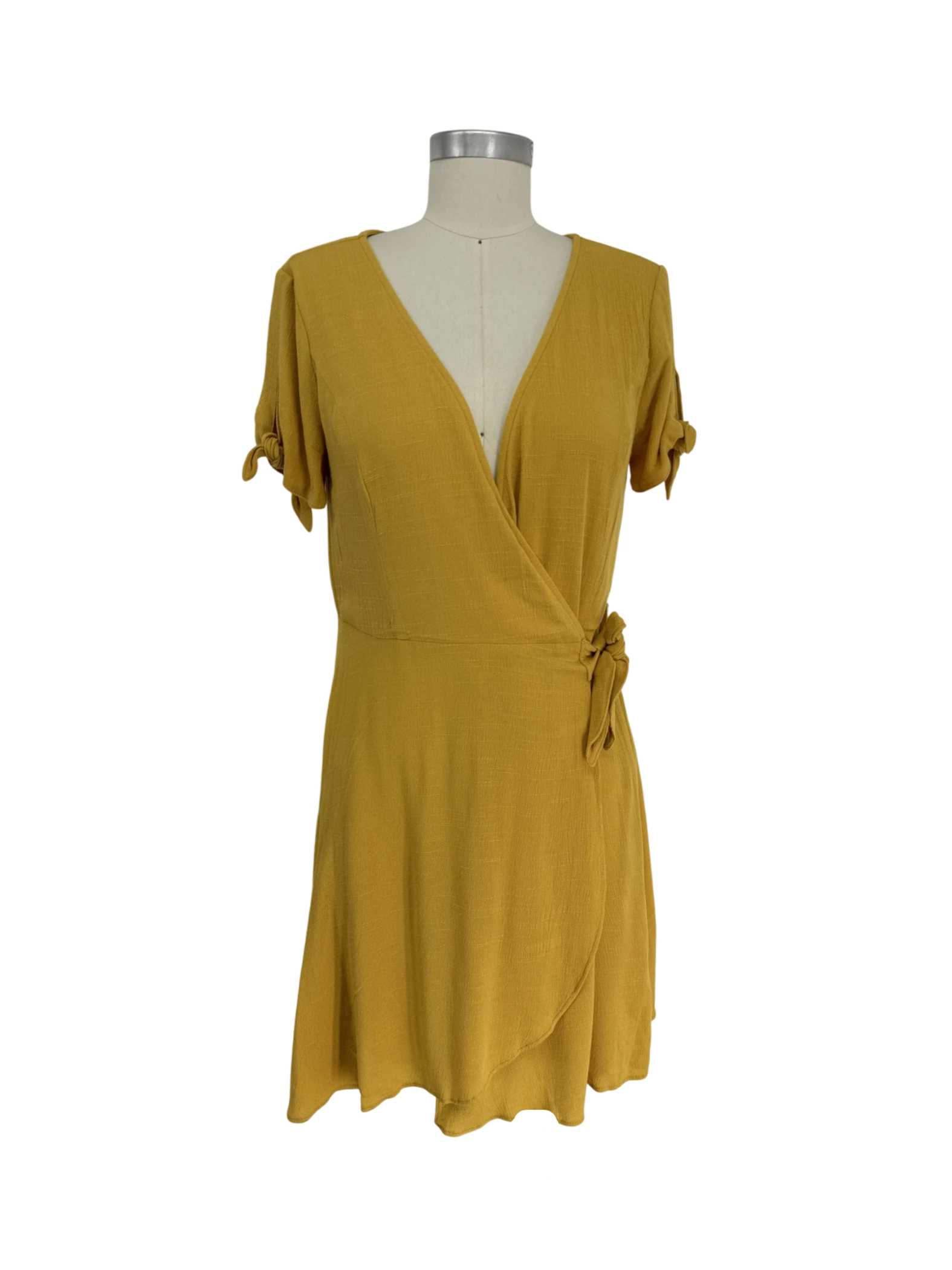 This stylish Lulus wrap dress is perfect for warm weather. The dress features a flattering wrap design and a vibrant mustard color. It is made of a comfortable rayon blend, this dress is perfect for a casual day out, brunch with friends, or even a summer party. The short sleeves and mini skirt length add to its charm, while the V-neckline completes the look.