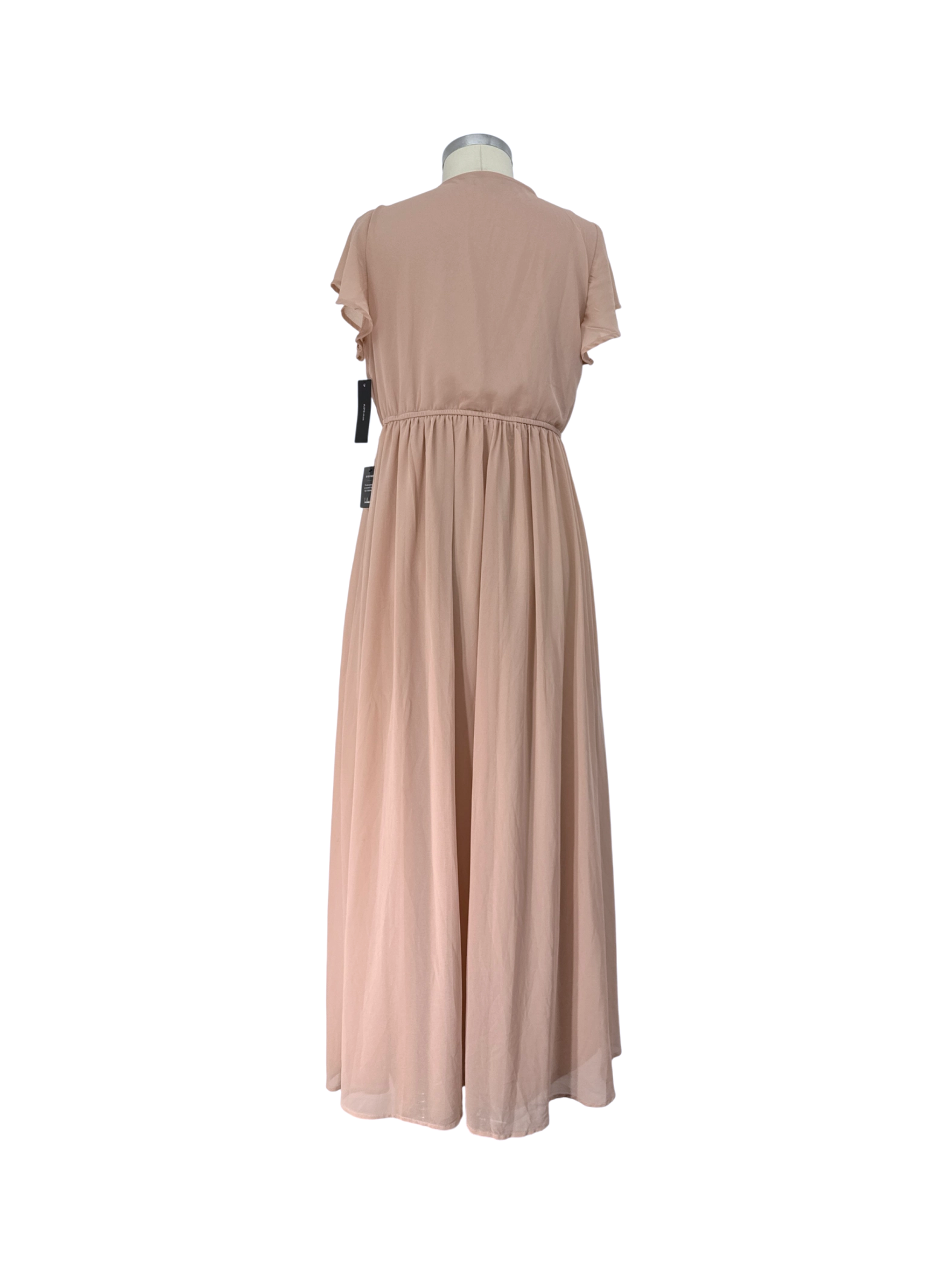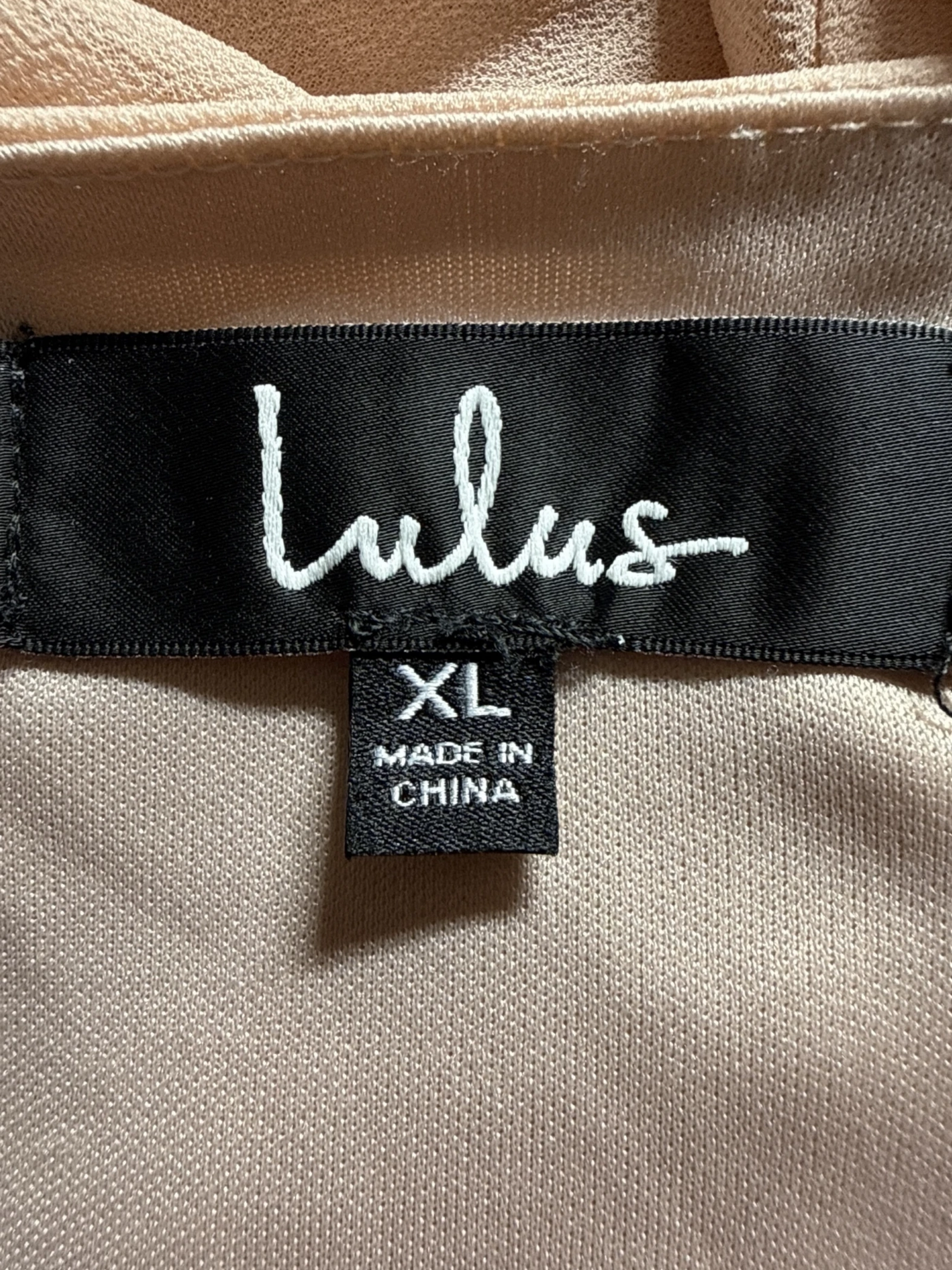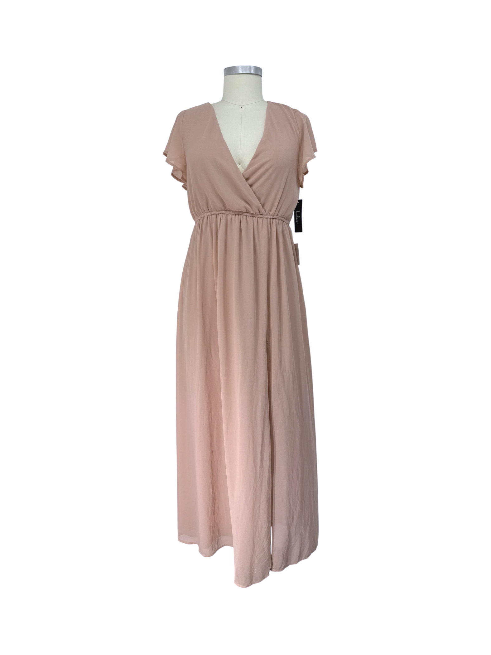 This beautiful pre-owned Lulus maxi dress is perfect for warm weather occasions. It features a flattering A-line silhouette, short sleeves, and a delicate V-neck. Crafted from a lightweight, flowy polyester fabric in a lovely beige color. A great addition to any wardrobe for a chic, comfortable, and stylish look. Ideal for summer days and spring evenings.