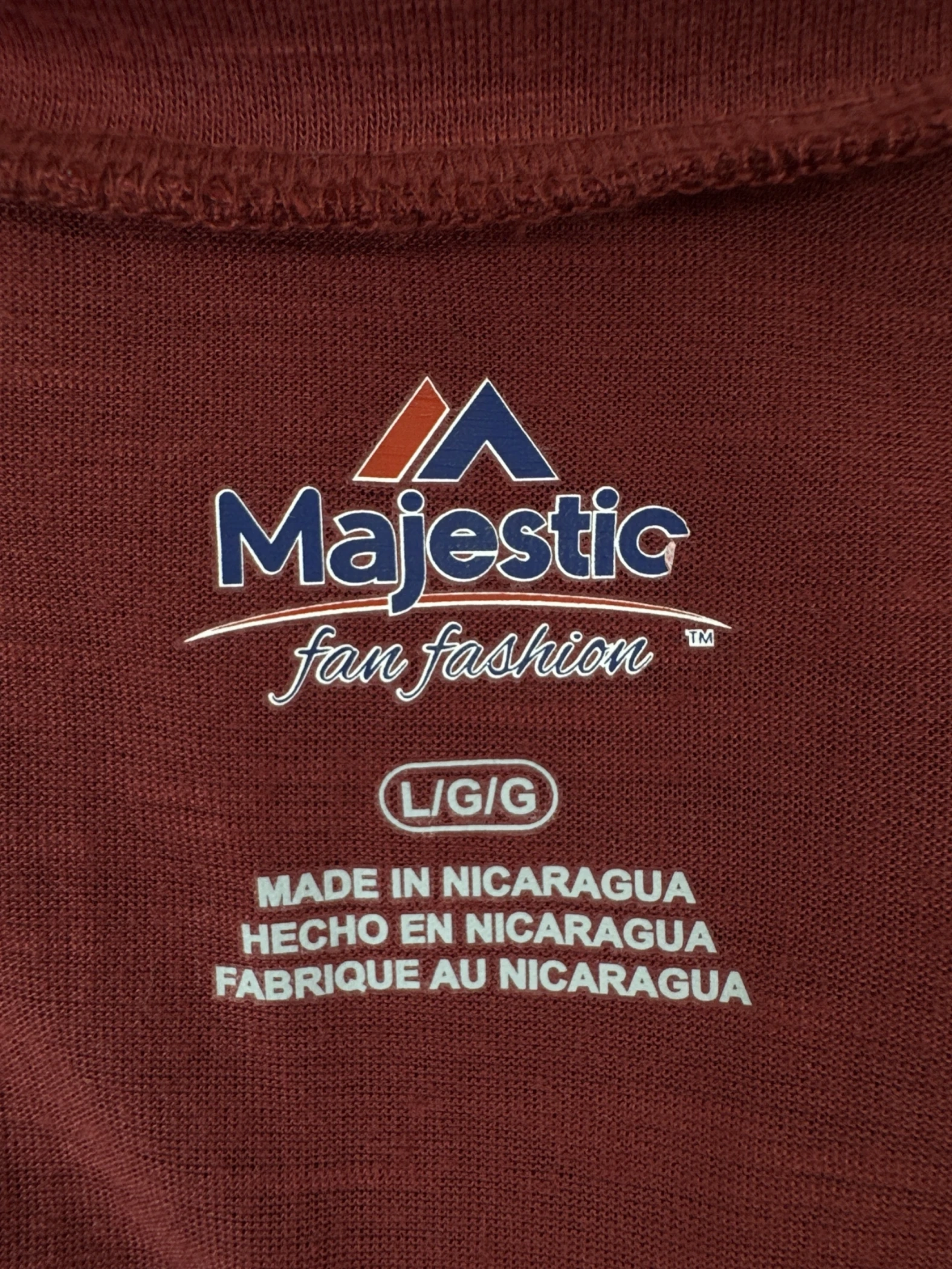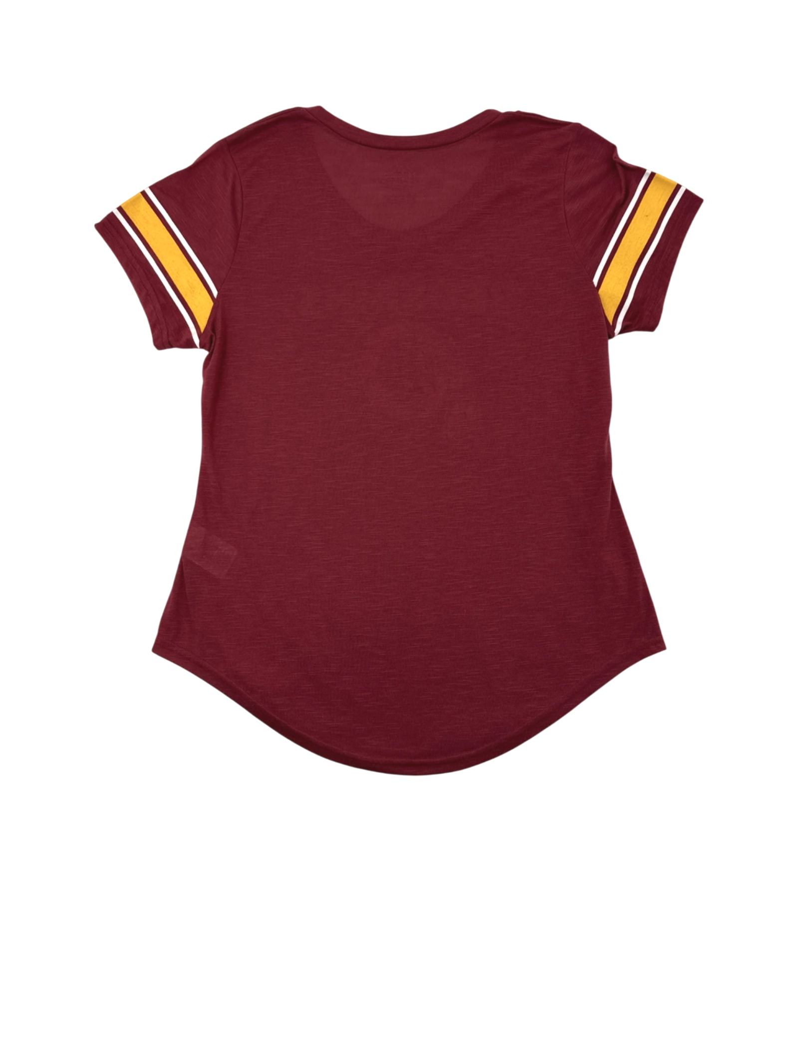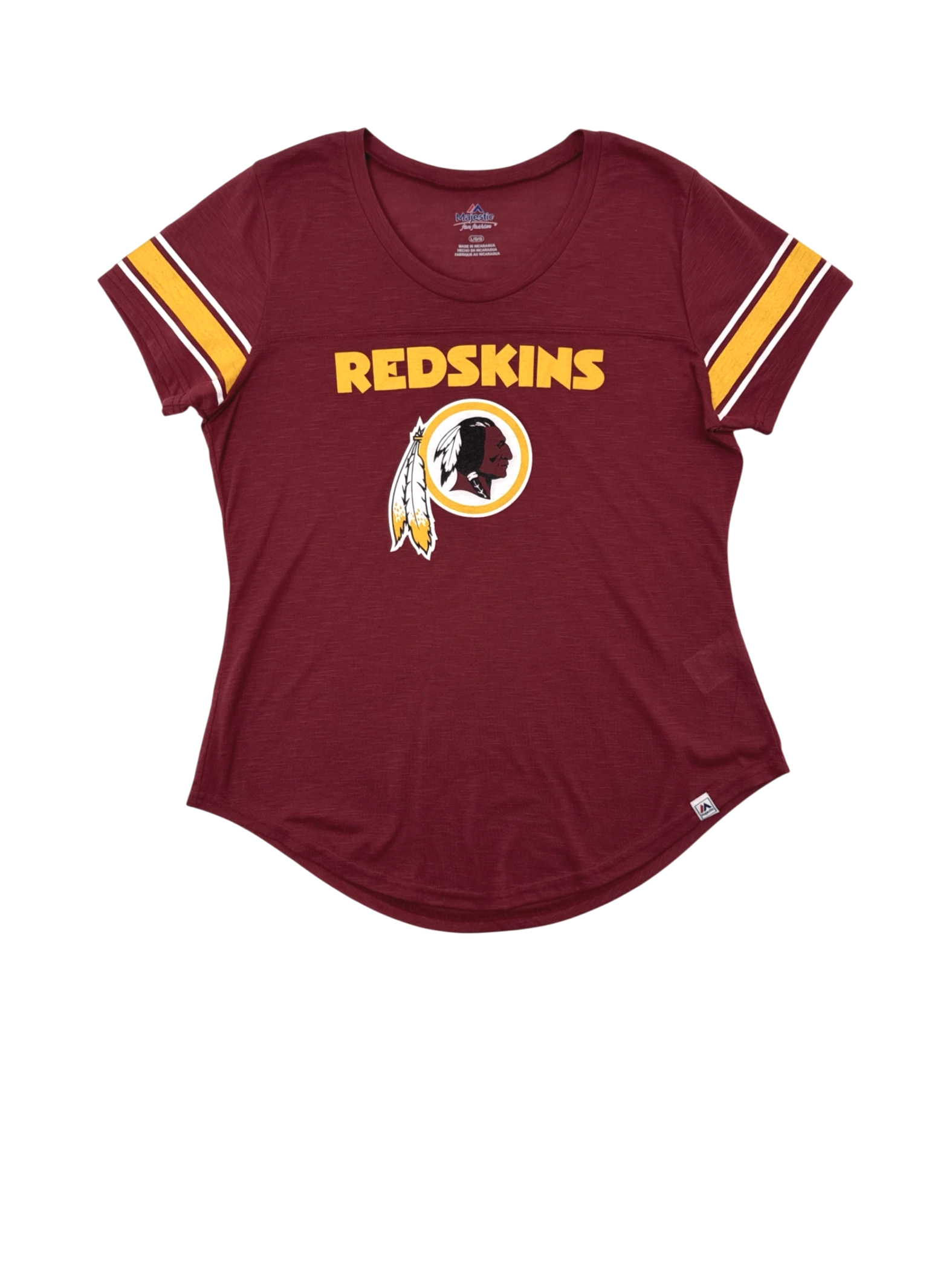Show your team spirit with this pre-owned Majestic Washington Redskins/Commanders women's t-shirt. This stylish tee is perfect for game days or casual wear. Features the Redskins logo and colors, with striped accents on the sleeves. Made from a comfortable polyester blend, this shirt offers a flattering fit. Celebrate your love for the team with this affordable and authentic fan apparel.