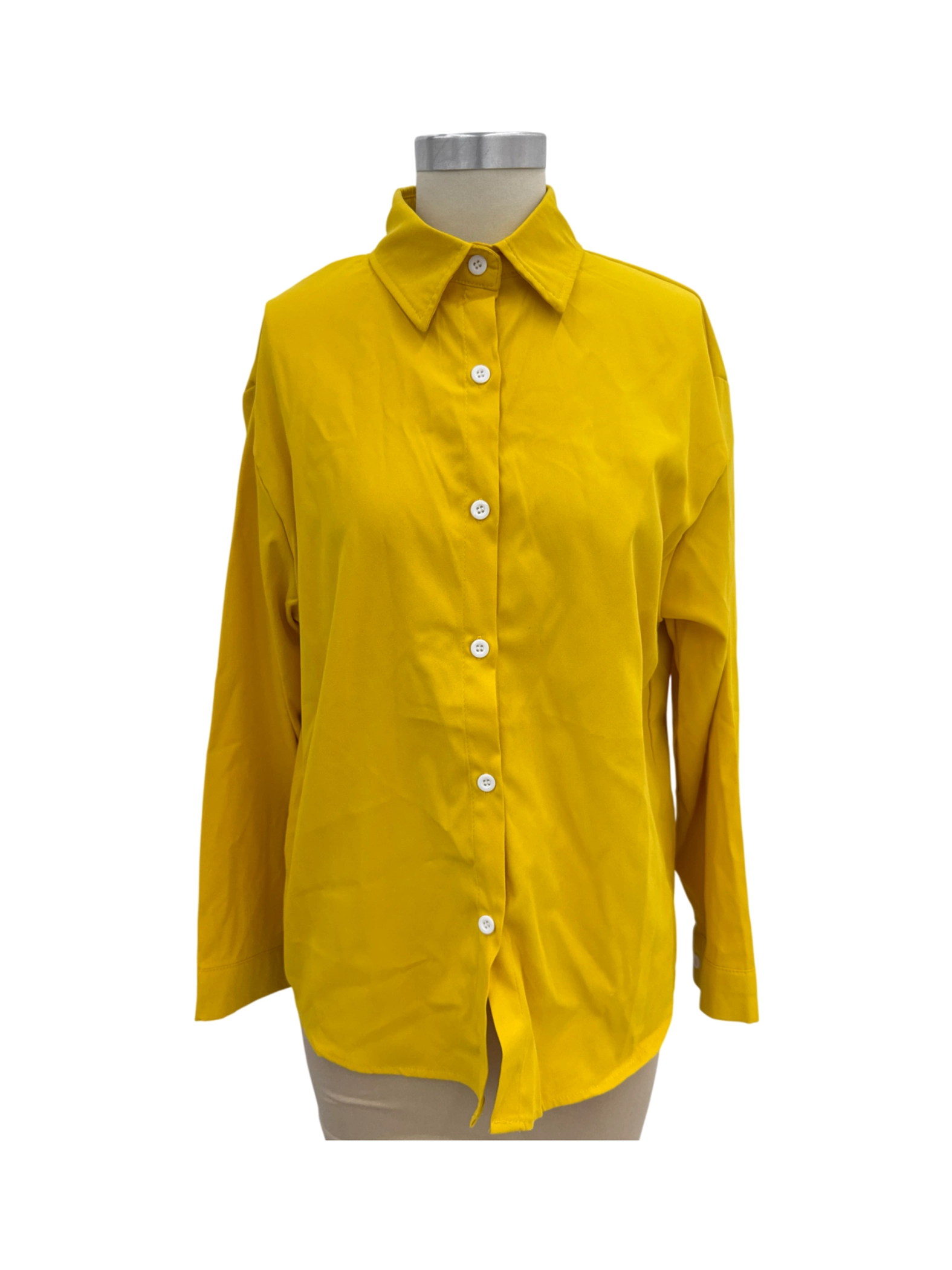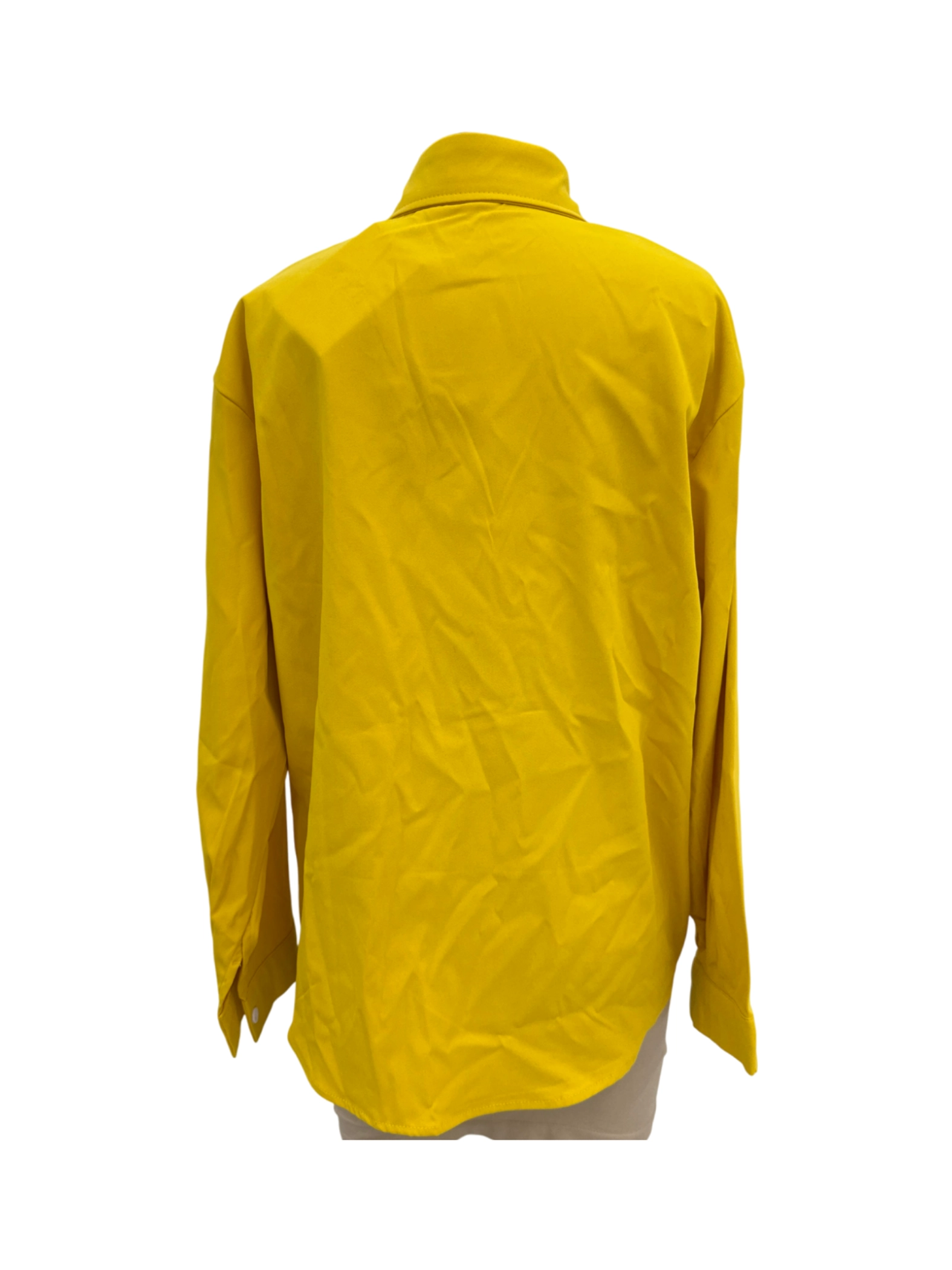 This pre-owned Man Jiang Yue blouse is a vibrant addition to any wardrobe. This bright yellow blouse is crafted from a comfortable polyester and features a classic button-up design. It's the perfect top for a casual day out or can be dressed up for a more polished look. A versatile piece that can be styled in various ways, making it a great find for anyone looking to add a pop of color to their collection.