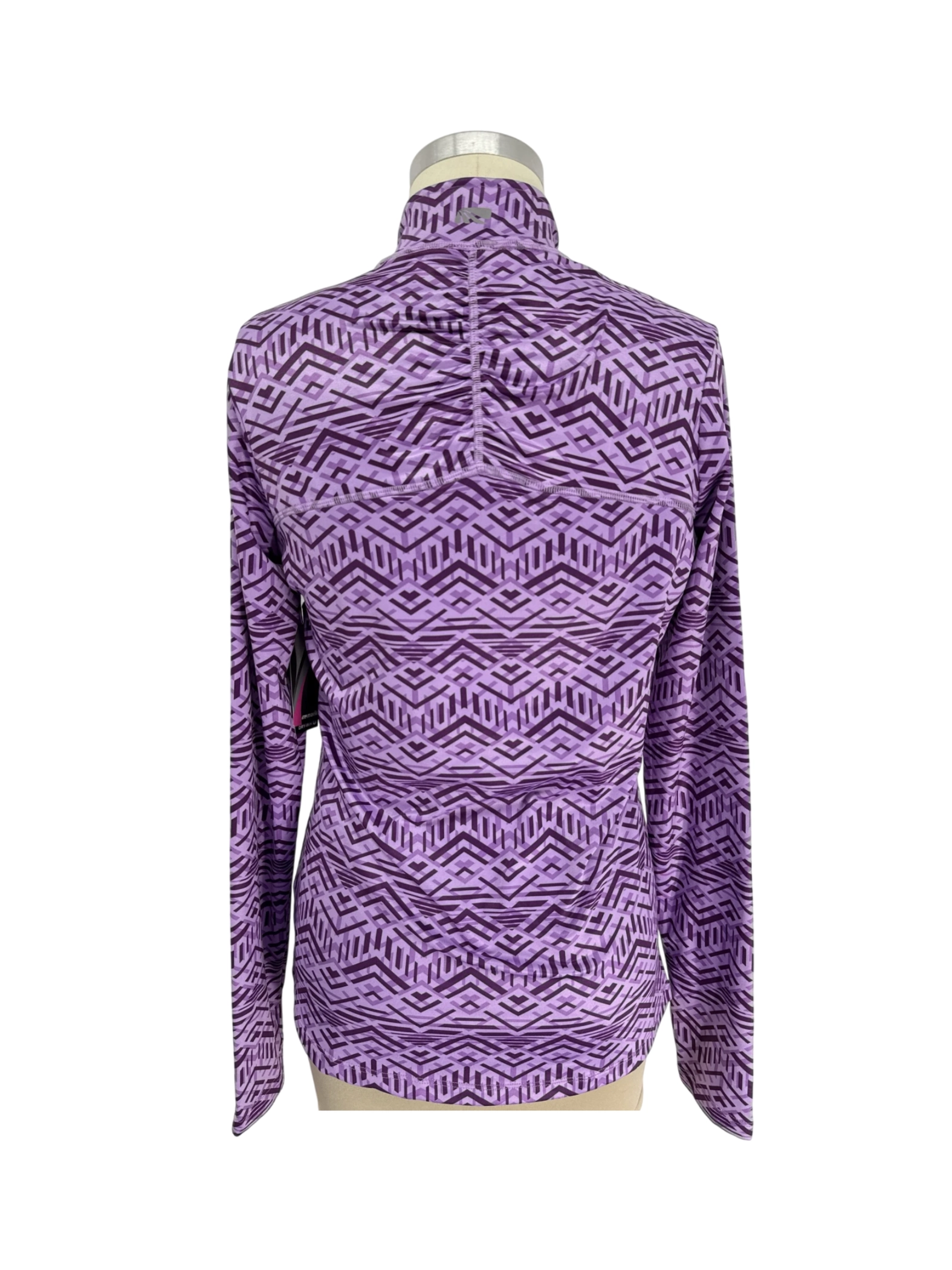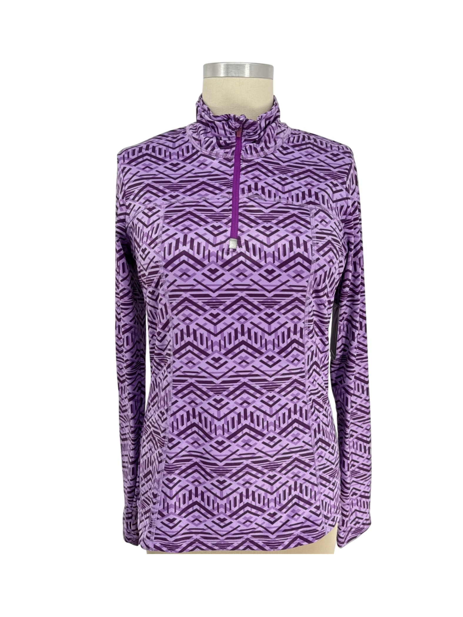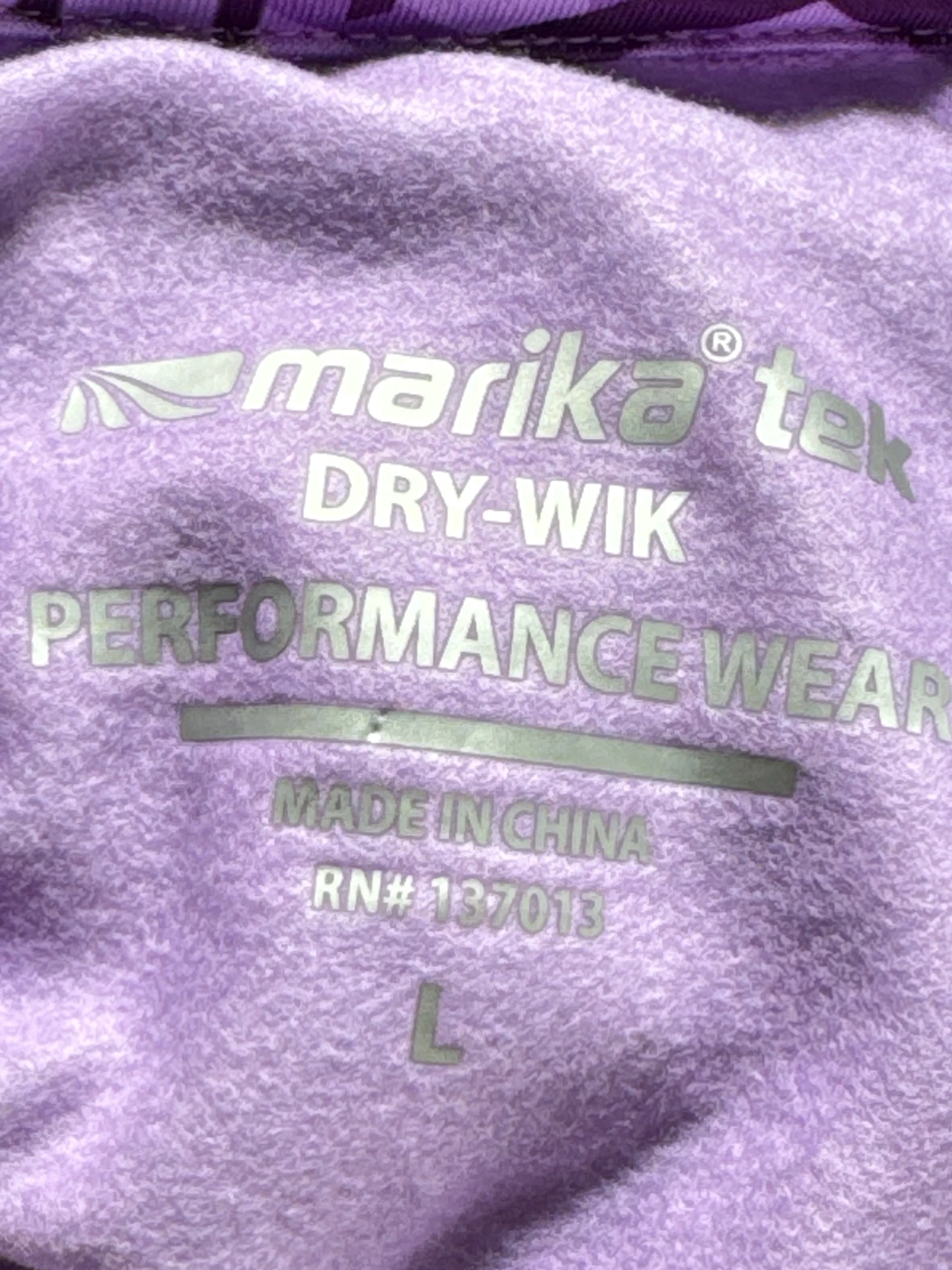 Elevate your activewear collection with this stylish Marika Tek Performance Wear top. Designed for comfort and performance, this long-sleeved top features a vibrant purple geometric pattern and a convenient zip-up collar. Crafted from a blend of polyester and spandex, it offers flexibility and a flattering fit. Perfect for workouts or casual wear. This pre-owned item is in excellent condition, making it a great addition to your wardrobe.