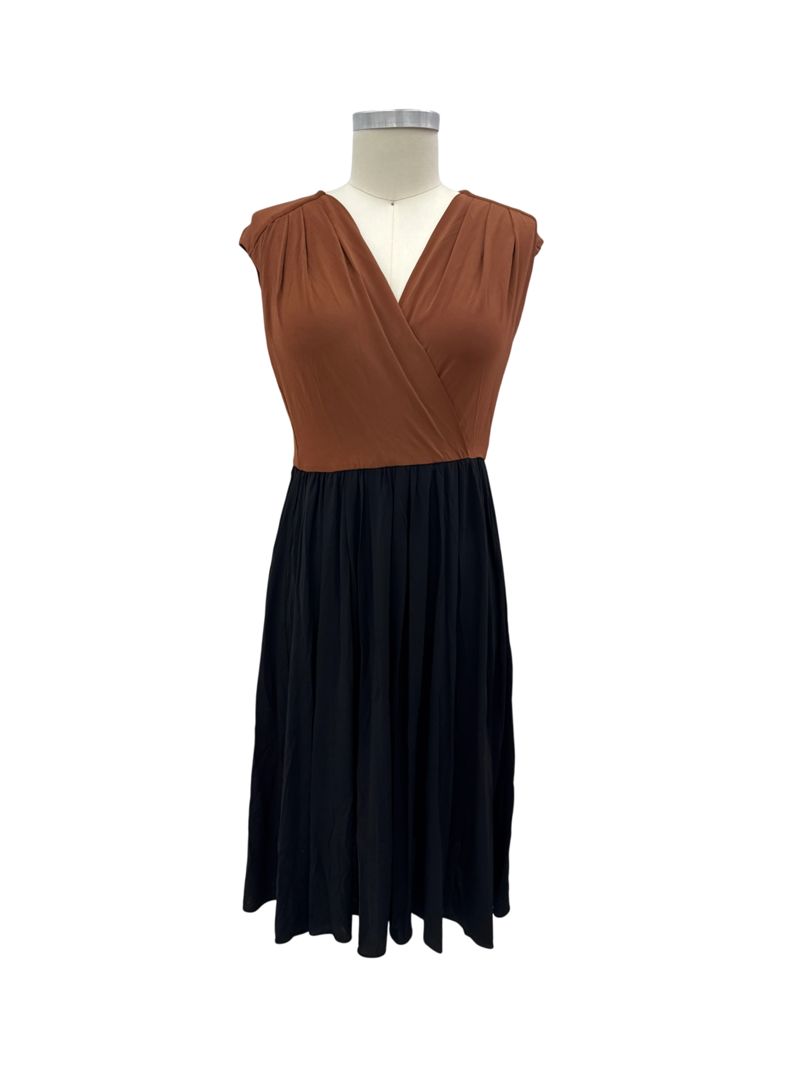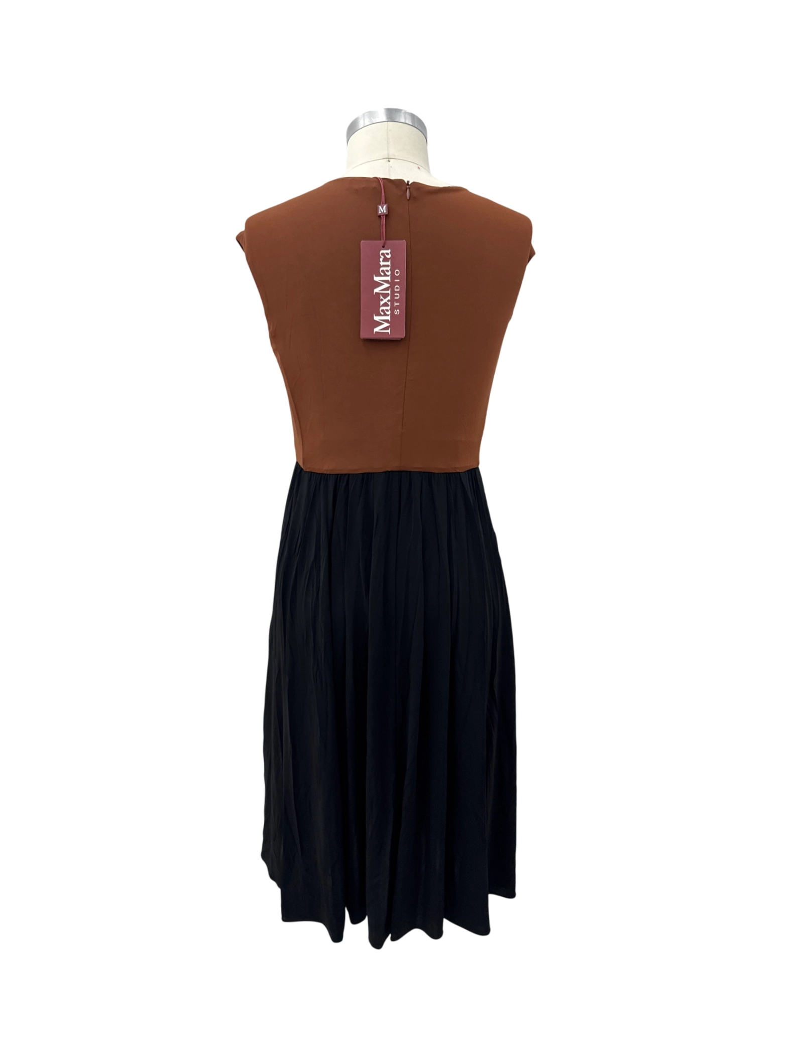 This MaxMara studio dress is a stylish addition to any wardrobe, perfect for spring, summer, and fall. The dress features a flattering A-line silhouette with a V-neck and short sleeves, crafted from a blend of Viscose, Spandex and Nylon. The two-tone design, with a brown bodice and a black skirt, adds a unique touch. Ideal for casual outings or cocktail parties, this pre-owned dress is in excellent condition. Elevate your style with this elegant and versatile dress from MaxMara.