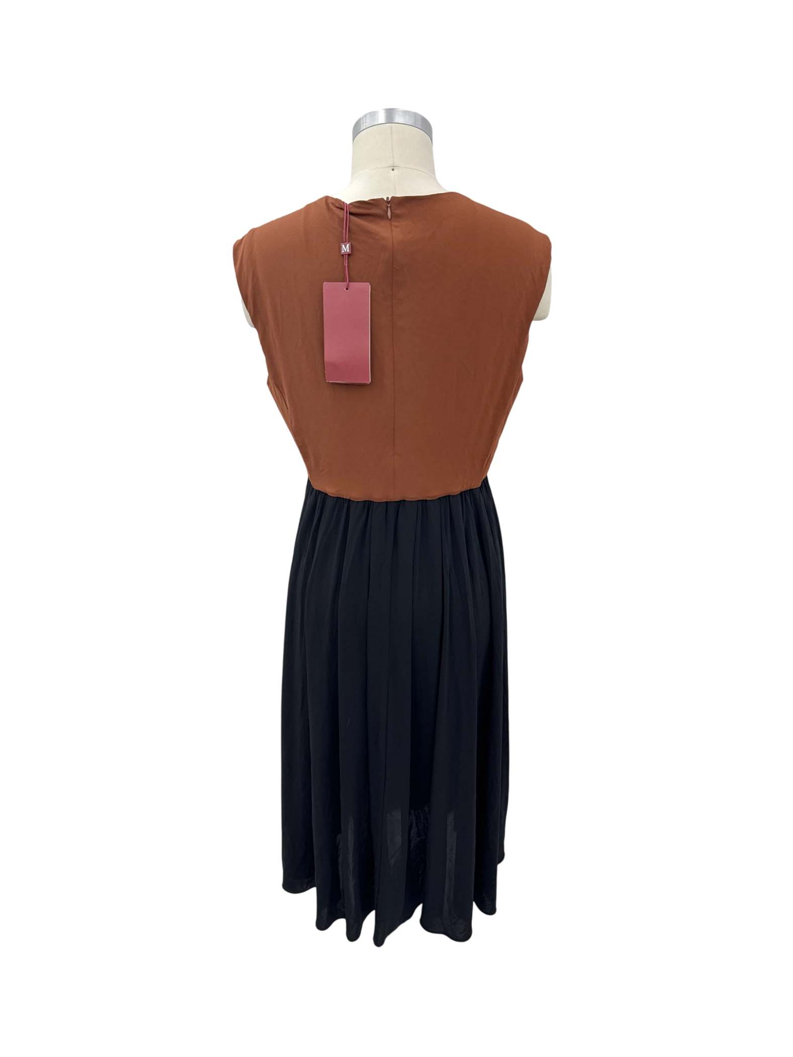 This elegant MaxMara Studio dress combines sophistication with comfort. It features a flattering A-line silhouette, sleeveless design, and a classic V-neck. The dress showcases a stylish color-block design with a brown bodice and a black skirt. Crafted from a blend of viscose, polyester, elastane, and polyamide, it offers a comfortable and flowing fit perfect for casual outings or special occasions. This piece is a testament to timeless Italian design and craftsmanship.