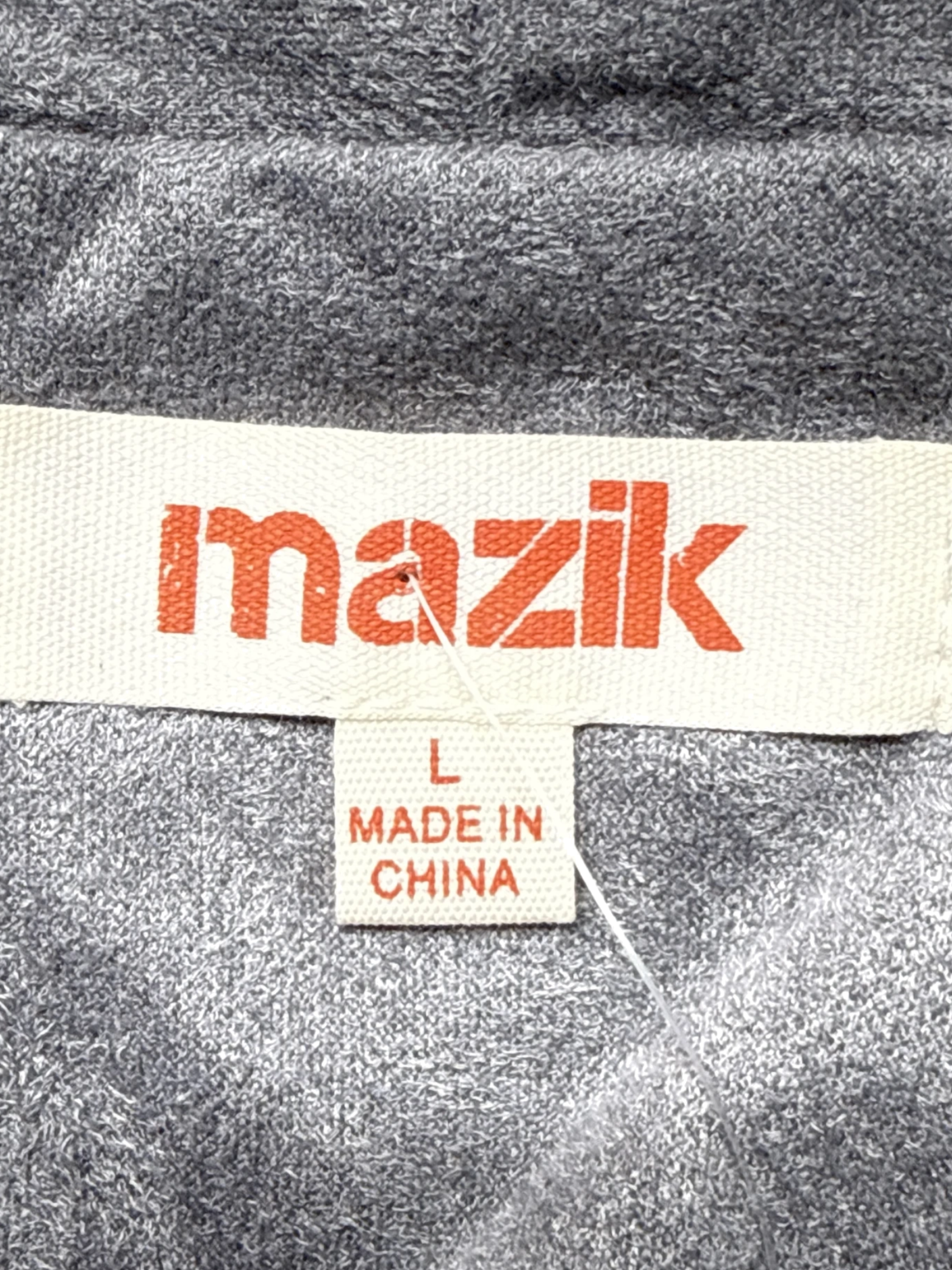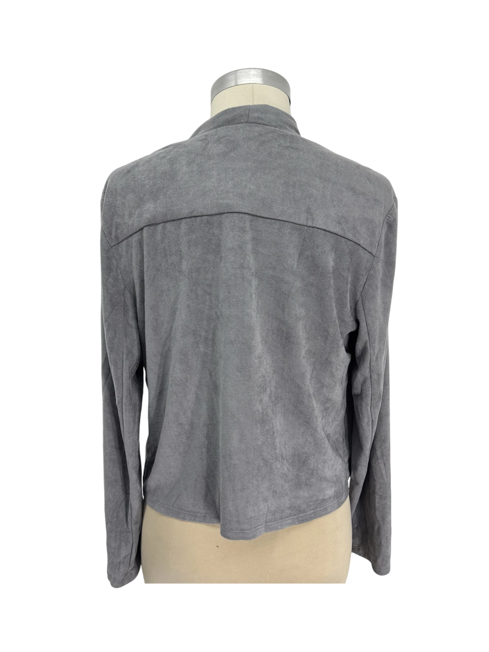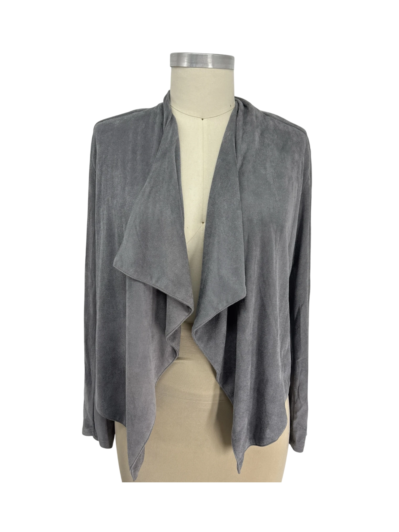 This mazik women's cardigan is a stylish and versatile addition to your wardrobe. Featuring a soft gray color and a flattering draped design, it's perfect for layering. Made from a comfortable blend of polyester and spandex, this cardigan is both comfortable and easy to care for. A pre-owned item in excellent condition, it is a great value for its quality and design. Perfect for casual or dressy looks.